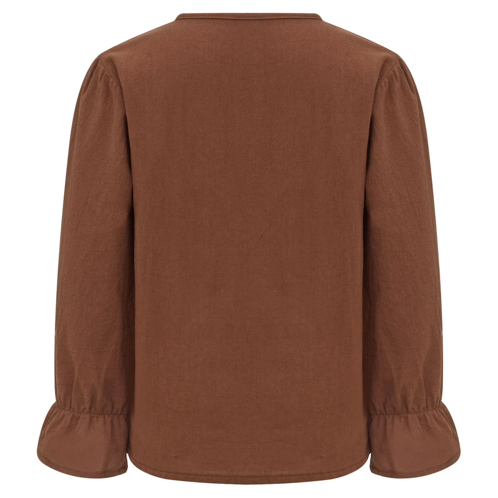 Diseñado con color sólido, cuello en V con correas, manga larga, manga de linterna con puño elástico con volantes.