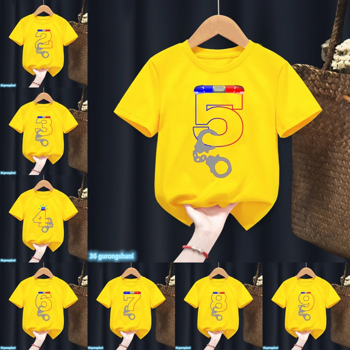 Comprar Camiseta divertida con número de sirena de coche de policía para niños y niñas, camiseta con número 2-9, regalo de feliz cumpleaños, regalo de fiesta, ropa para niños, Top AMARILLO