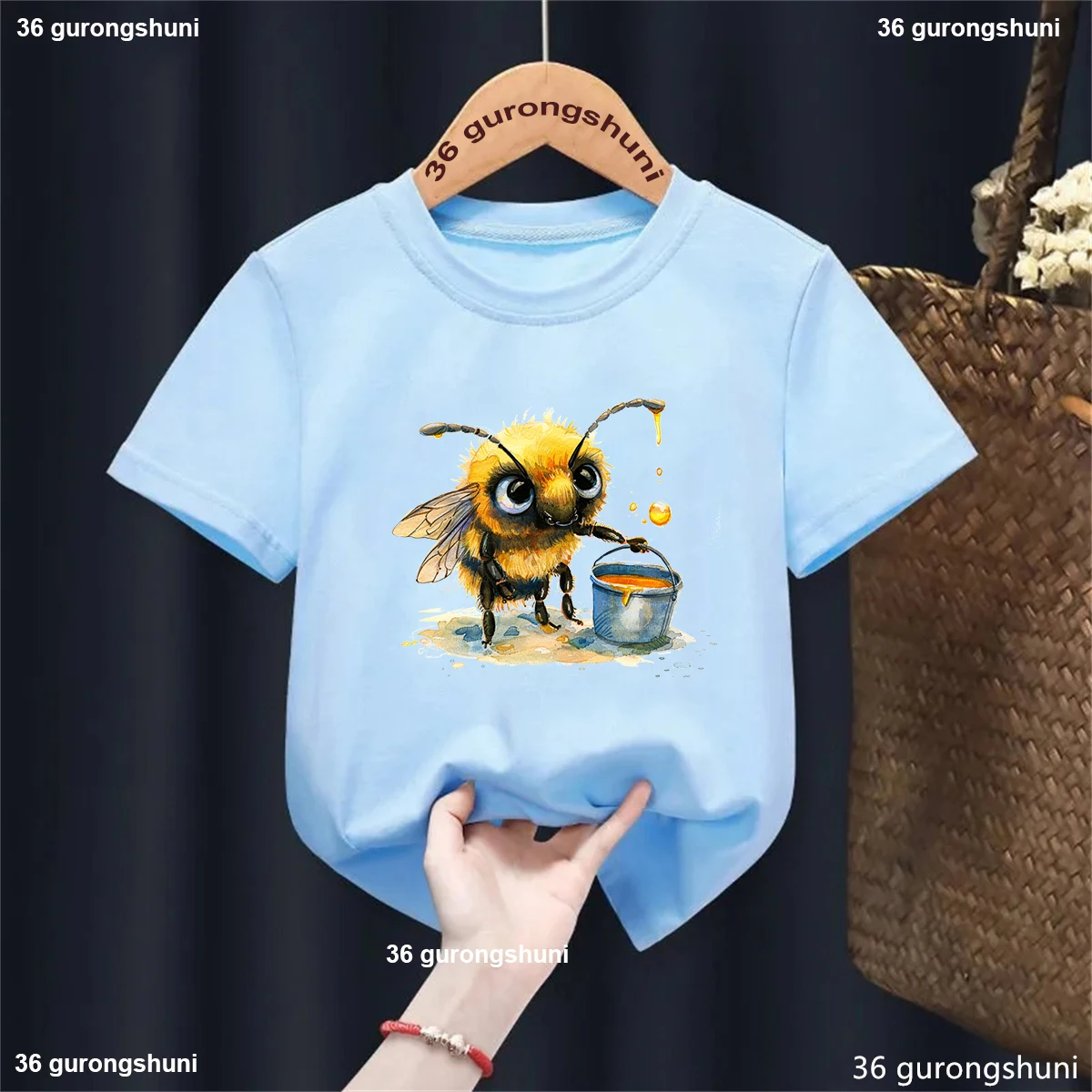 Comprar Camiseta con estampado de abeja de acuarela para niños y niñas, ropa Kawaii, Tops de moda de verano, camiseta blanca, amarilla y azul