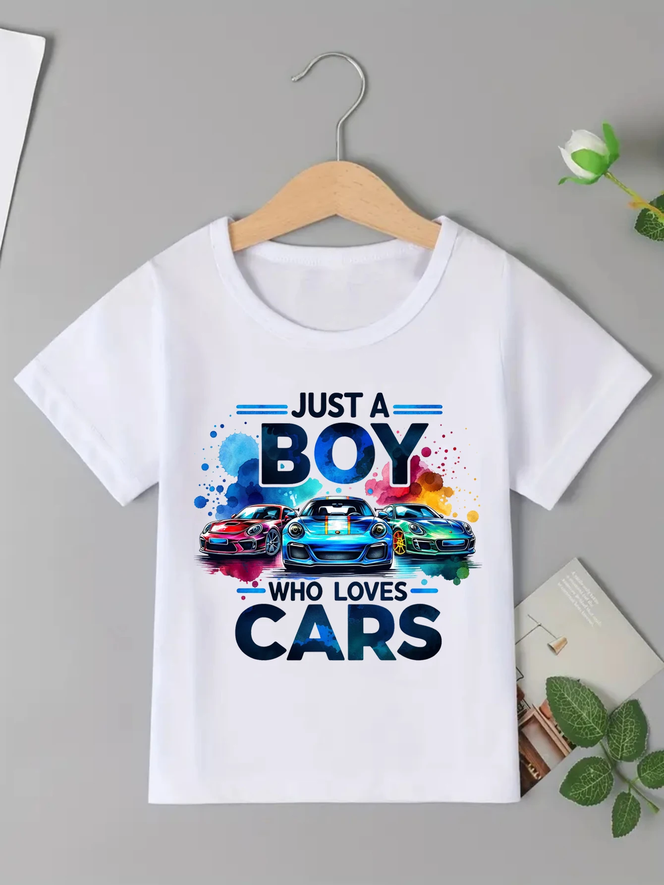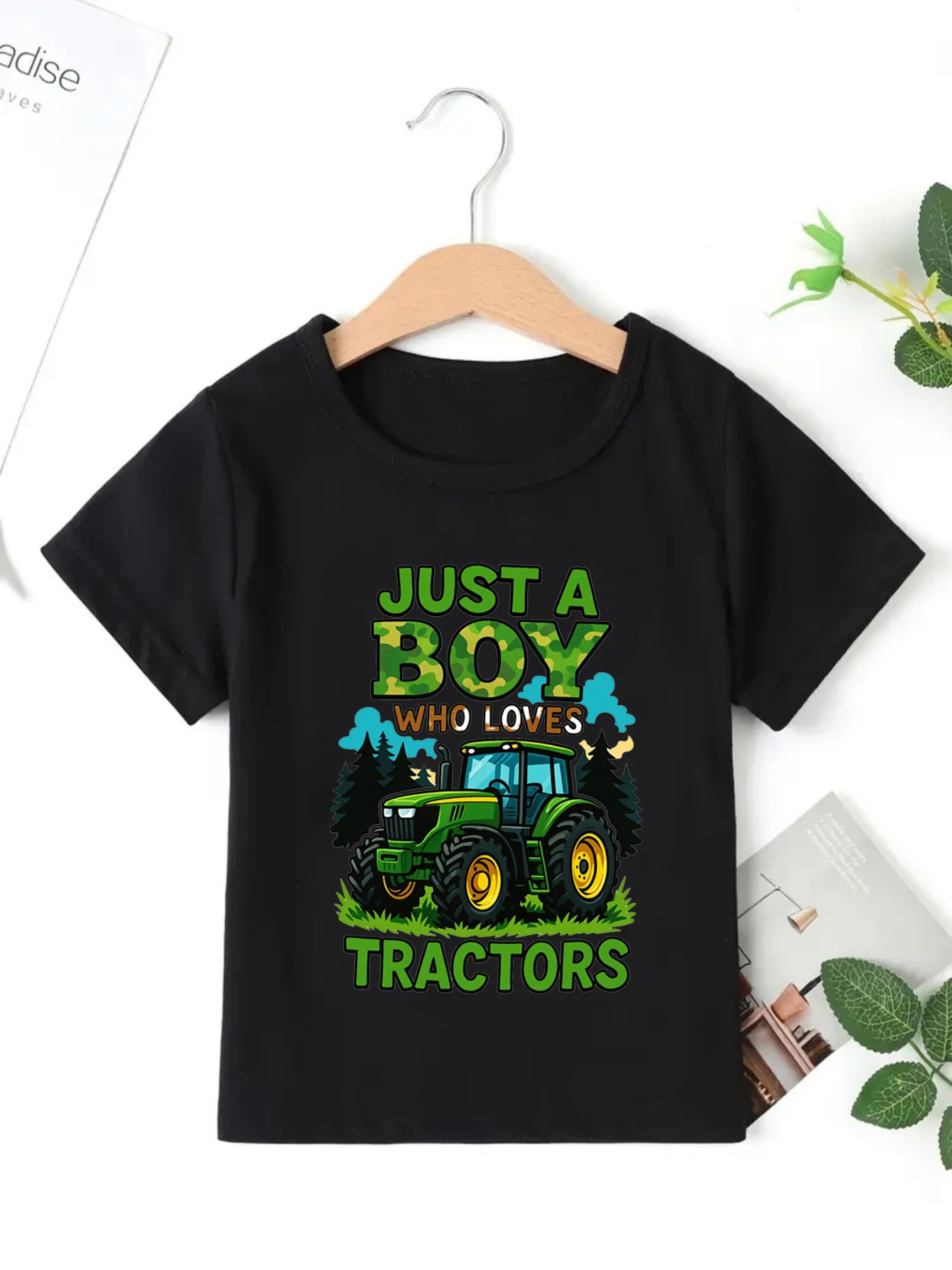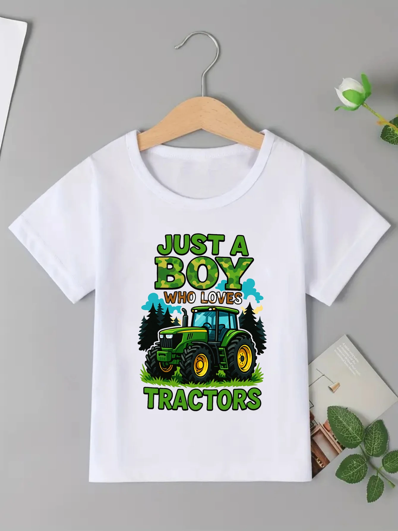 Camiseta con estampado con dibujo de Just A Boy Who Loves Tractors, árboles, pastizales, ropa divertida y fresca para niños, camiseta de manga corta de verano