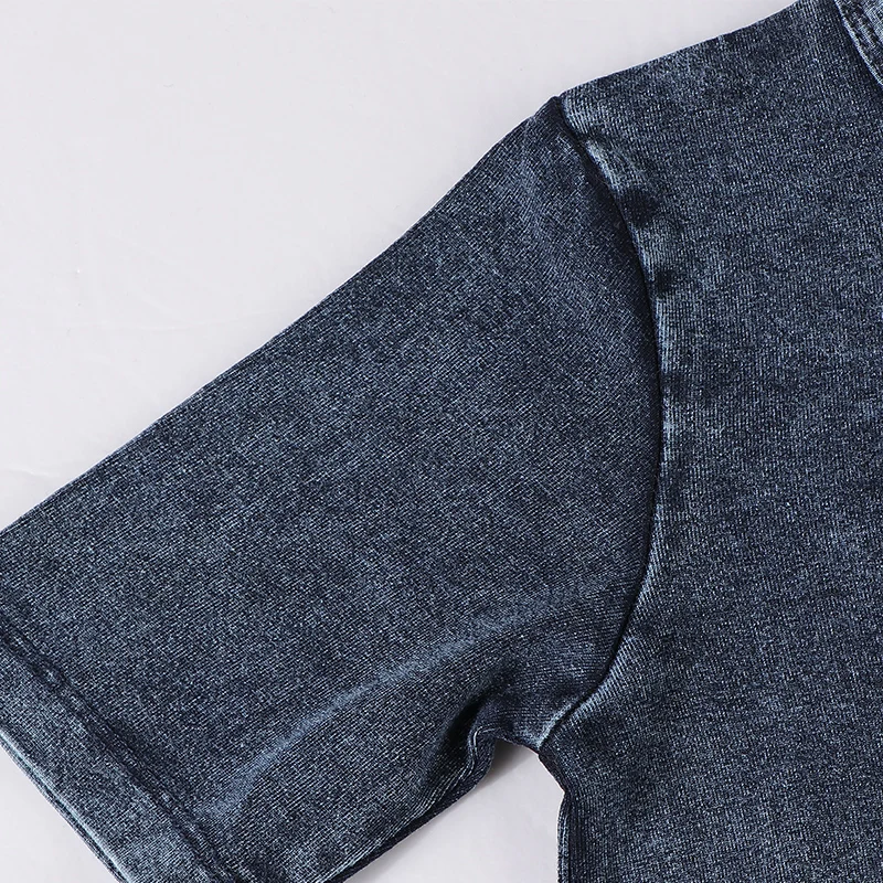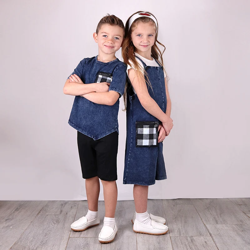 2022 camiseta superior para niños, ropa de manga corta de verano, ropa para niños y niñas, camiseta irregular azul denim, bolsillo negro con cremallera