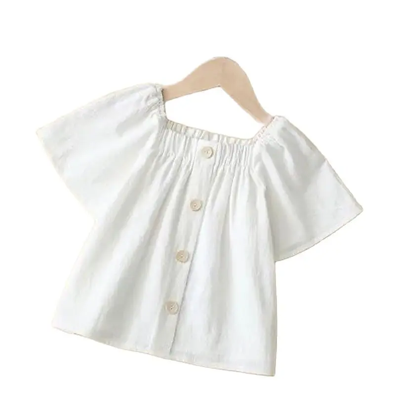 Comprar Camiseta de manga corta de verano para niñas, Top fino de manga corta de lino y algodón para niños de talla mediana y grande a la moda con mangas abullonadas para bebés