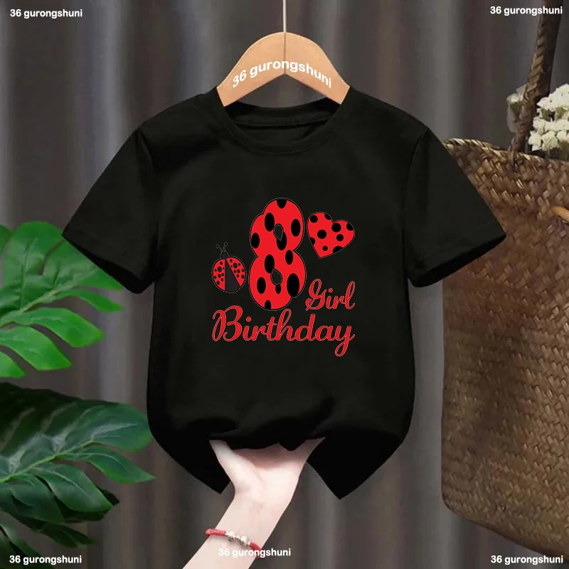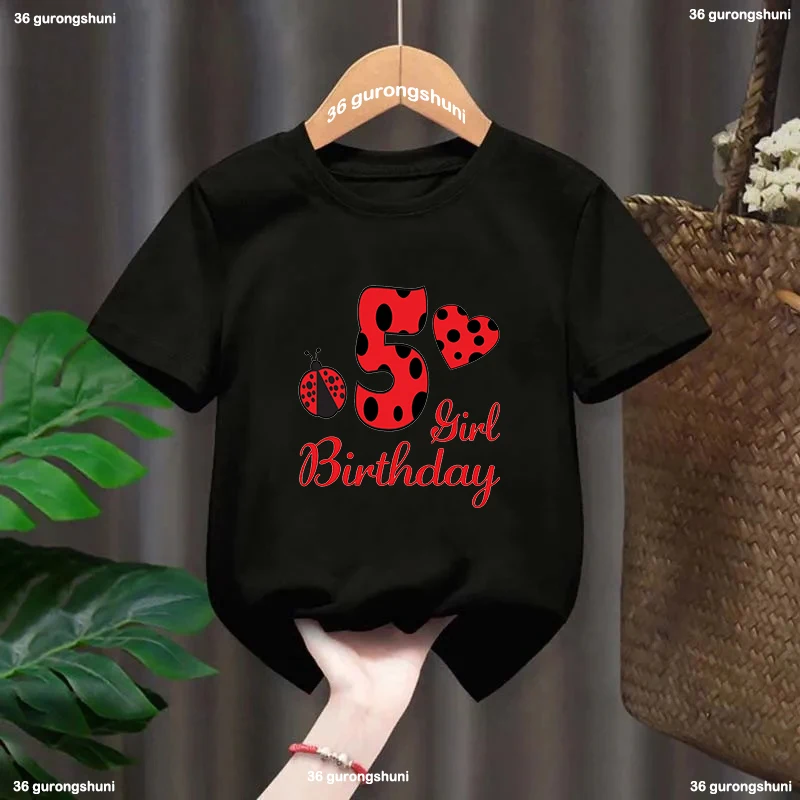 Camiseta negra de mariquita roja para niños y niñas, camiseta con número 1-10, regalo de feliz cumpleaños, ropa Harajuku para niños, camiseta de manga corta