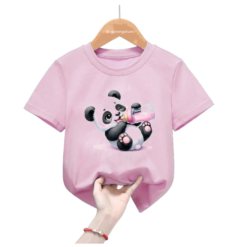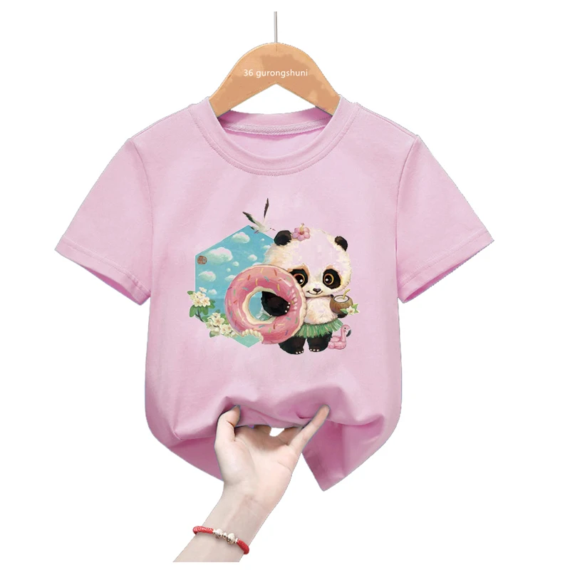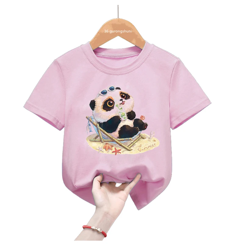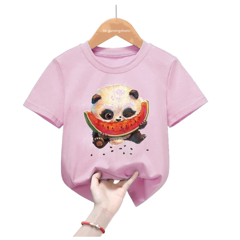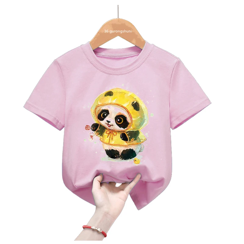 Camiseta rosa de Panda arcoíris para niñas, ropa Kawaii Harajuku para niños, Tops de moda de verano, camiseta divertida