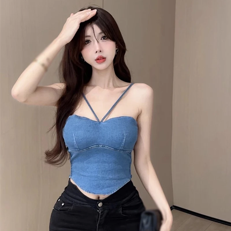 Comprar Camiseta sin mangas de vaquero para mujer, Top corto acolchado Irregular con Espalda descubierta, color sólido, Verano