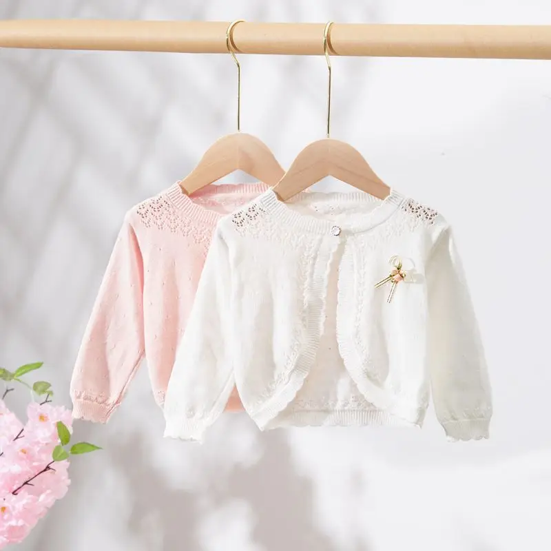 Comprar Cárdigan de punto hueco para niños, camisa de aire acondicionado con volantes, abrigo fino para bebé, Simple, dulce, Color sólido, Verano