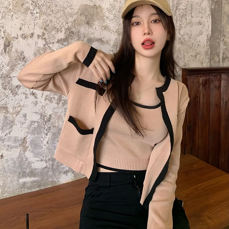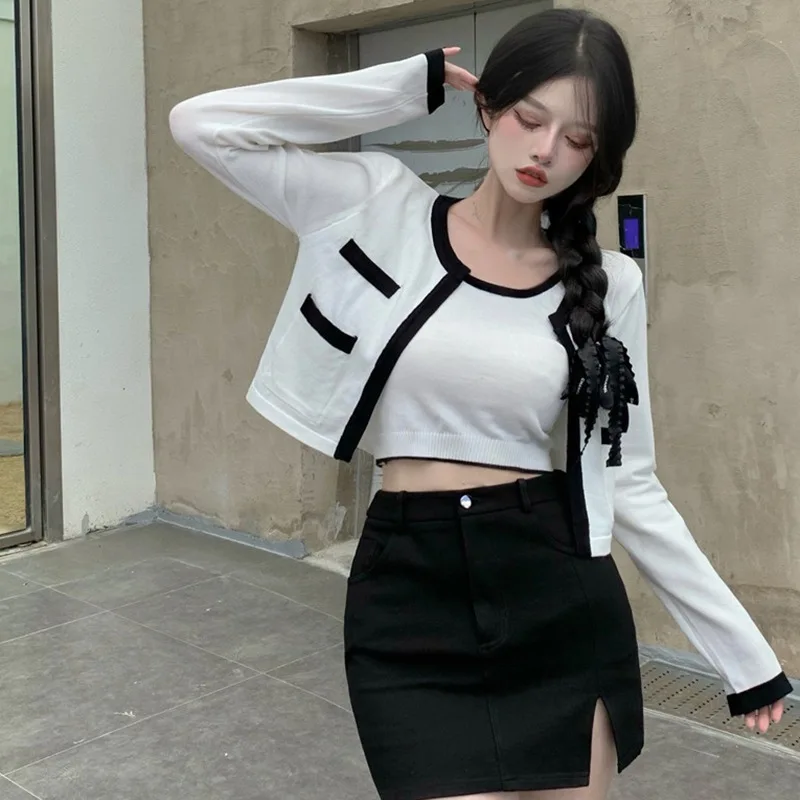 Comprar Cárdigan Vintage de manga larga para mujer, cuello redondo, cintura alta, ombligo de punto, elástico corto, ajustado, camisa Base de verano, tendencia