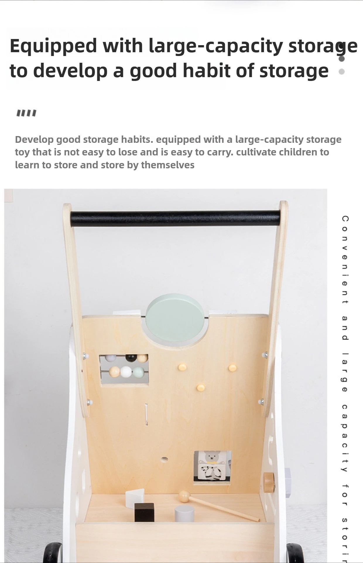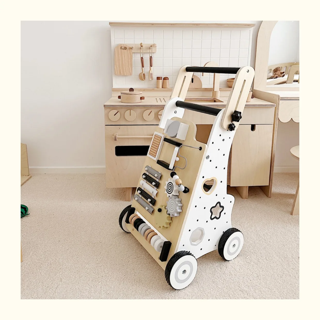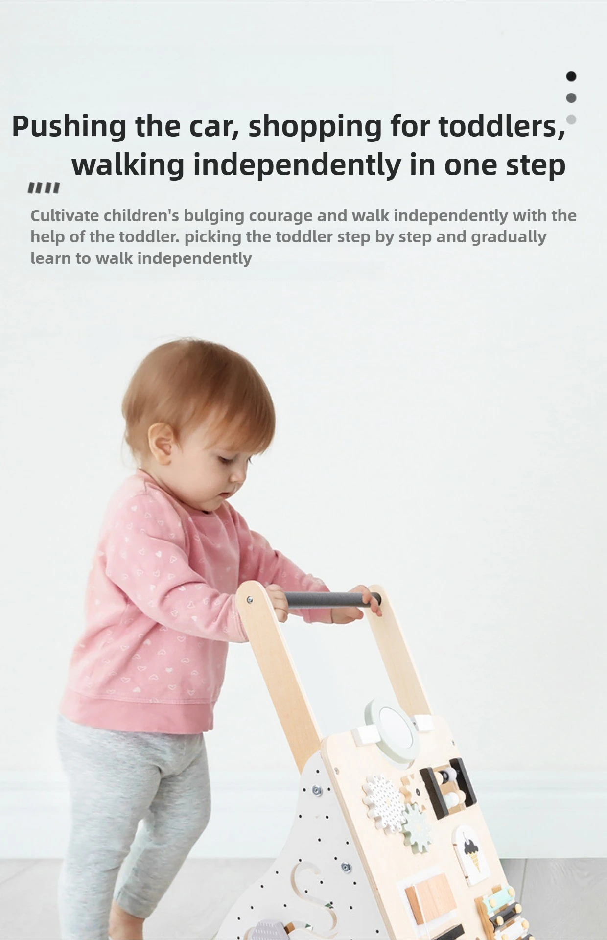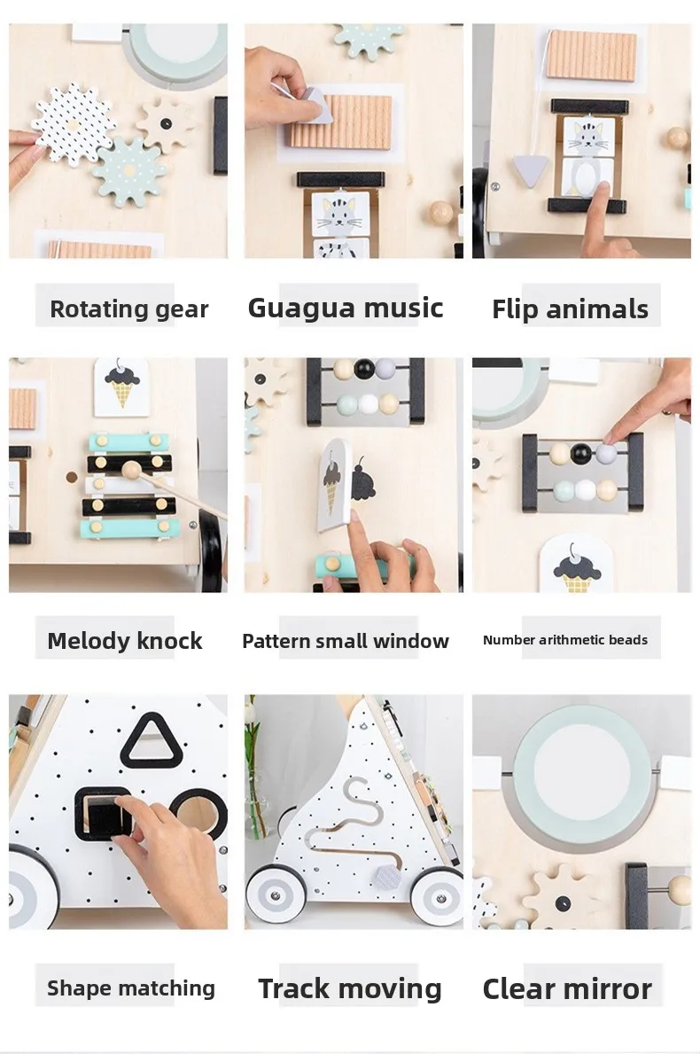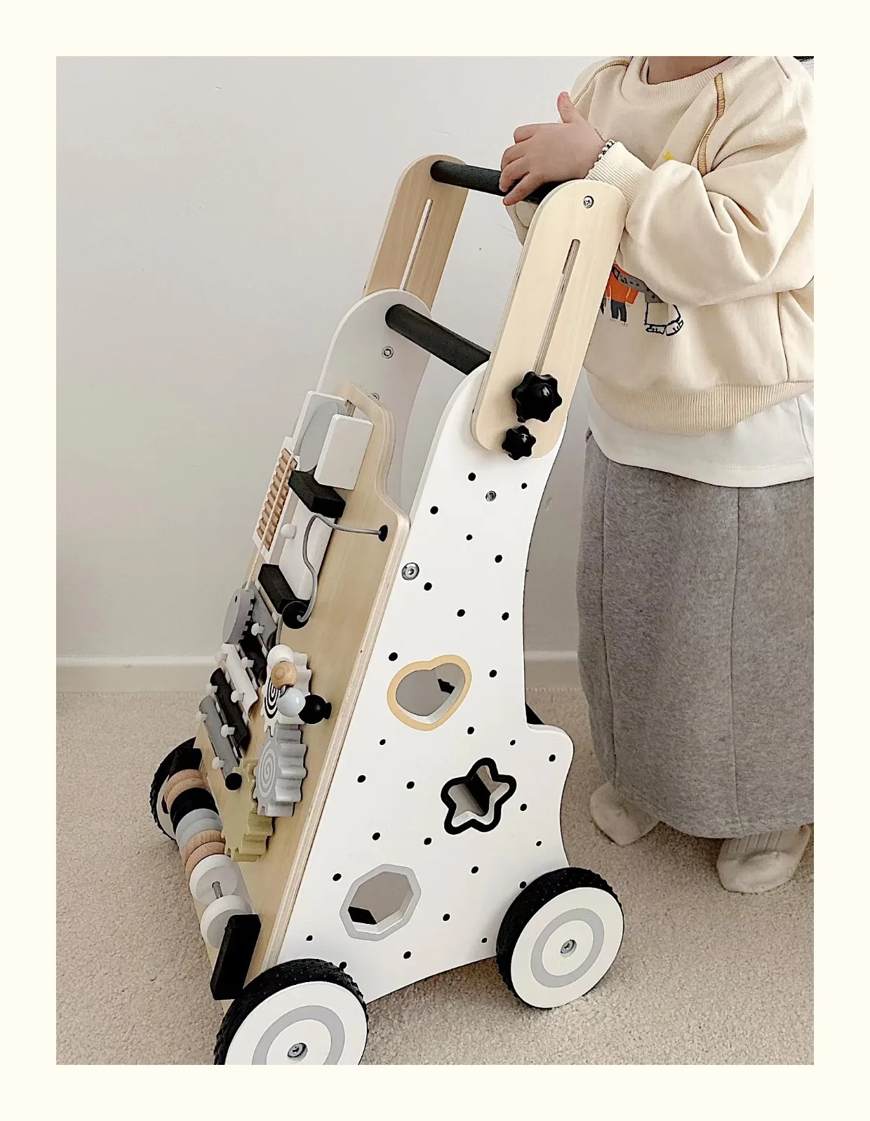 Carro de andador de madera para bebés, diseño de pierna antivuelco y en forma de O, juguete para caminar de aprendizaje multifuncional ajustable para niños pequeños