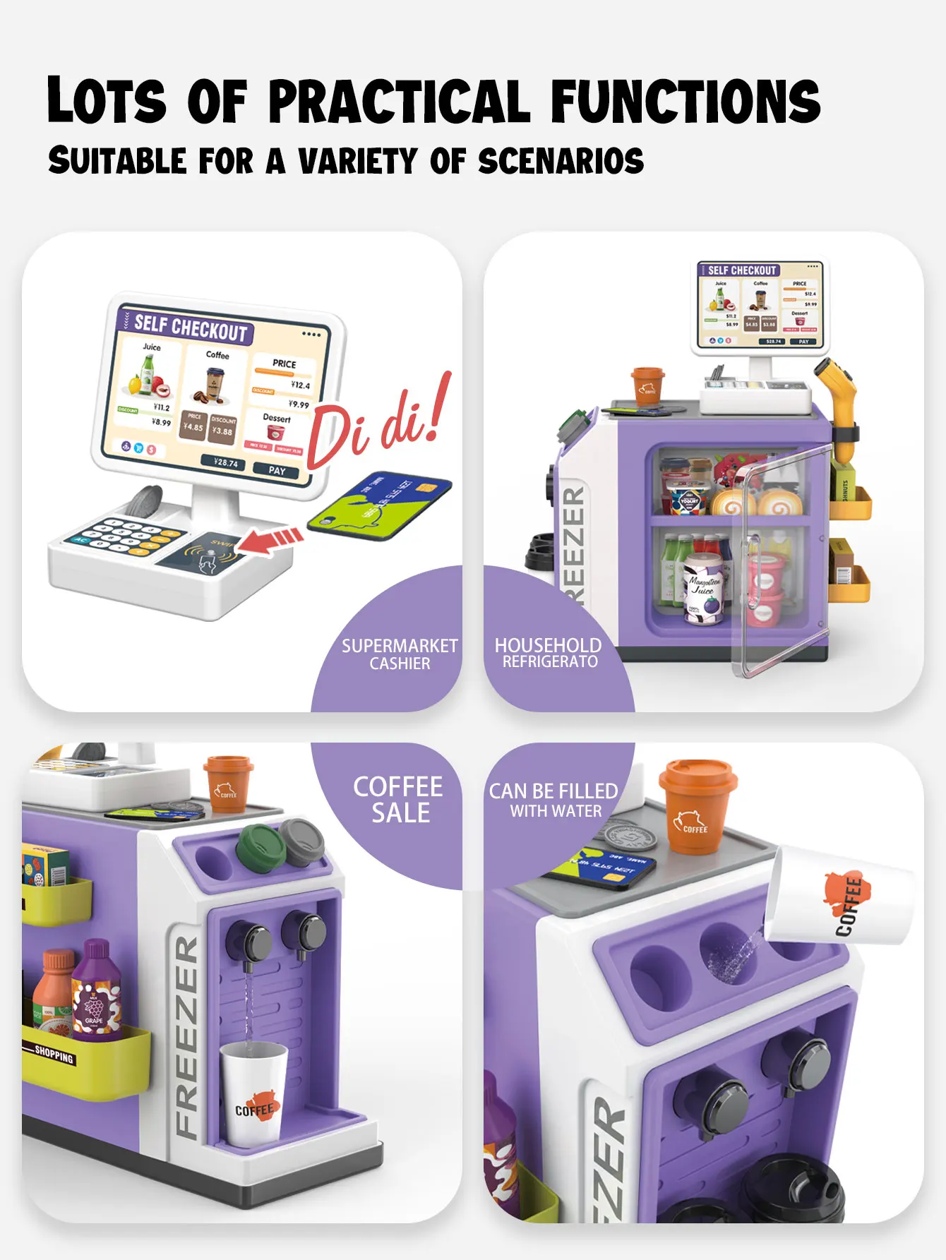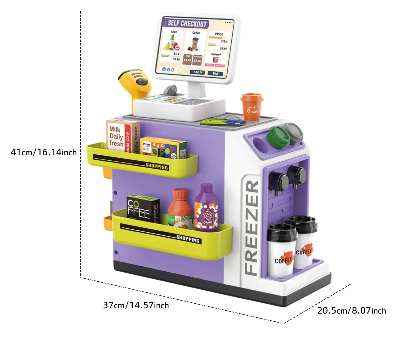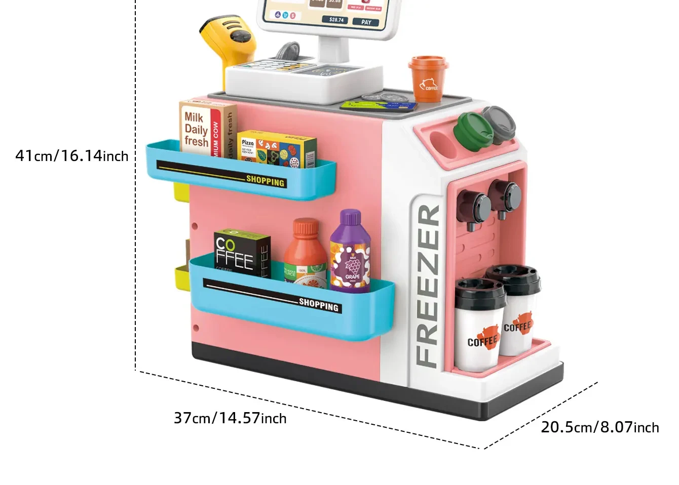 2.Juego completo: el cajero Pretend Play Store cuenta con 46 accesorios que integra funciones de cafetera, caja registradora y refrigerador.Equipado con luces y efectos de sonido, satisface plenamente el deseo de los niños de una experiencia de juego realista en cajero.