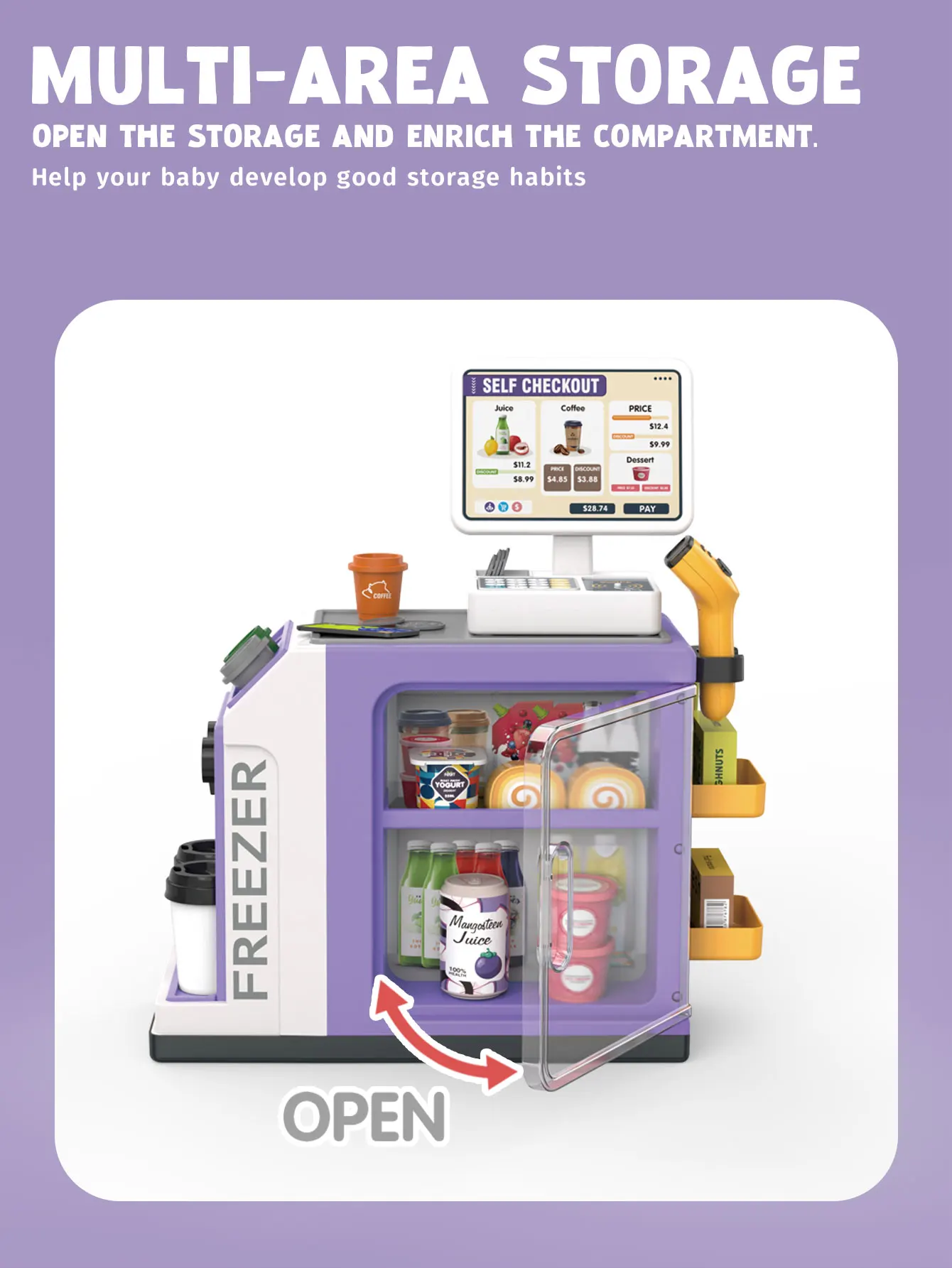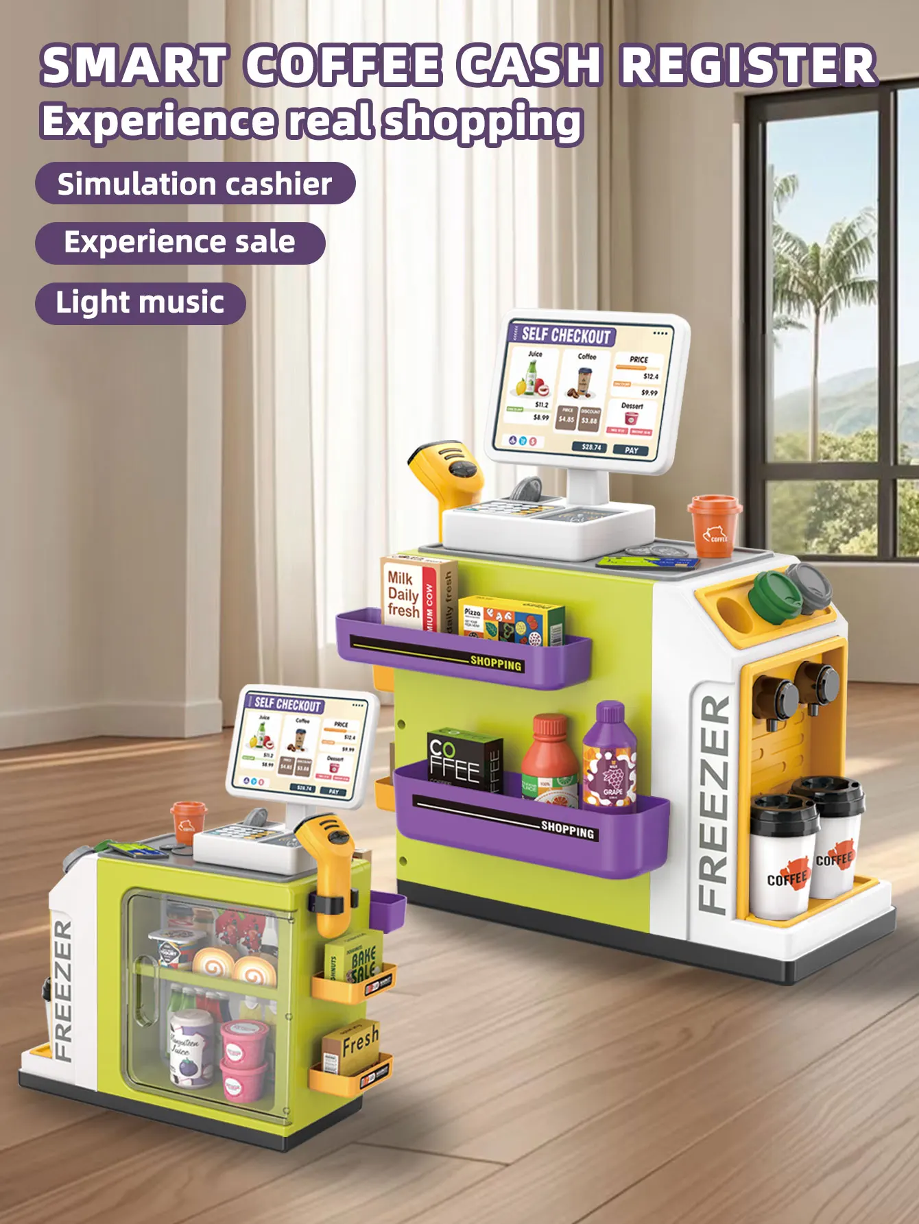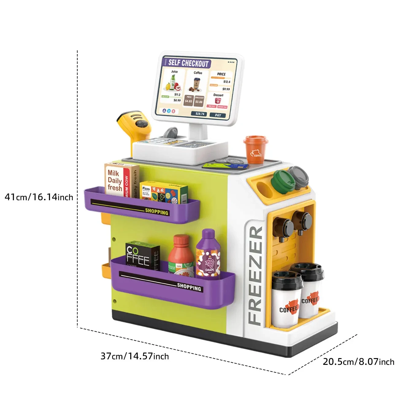 2.Juego completo: el cajero Pretend Play Store cuenta con 46 accesorios que integra funciones de cafetera, caja registradora y refrigerador.Equipado con luces y efectos de sonido, satisface plenamente el deseo de los niños de una experiencia de juego realista en cajero.