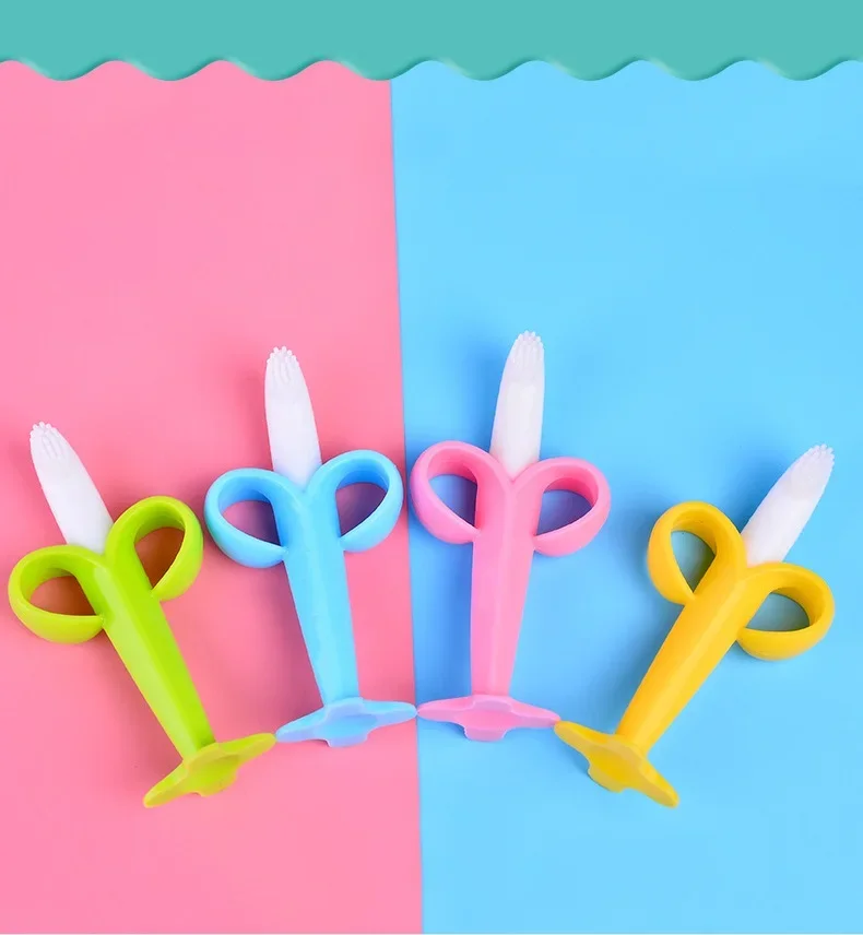 Comprar Cepillo de dientes con forma de plátano para niños, mordedor para niños pequeños, cepillo de dientes de entrenamiento de silicona, sin BPA, masticar para la dentición, cuidado Dental del bebé