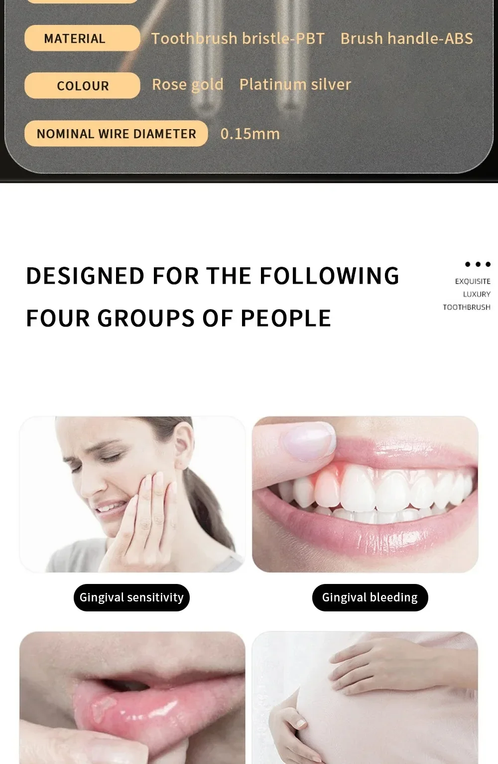 Aplicación: Diseñado para 4 tipos de personas: Dientes sensibles , encías sangrantes , Problemas bucales , mujeres embarazadas