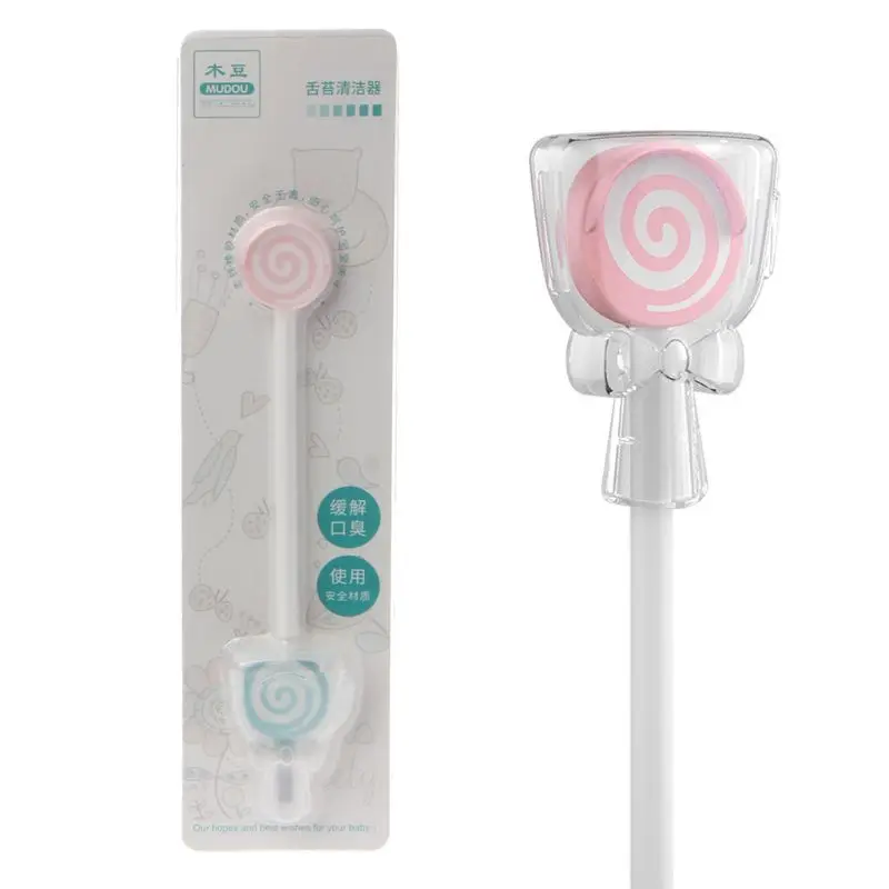 Es limpiador de lengua.El colorido diseño de piruleta está compuesto de caucho TPR+PP (mango), que es suave y liso.