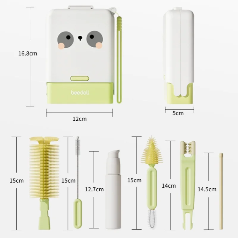 Lista de productos: cepillo de botella, cepillo de tapa de taza, cepillo de chupete, barra de palanca, cepillo de espacio, cepillo de paja, estante de drenaje * 4, botella dispensadora de detergente de 30ML, base de almacenamiento vertical, caja de almacenamiento con asa