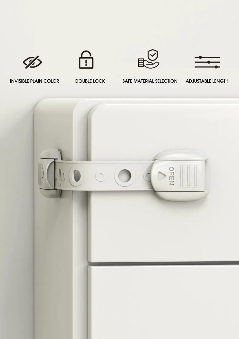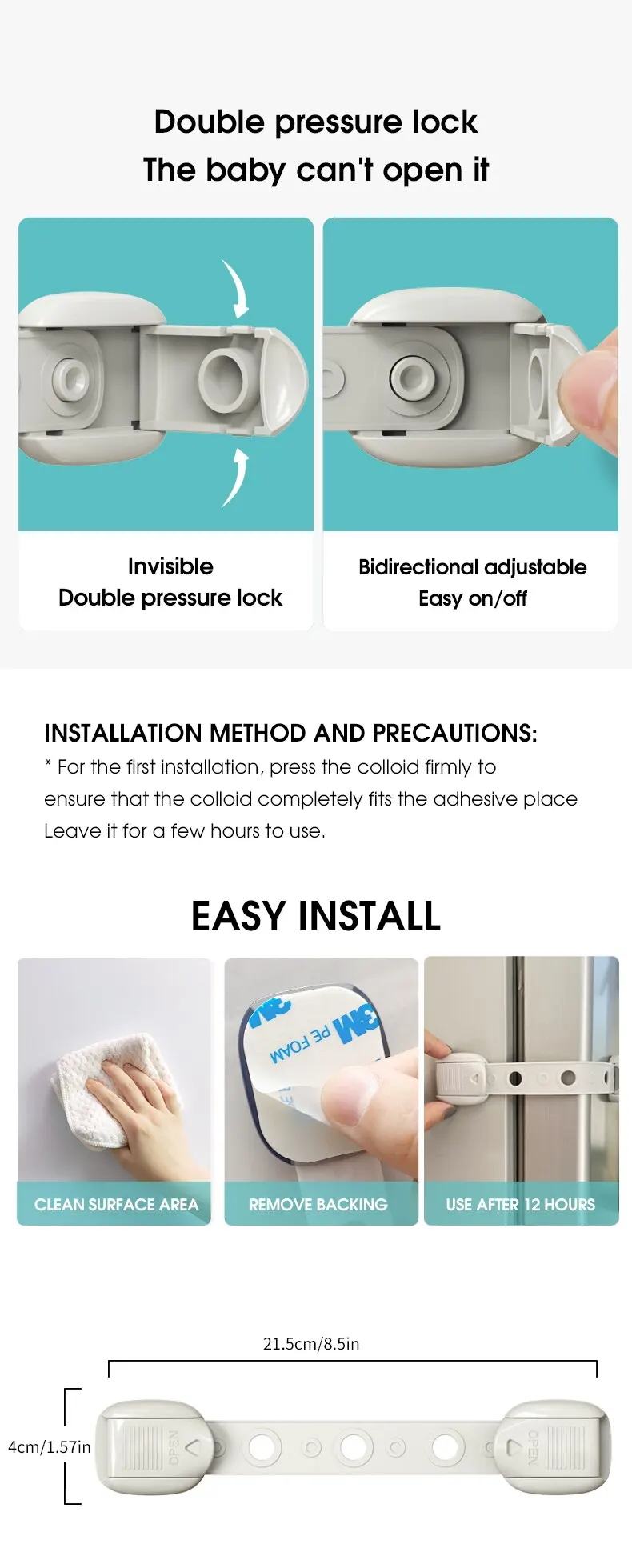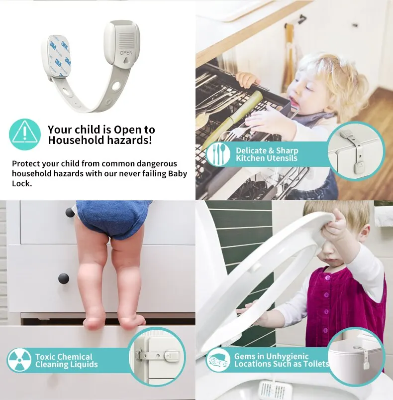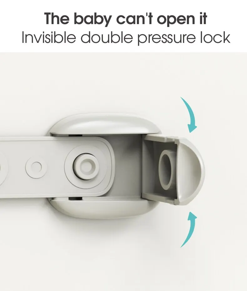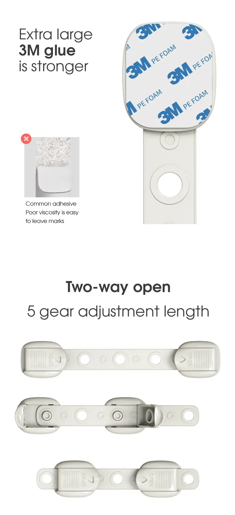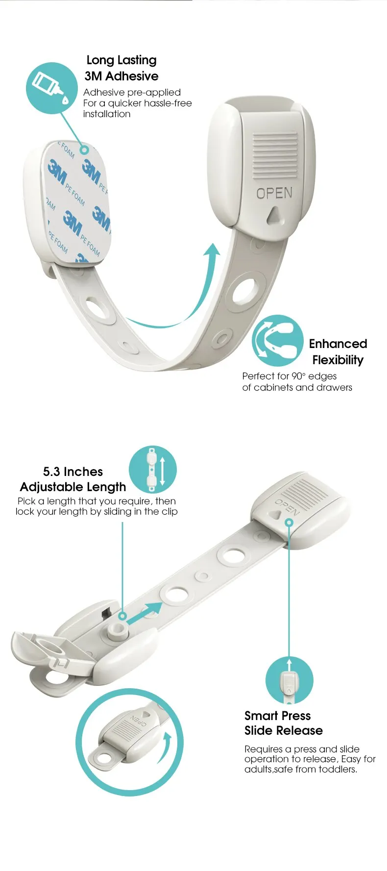 BLOQUES MÚLTIPLES A PRUEBA DE NIÑOS: No debería ser difícil vivir en un hogar seguro.Nuestras cómodas y fáciles de usar cerraduras de correa son compatibles con todo tipo de armarios, cajones, inodoros y refrigeradores congeladores.Funcionan tan bien que puedes usarlos en tu cocina, baño, cuarto de lavado y más.