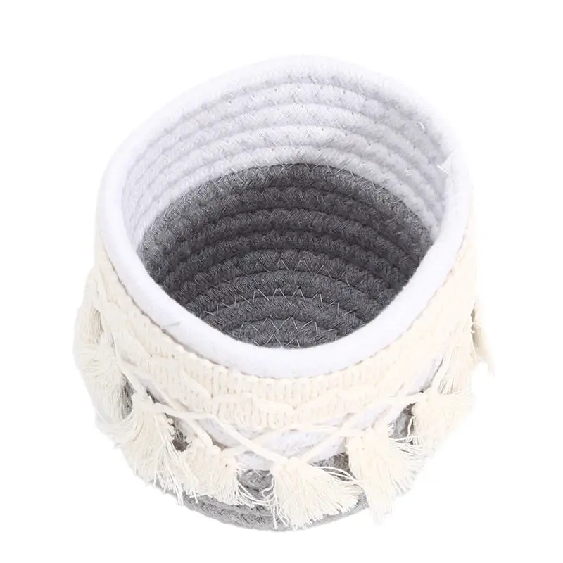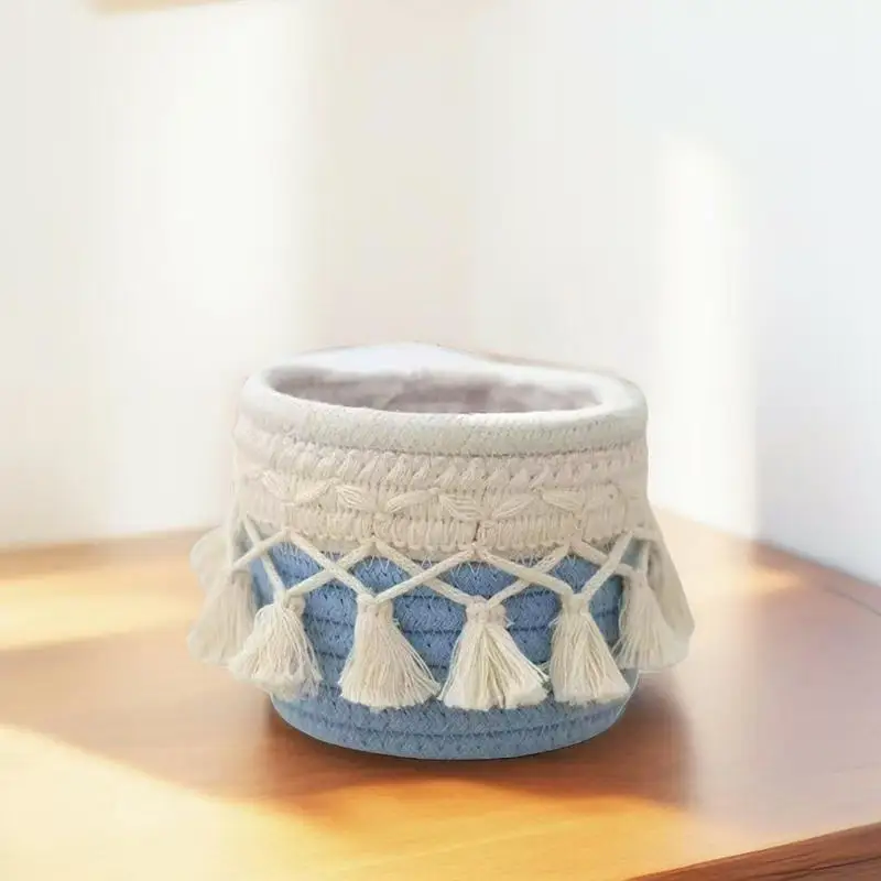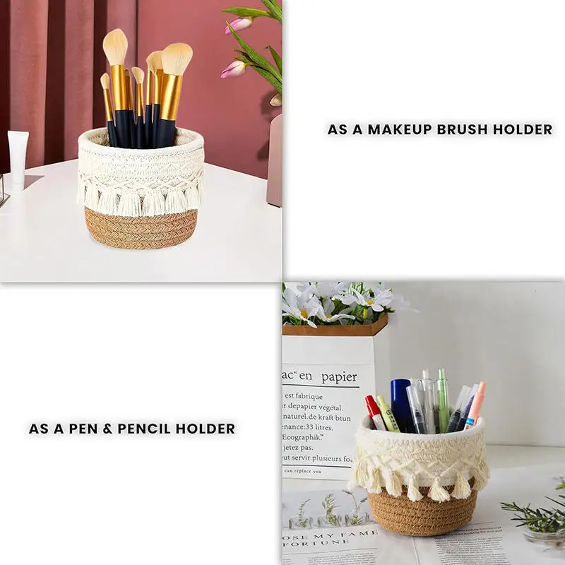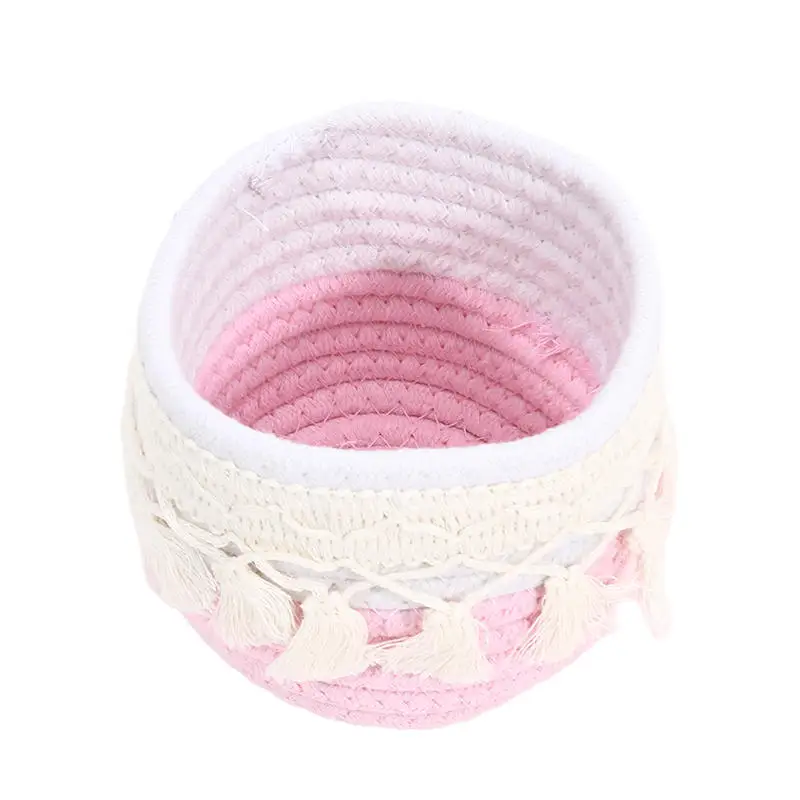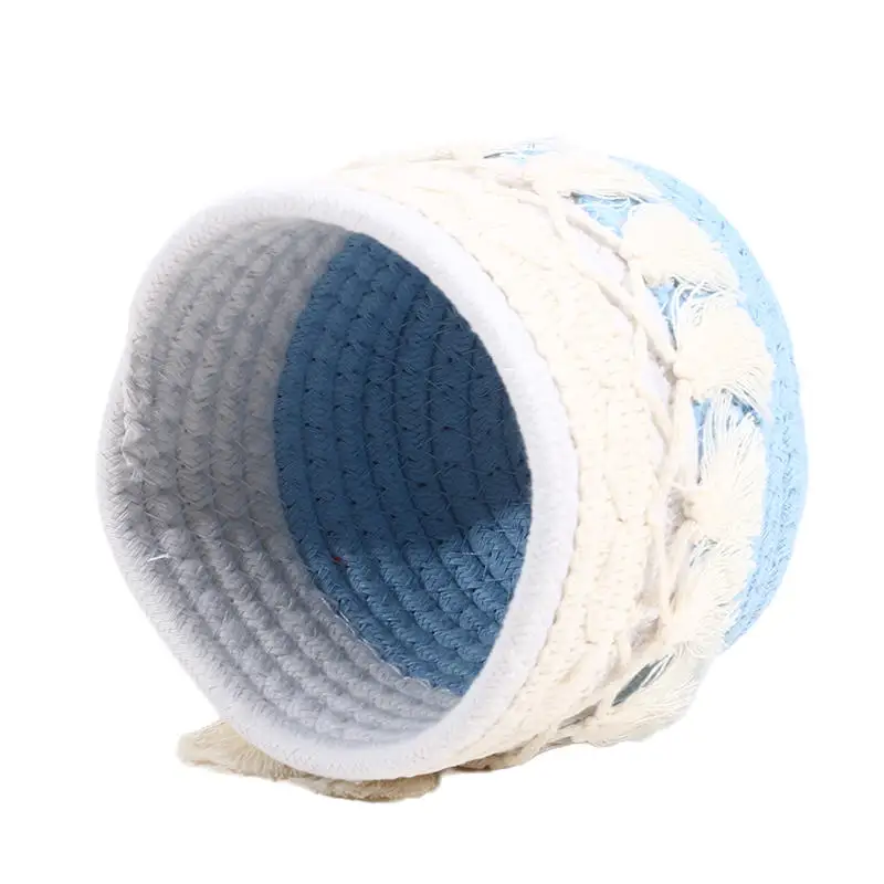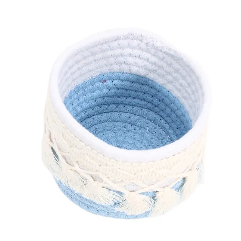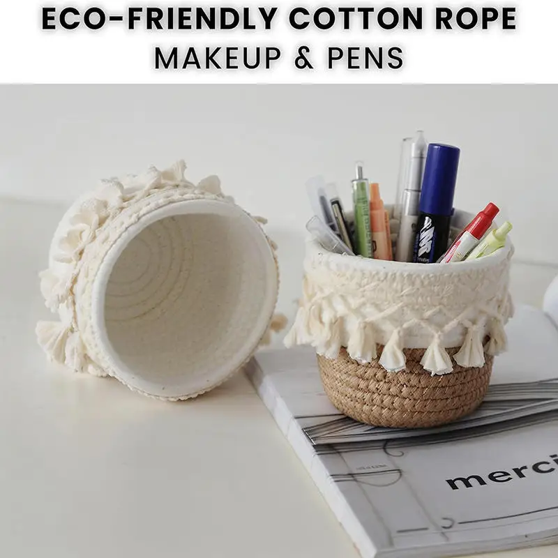 Cesta de almacenamiento de escritorio con borlas, caja de almacenamiento de brochas cosméticas, cestas de almacenamiento tejidas circulares, portalápices, necesidades diarias del hogar