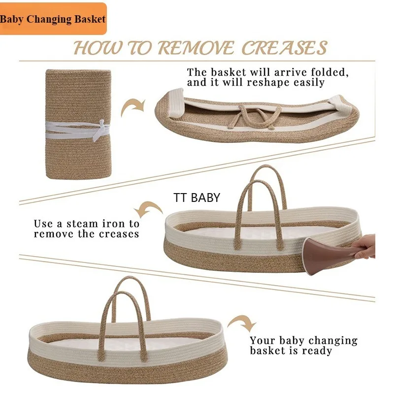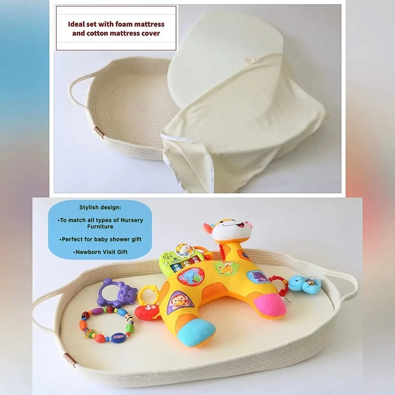 Cesta para cambiar pañales para bebés, cesta para moisés para bebés, cesta para cambiar pañales de cuerda de algodón, cambiador de pañales de espuma para cómoda Descripción: 1. Suavidad del bebé: nuestras cestas para cambiarse están hechas de 100% algodón, suaves, livianas y duraderas. 2.La cesta Baby MosesViene con un colchón de alta calidad y una funda extraíble 100% algodón.