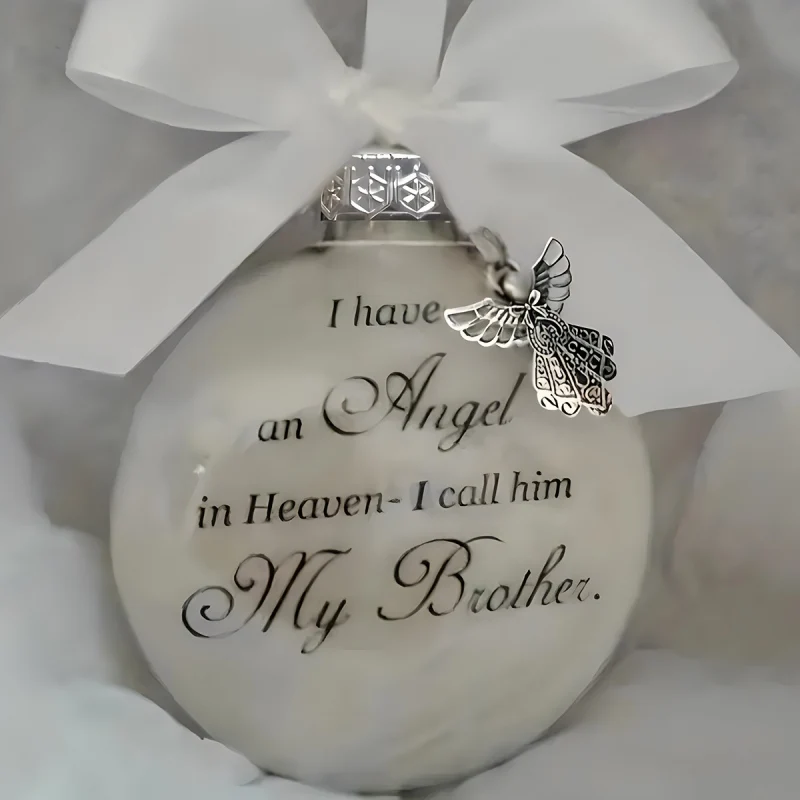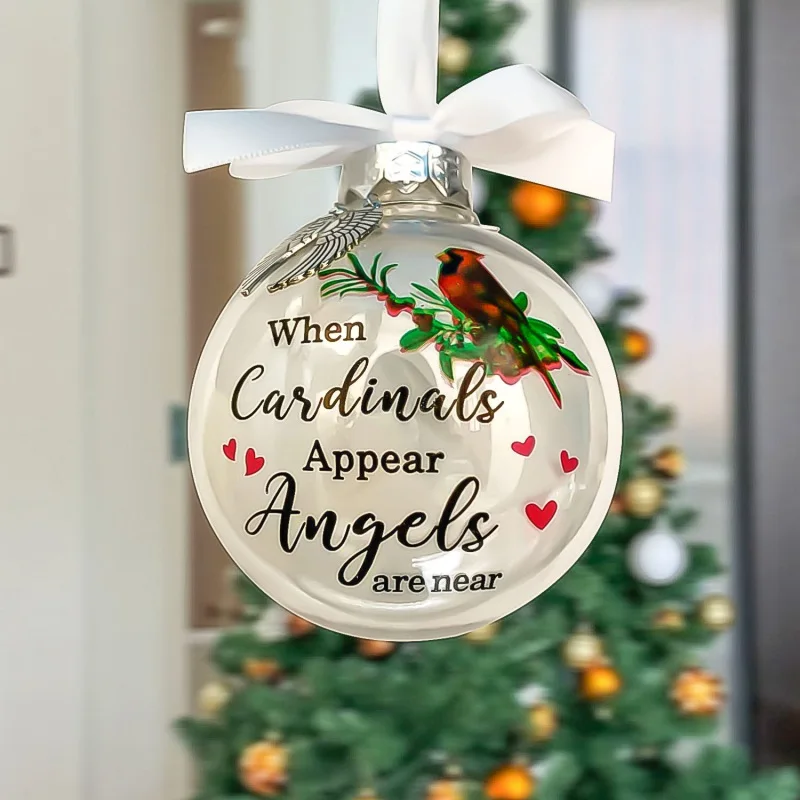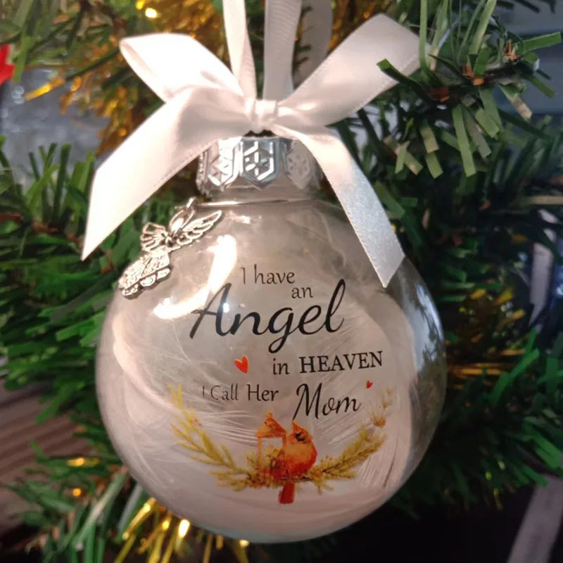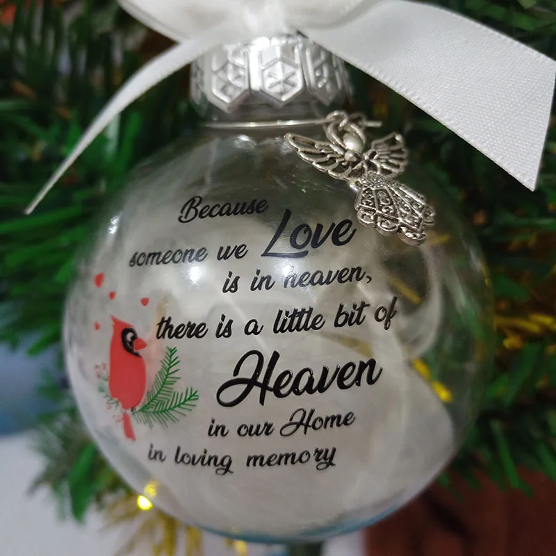 3.It is a 3.15'' round clear plastic feather ball ornaments, family in heaven gift with metal pendants, with the unique words of remembrance.