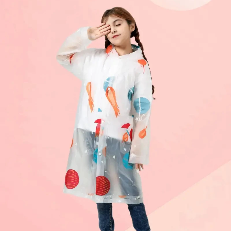 Este impermeable EVA para niños está especialmente diseñado para niños, hecho de material EVA de alta calidad que es suave, duradero y transpirable, lo que permite que los niños viajen cómodamente en clima lluvioso. Además, este impermeable tiene características impermeables y a prueba de viento que protegen a los niños de la exposición a la lluvia y el viento frío.