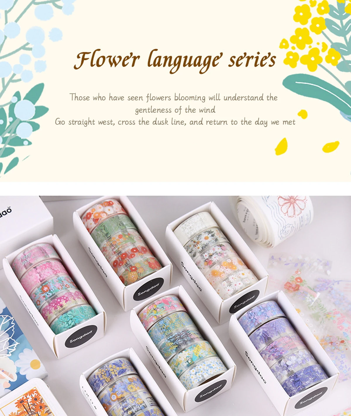 Cinta adhesiva de cuenta de mano de papel y idioma de flores de PET transparente creativa, caja de regalo, Material de decoración DIY, cinta de cuenta de mano
