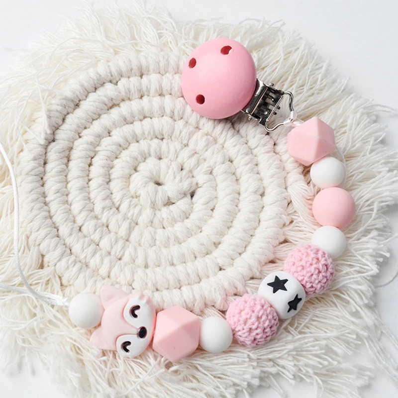 Clip de ganchillo hecho a mano para chupete de bebé, Clips de cadena de algodón de madera para recién nacido, soporte para pezón, chupete de dentición, pinzas para masticar