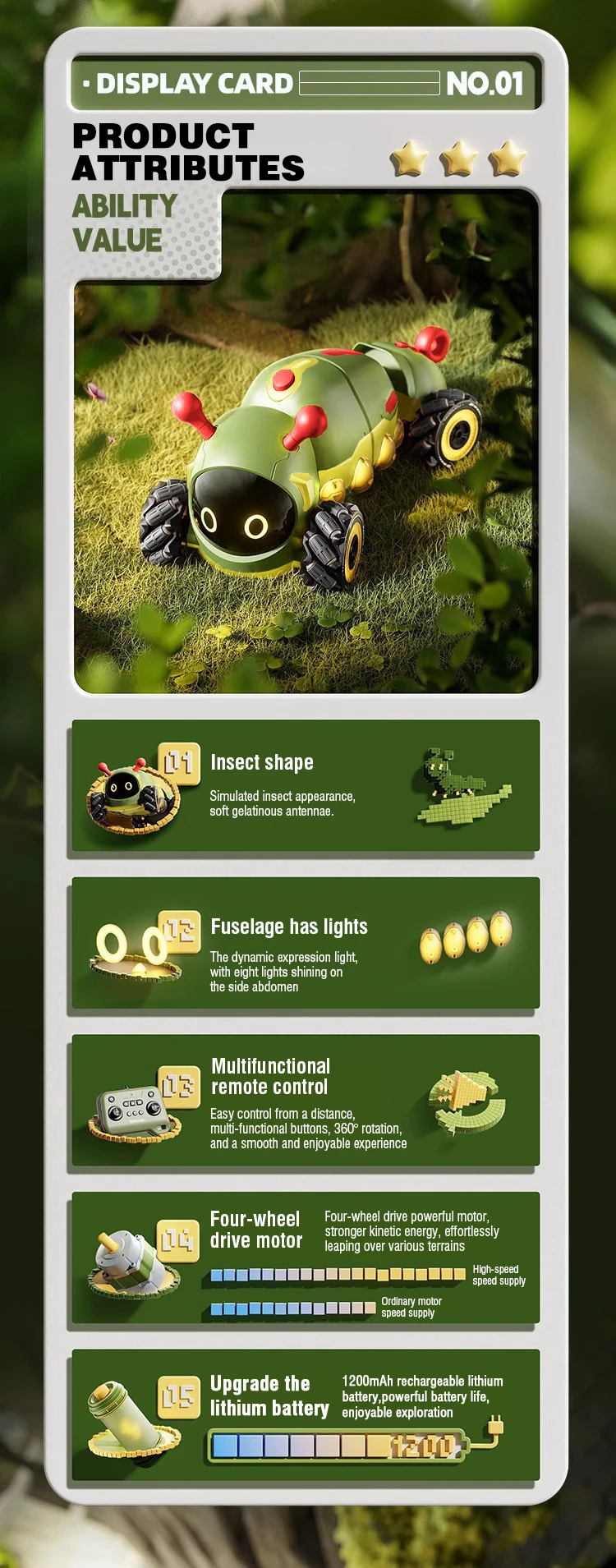 1.La apariencia a prueba de insectos es animada y dinámica.Los tentáculos de goma suave evitan atascos.La combinación de colores naturales es extremadamente llamativa.Los dos tipos de canto de insectos dan una sensación de vida, haciéndote sentir más inmerso mientras juegas.