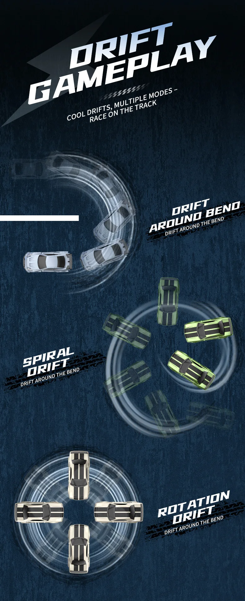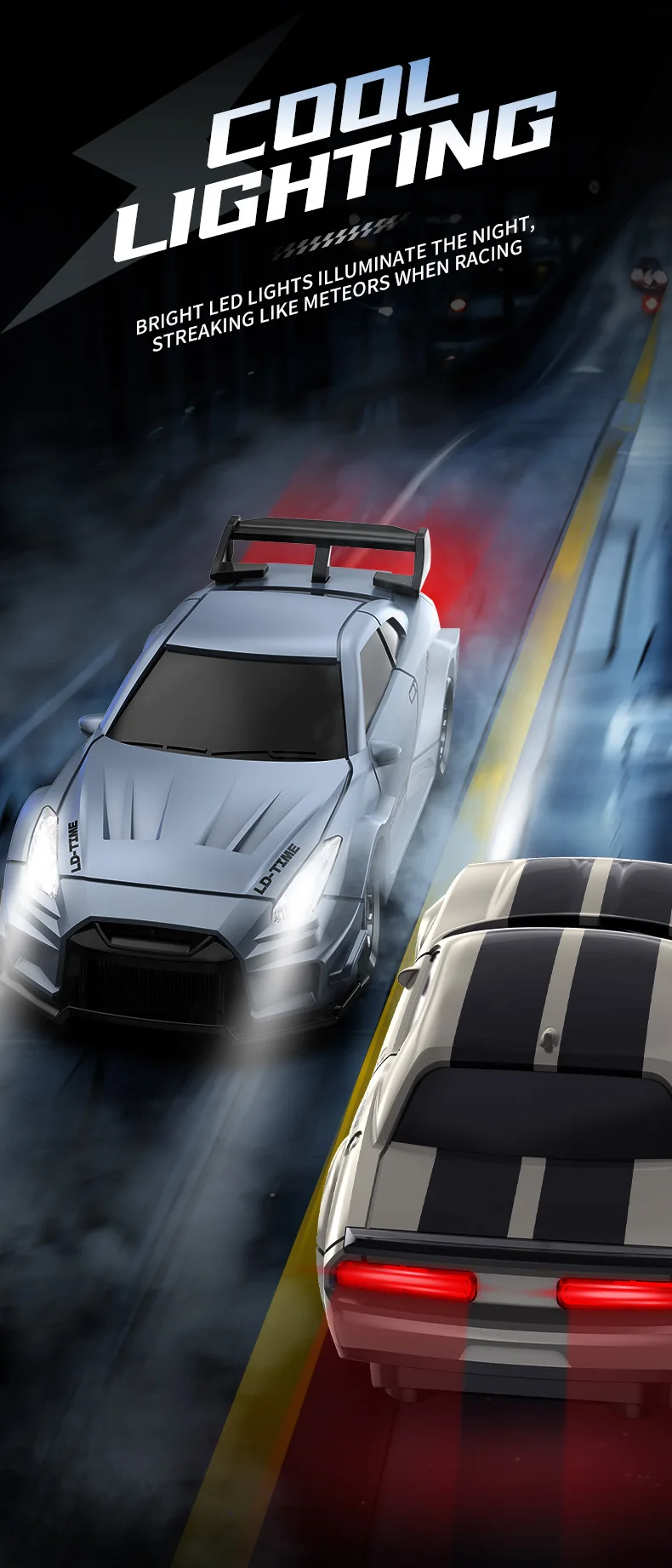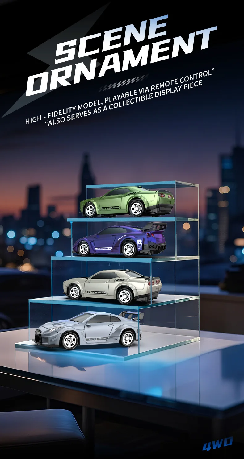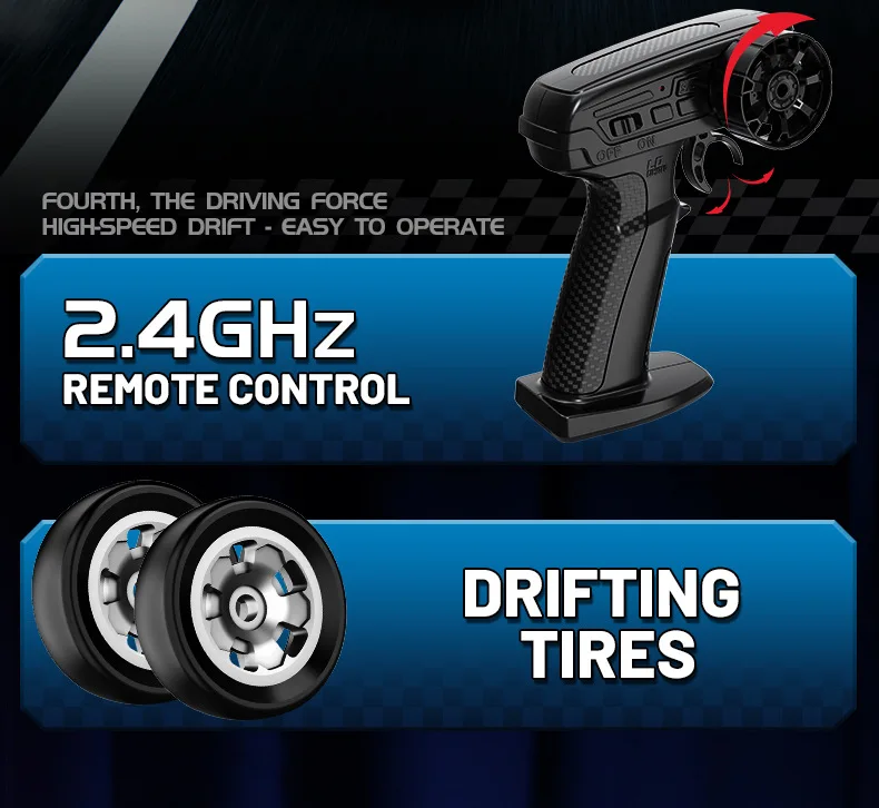 La carcasa del automóvil ha sido pintada con luz y cambio de color de sombra/puede iluminar faros delanteros/luces traseras/equipada con ruedas especiales para deriva/control remoto de pistola/tracción en las cuatro ruedas de gran potencia/admite regulación de velocidad de dos velocidades/marcha rápida para realizar la deriva hacia adelante/atrás/izquierda/derecha