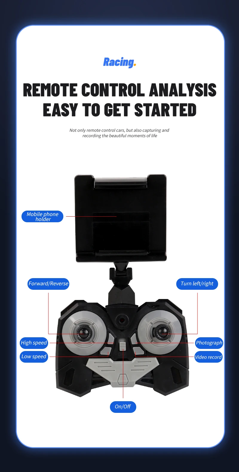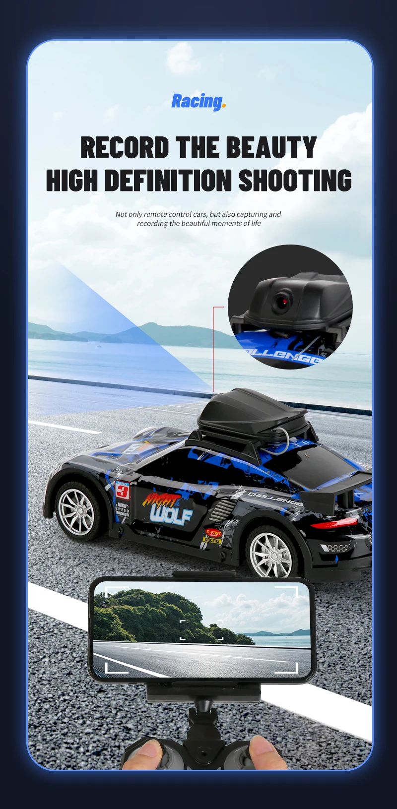 Puede descargar la APLICACIÓN y luego usar su teléfono móvil para controlar el vehículo, grabar y tomar fotografías en tiempo real.Las fotos y vídeos se almacenan en el teléfono móvil y se pueden reproducir.