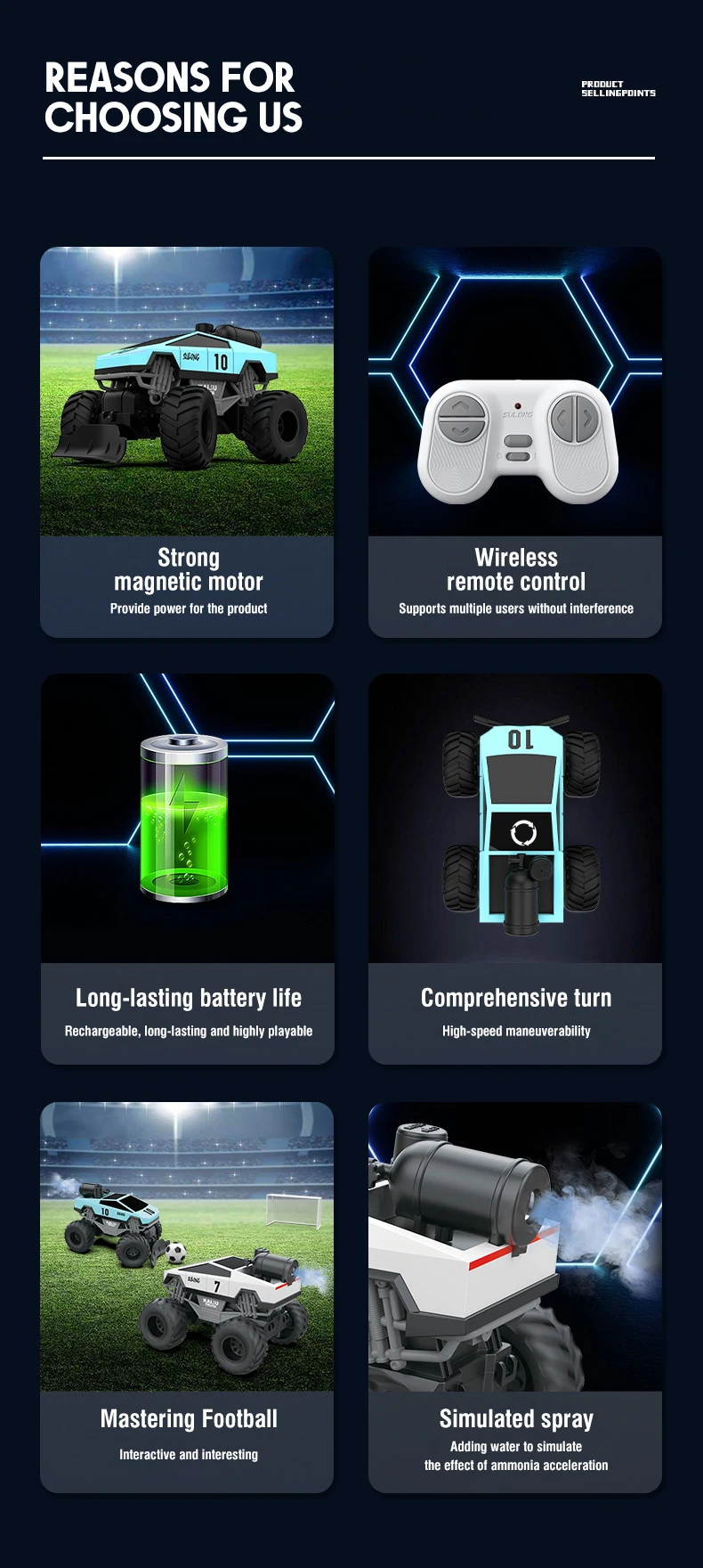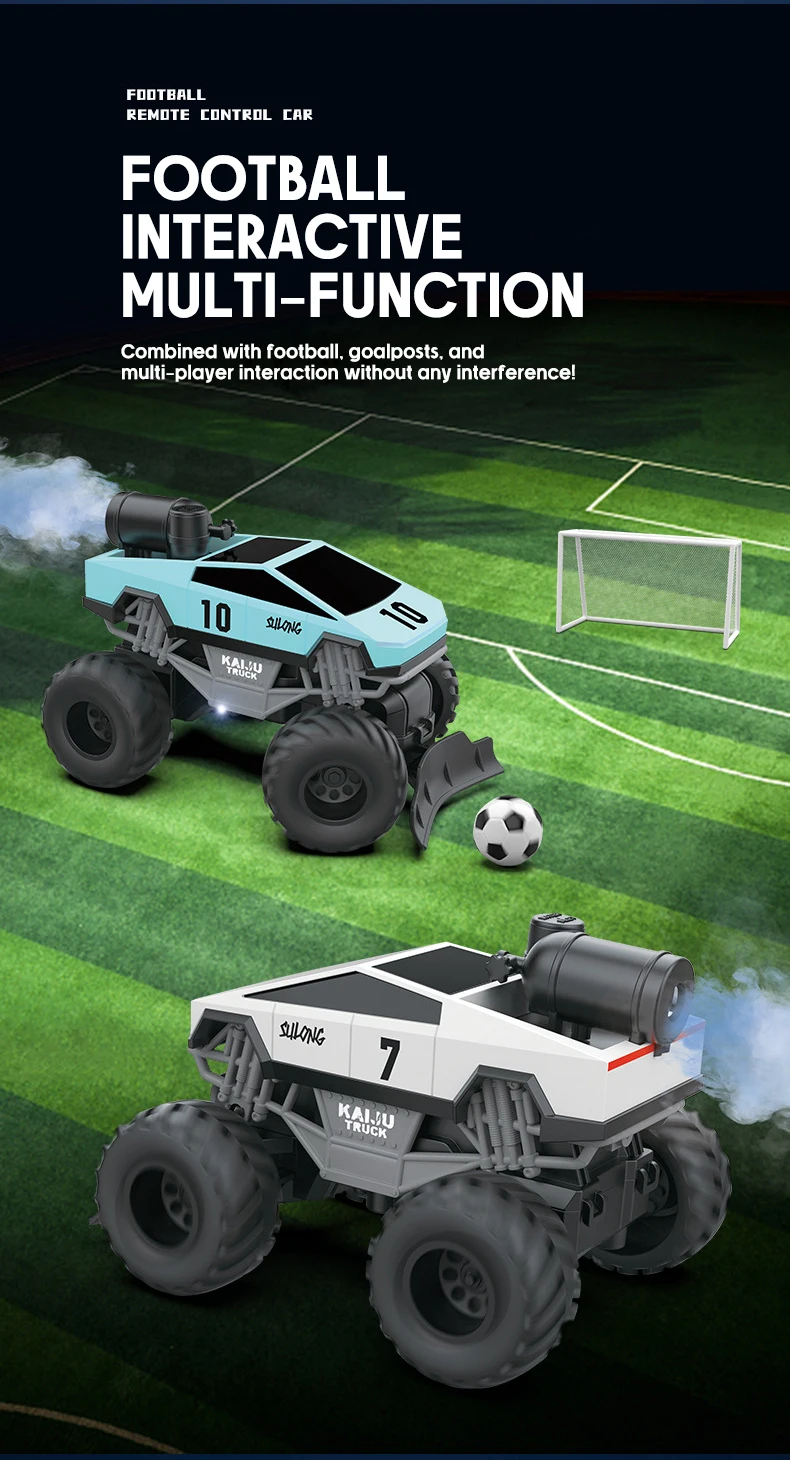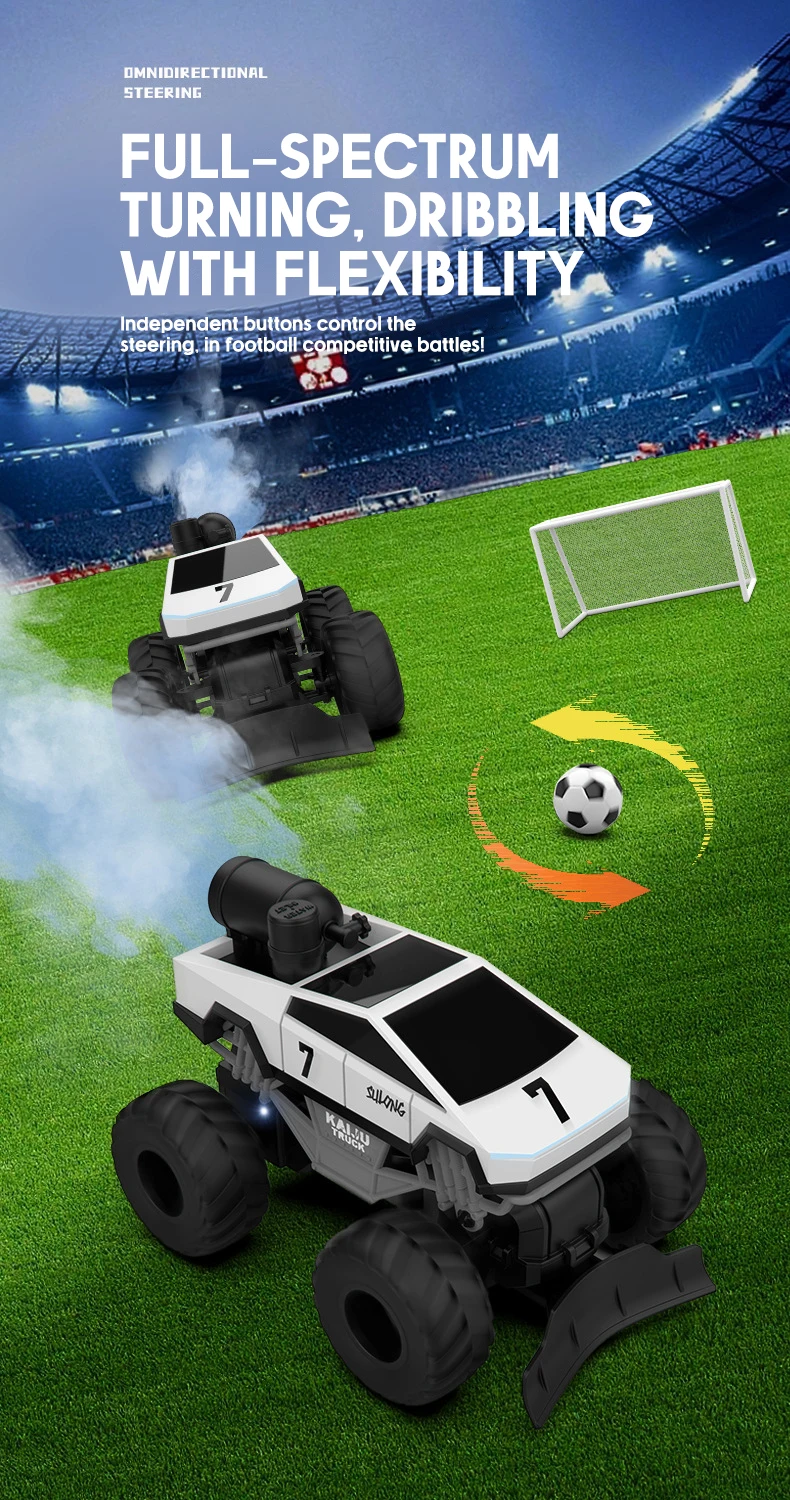 1.Control remoto inalámbrico, admite que varias personas jueguen simultáneamente sin interferencias, dirección integral, combinada con fútbol y porterías, con interactividad diversa e interesante2.Agregue agua limpia para simular la aceleración del gas amoníaco, combínela con neumáticos de goma blanda, adapte a varios terrenos y use un spray ligero para maximizar la experiencia.