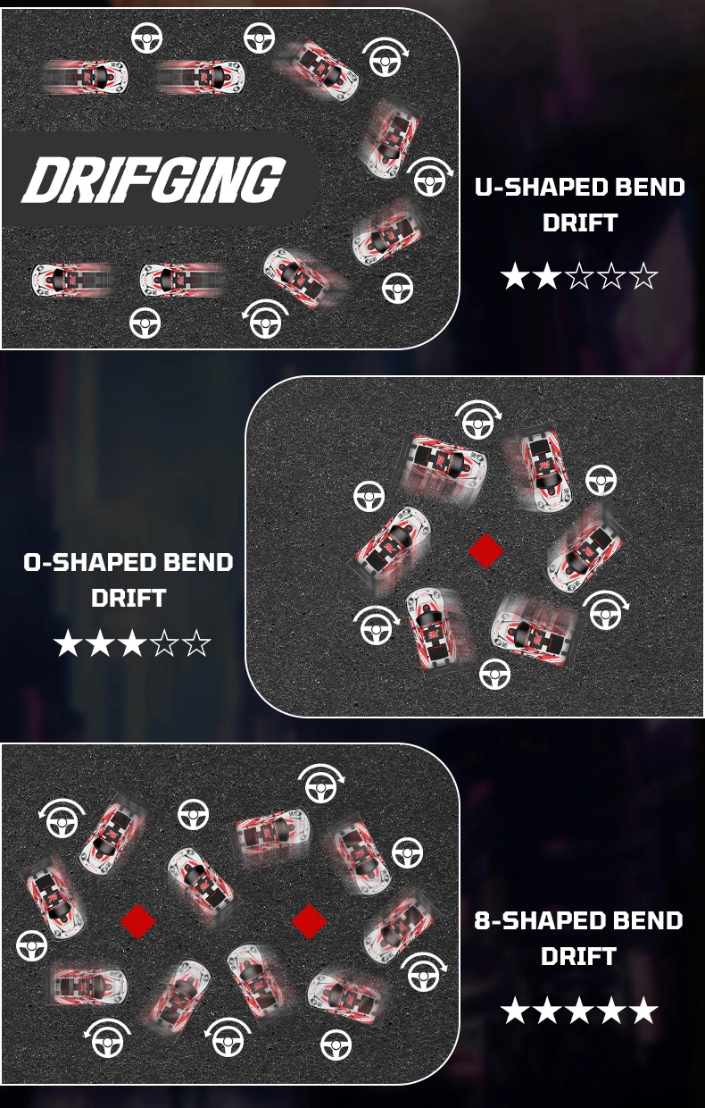 5. El coche de deriva con control remoto está hecho de una carcasa de PVC de alta resistencia y el cuerpo está hecho de materiales ABS de alta calidad para mayor durabilidad.Los bordes redondeados protegen las manos contra rasguños.
