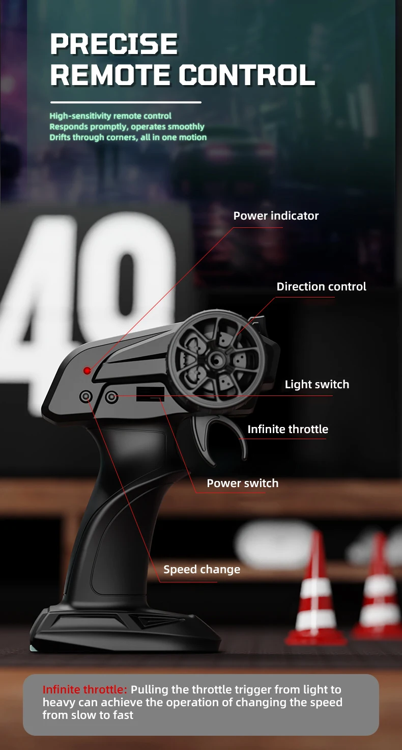 3.Estecontrol remotoel coche de deriva está equipado con 2.Control remoto de 4 GHz, 2.Frecuencia de 4 GHz, más estable, mayor tiempo de funcionamiento, mayor distancia de control, con función de emparejamiento automático, puede ayudar a que varias personas conduzcan el automóvil de deriva al mismo tiempo, sin interferir entre sí.