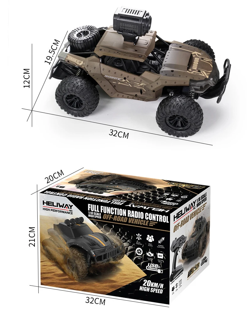 Coche de control remoto con cámara Descripción del artículoRelación corporal: 1:16Tamaño del producto: 32*19,5*12cmTamaño de la caja de color: 32*20*21,2 cmDistancia R/C: 100 metros aprox.Tiempo de uso: 15 minutos aprox.H/km/Velocidad máxima: 25 km/hForma de carga: USB(6V)Tiempo de carga: 120-150 minutos aprox.Distancia de transmisión WIFI: 35-40 metros (características solo disponibles con estilo de cámara)Función del productoFunciones básicas: deriva/velocidad hacia adelante/hacia atrás/giro a la izquierda/giro a la derechaFunción añadida: transmisión de imágenes en tiempo real/foto/Video/control de giroscopio de control de teléfono móvil/detección de gravedad (características solo disponibles con estilo de cámara)Producto accesorioVehículo de campo traviesa X 1R/C X 1Cargador USB x 1Batería (6V 500mAH)X 1Instrucción X1Cámara HD X1 (características solo disponibles con estilo de cámara)Coche de control remoto SIN Cámara Parámetros del productoTamaño del producto: 22,5*15,5*11cmNuevo punto de venta del producto: control remoto con nuevo y atractivo diseño; potente motor 260 actualizado, más potencia; emplea neumáticos más grandes, agarre más fuerte, forma más atractiva; camionetas. El techo tiene neumáticos de repuesto, la forma se ve más realistaMaterial del producto: PVC, ABS, componentes electrónicosTiempo de uso: 15 minutos más o menosTiempo de carga: 2,5 horasModo de control remoto: tecnología de control remoto 2,4G, distancia de control remoto, hasta 100 metros de diámetroBatería de control remoto: 2 secciones "AA" (traiga la suya)Batería del cuerpo: Batería de níquel-cadmio estándar de 4,8 V y 700 mAVelocidad: 25 km/h más o menosModo de control remoto: control remoto 2,4GMotor de accionamiento: motor 260, tracción a dos ruedasDispositivo de carga: cable de carga USBCaracterísticas del producto: Control de mango, cerebro manual. Vaya hacia adelante y hacia atrás, gire a la izquierda y a la derecha.Peso del producto: 0,8 kgLa lista contiene:Coche de control remoto * 1,Control remoto * 1,Paquete de batería * 1,Manual de instrucciones * 1,Cable de carga USB * 1.