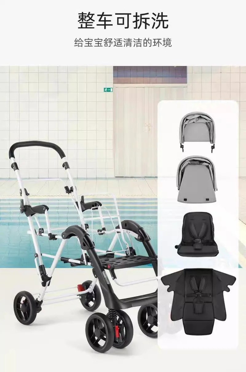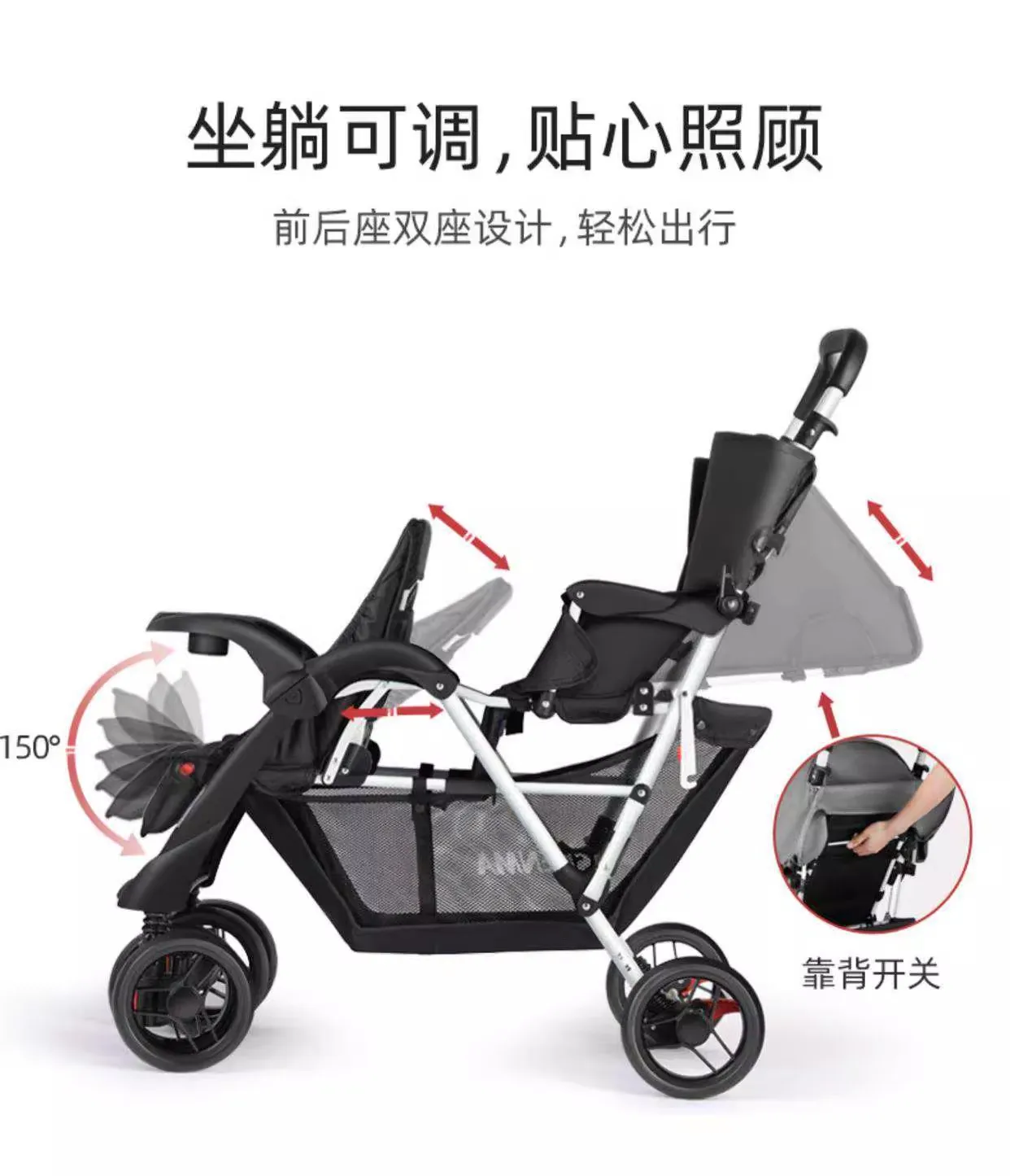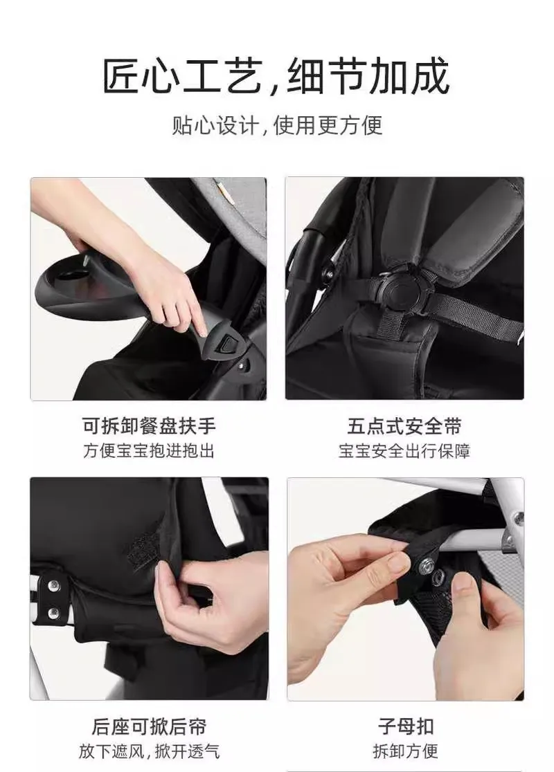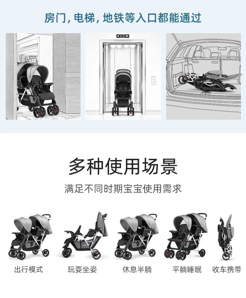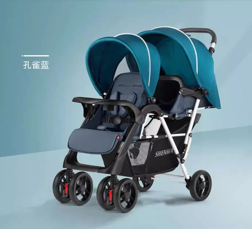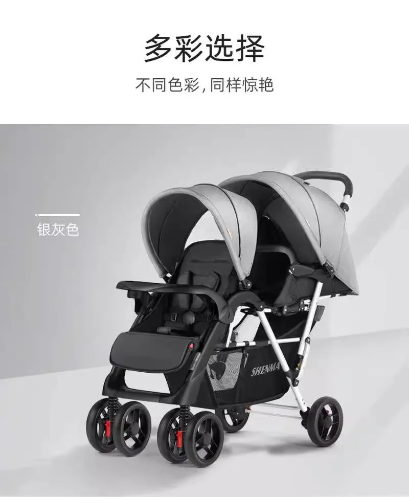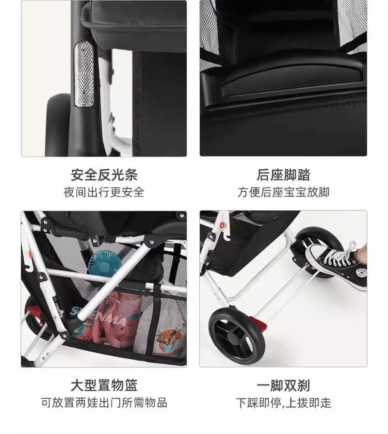 Cochecito de bebé ligero y plegable con asientos delanteros y traseros gemelos