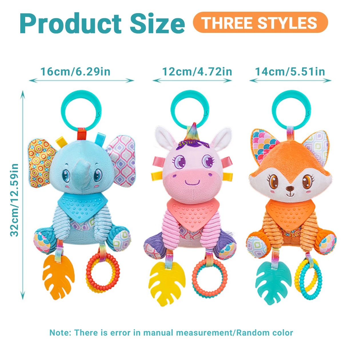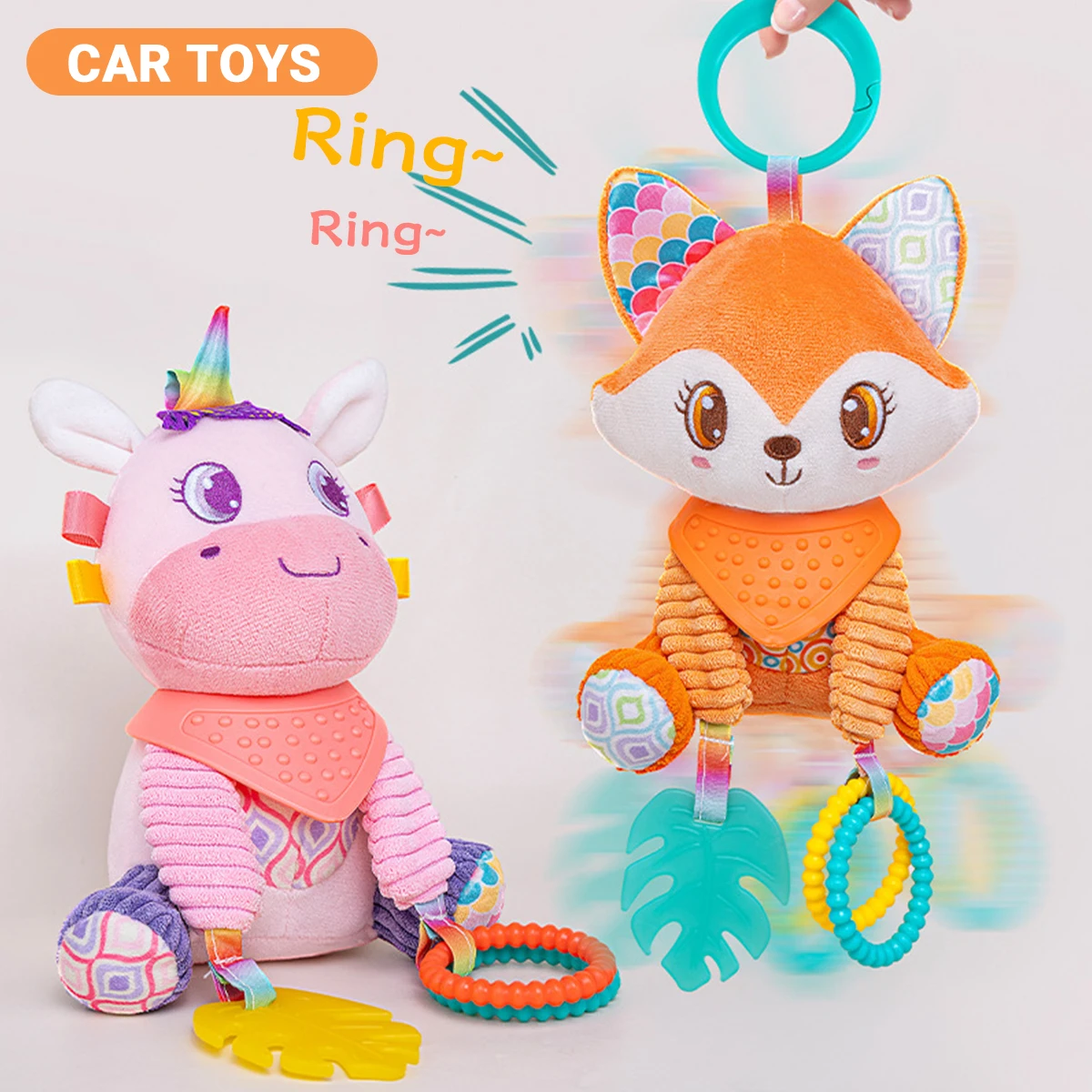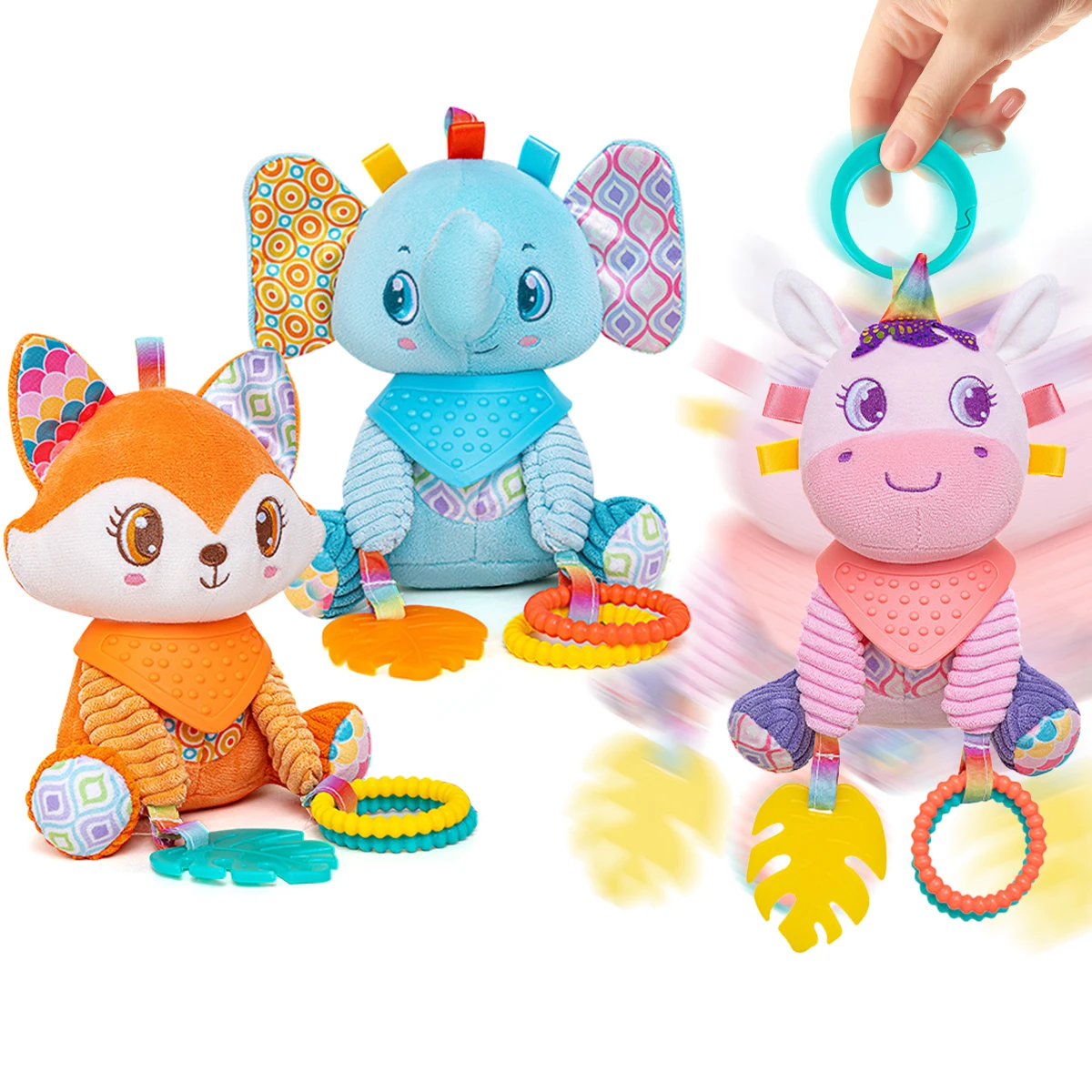 Suave, colgante, arrugado, aprendizaje sensorial, juguete, cochecito, asiento de coche, cuna, viaje, carillón de viento de animales de peluche con mordedor, niños y niñas