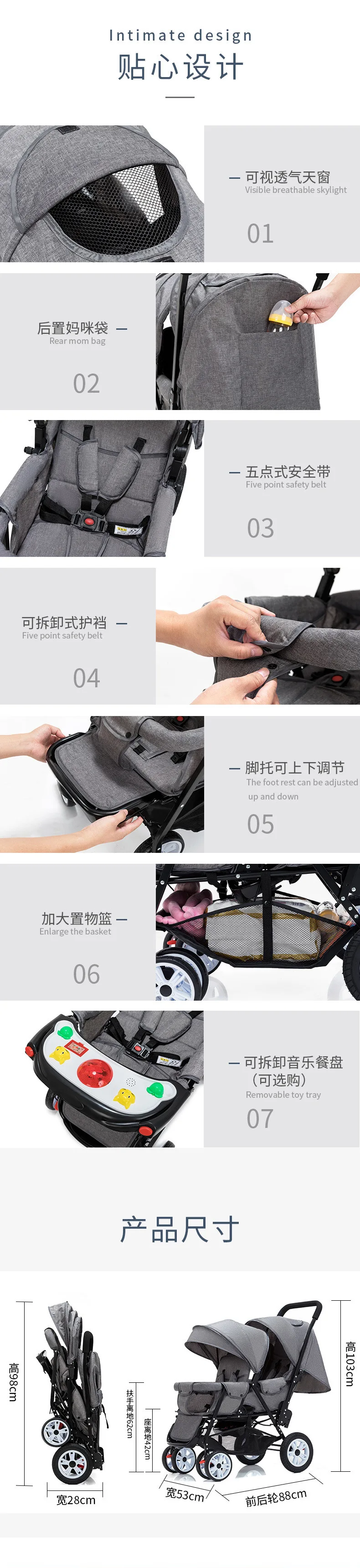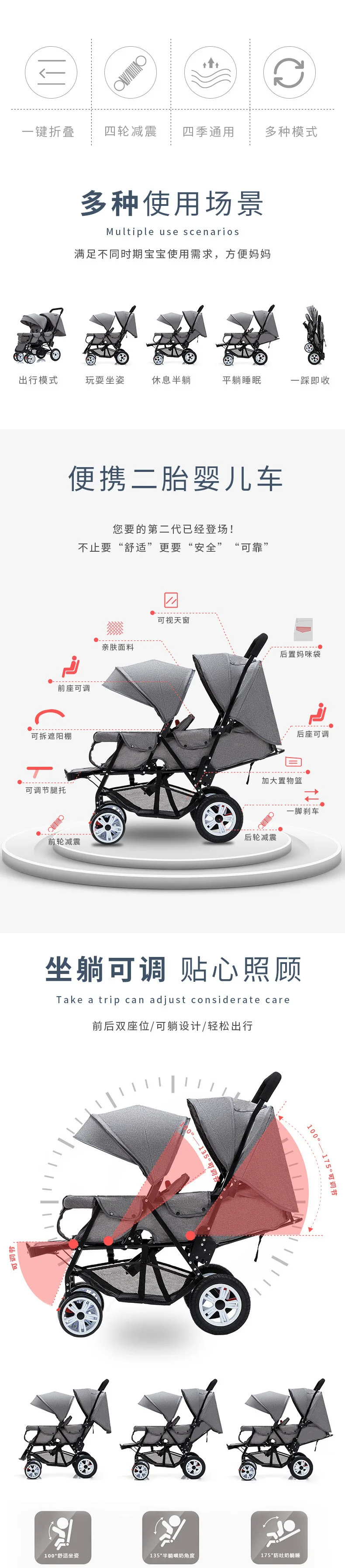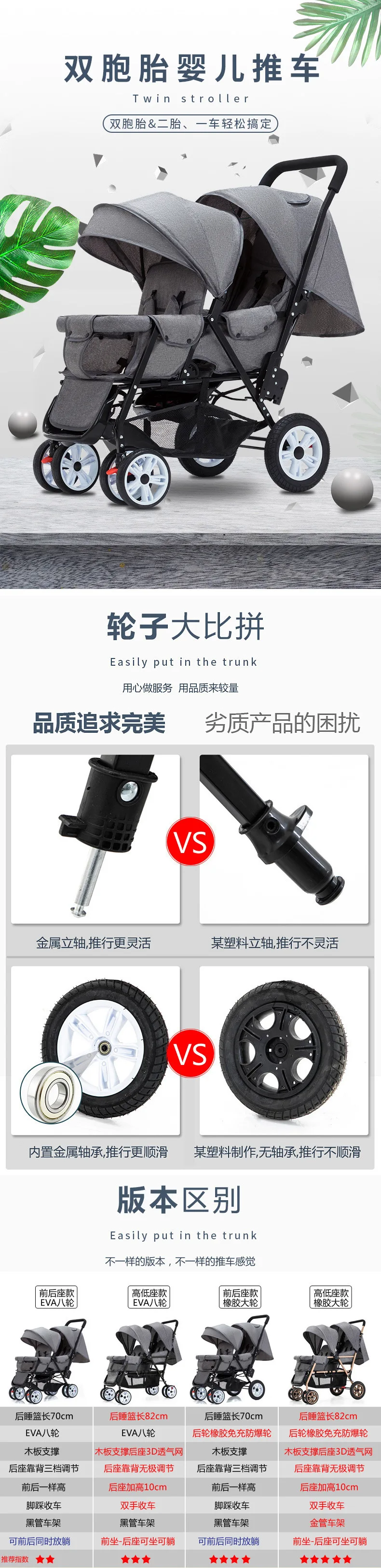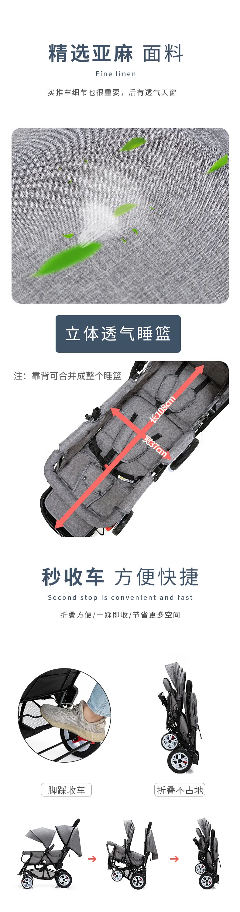 Cochecitos de bebé gemelos, asientos delanteros y traseros, ligeros, plegables, adecuados para dos personas, cochecito de bebé de tamaño, carrito de empuje manual