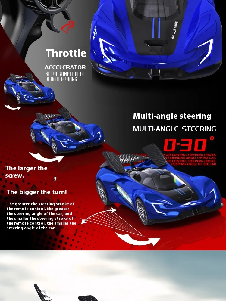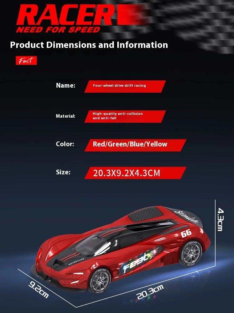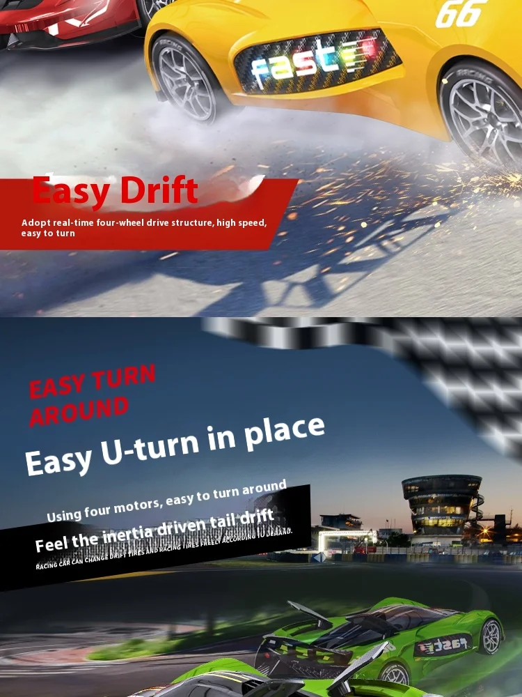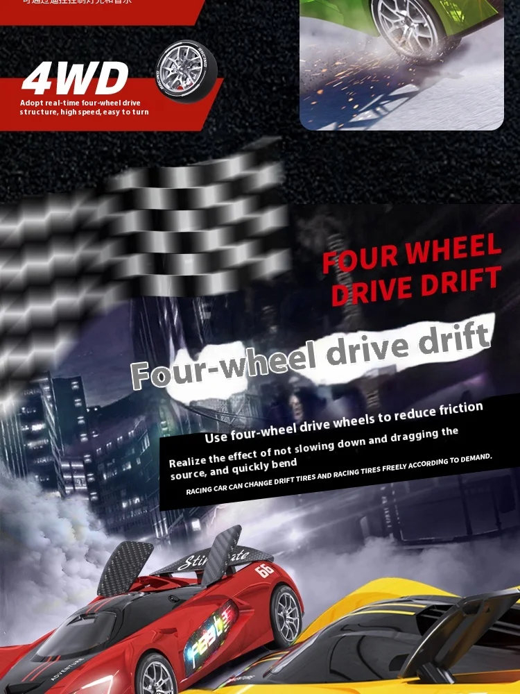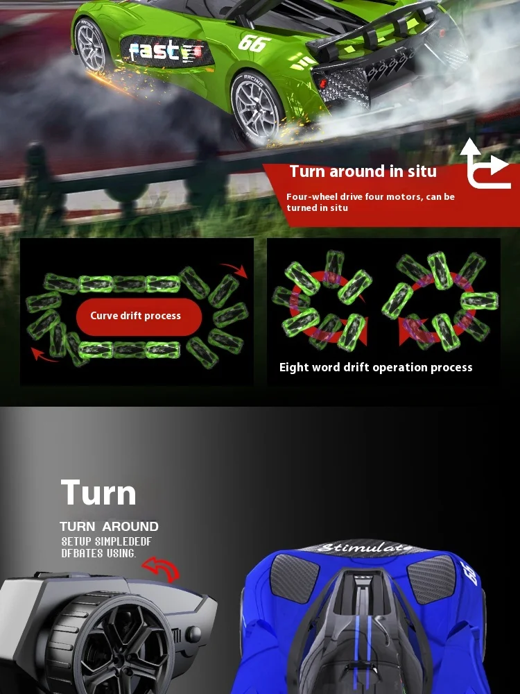 3.La deriva de las cuatro ruedas permite curvas rápidas, giros en U fáciles en su lugar, giros hacia adelante/atrás/izquierda/derecha.levantar y levantar el ala de la cola
