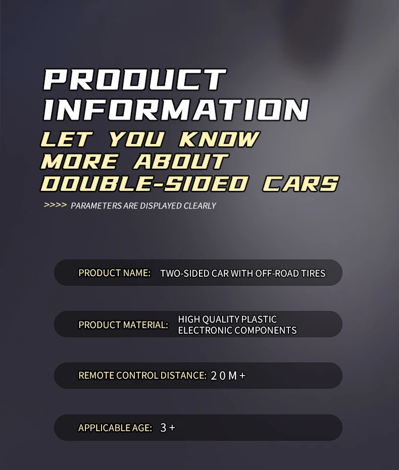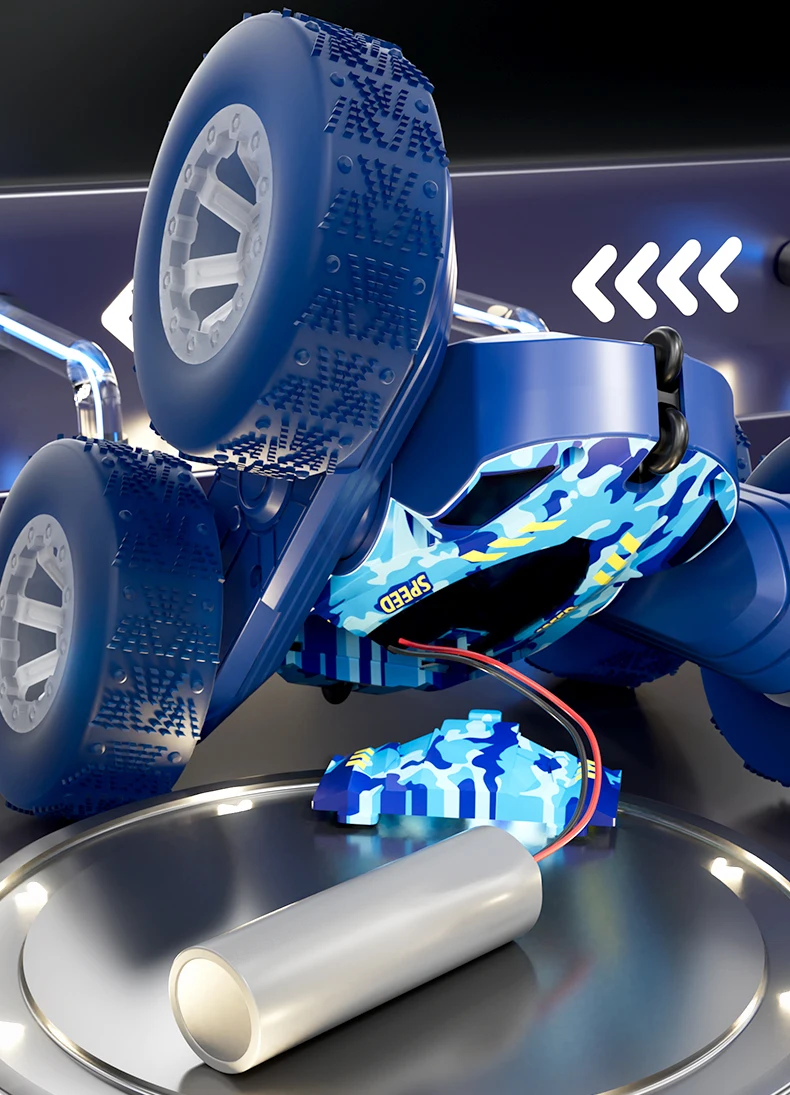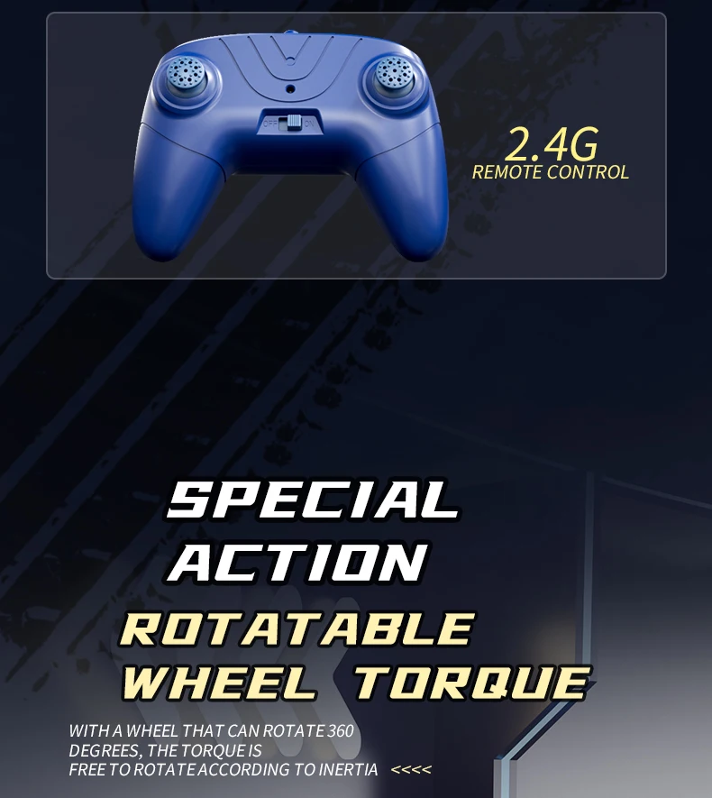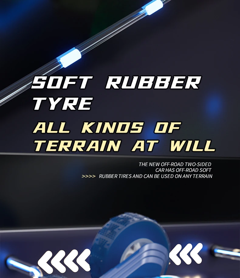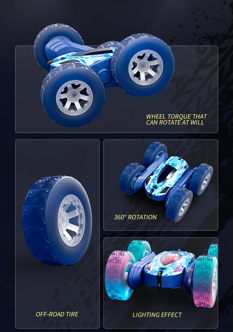 1.Adelante, atrás, giro a la izquierda, giro a la derecha, accionamiento de doble motor, giro acrobático de doble cara, conducción de doble cara.Ocho luces en todo el vehículo, con luces en las ruedas.