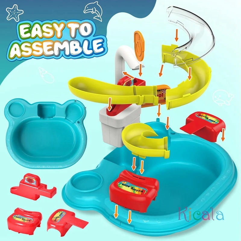 Grifo de flujo de agua realista: observe cómo el agua cae en cascada por el tobogán, creando una experiencia de juego realista e inmersiva.Nuestro diseño único de fregadero de juego con agua corriente garantiza un flujo constante de agua, añadiendo un elemento adicional de emoción al tiempo de juego de su hijo.
