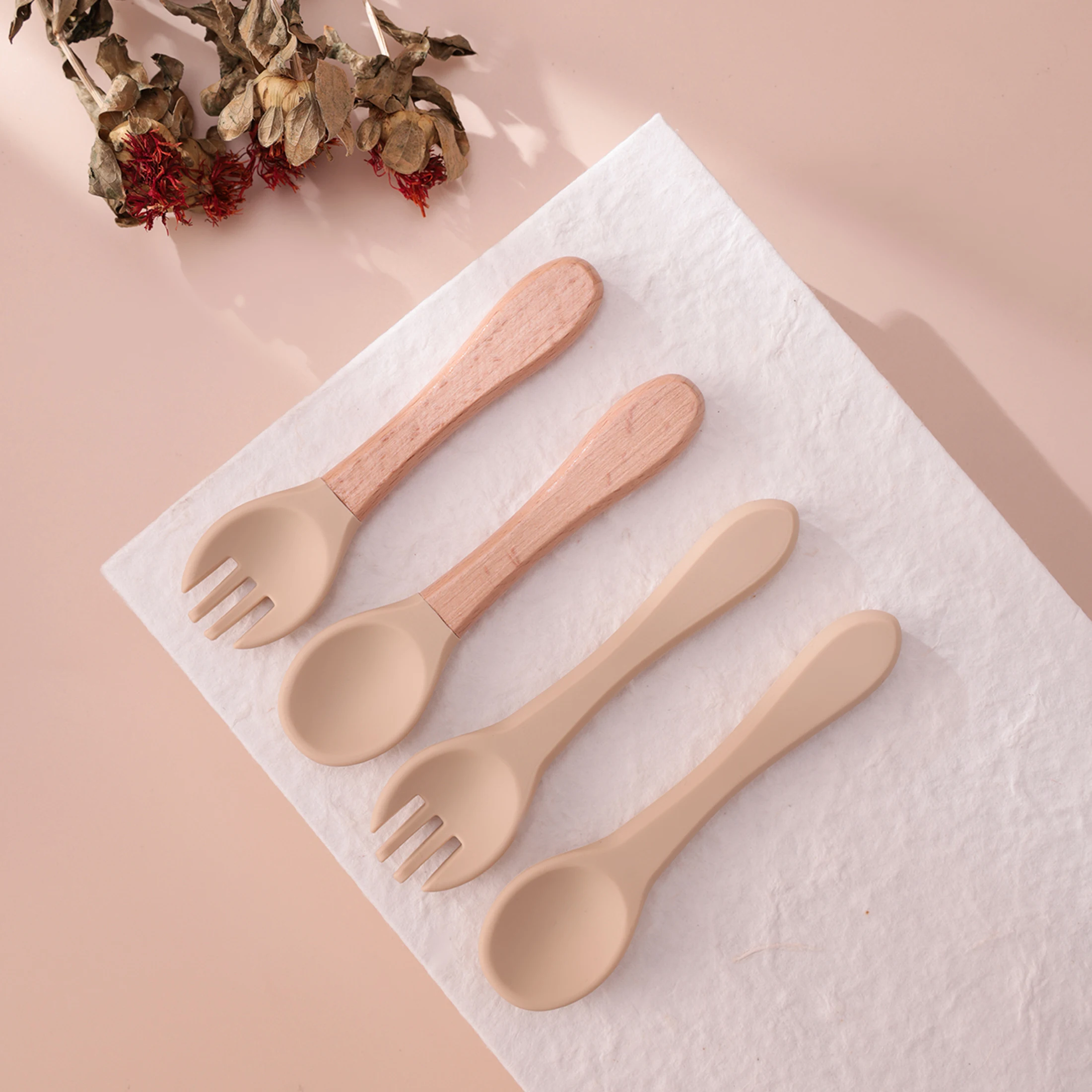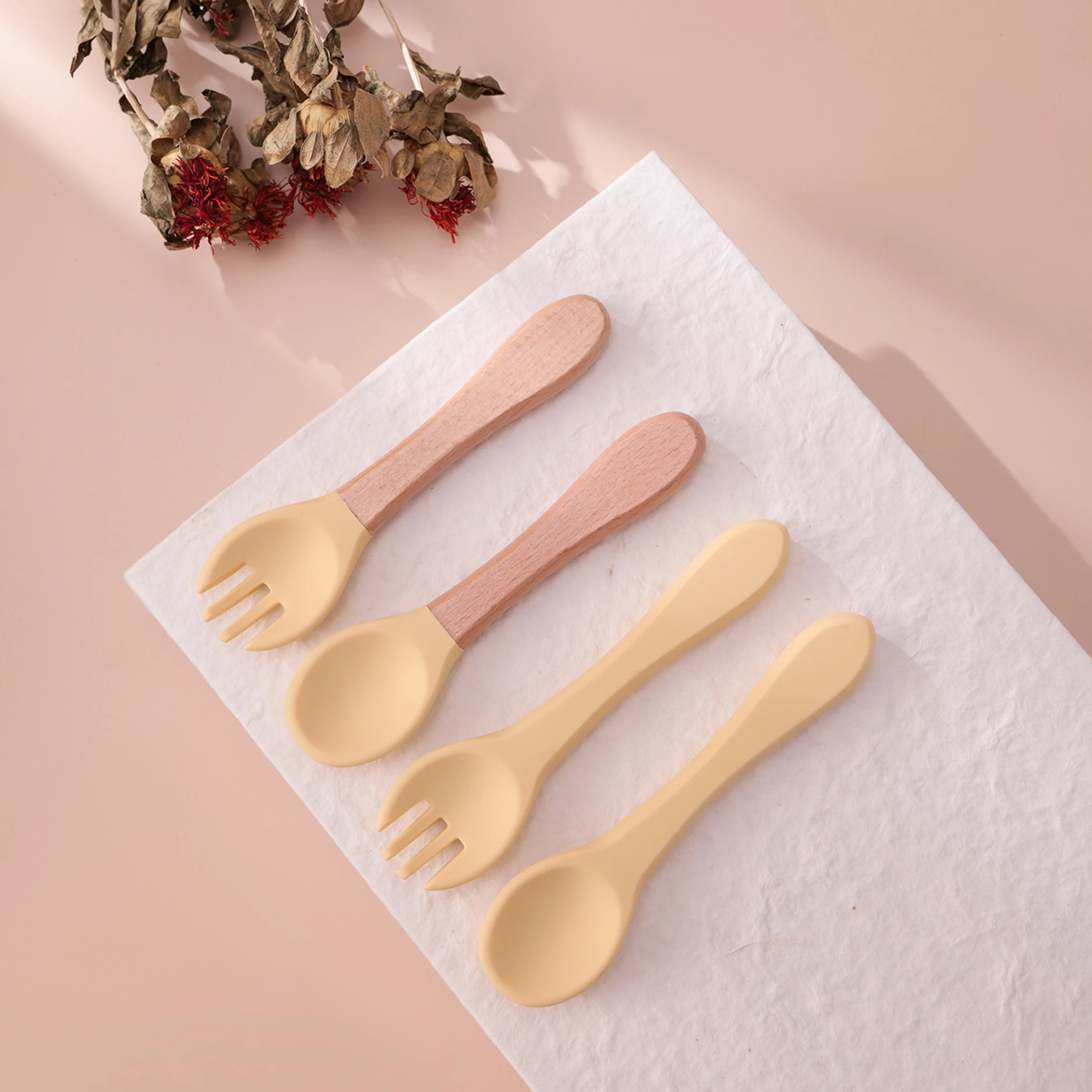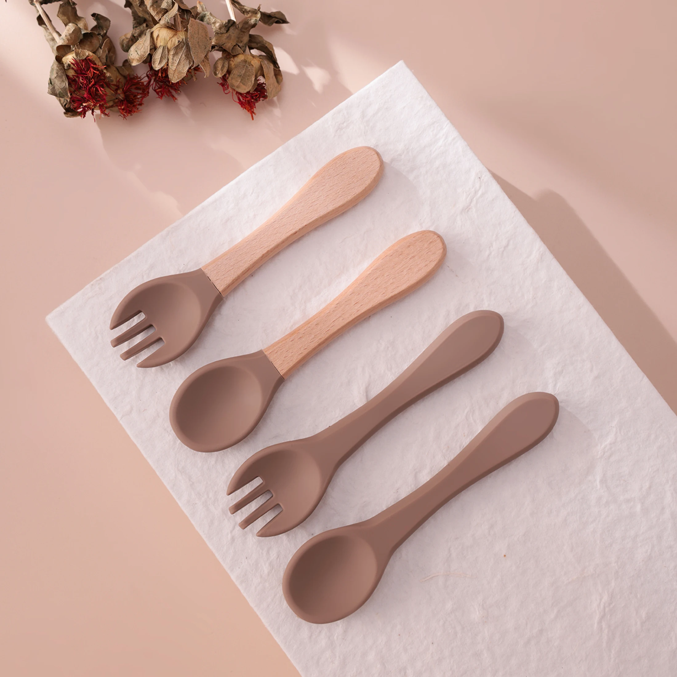 Color niños 4 Uds silicona alimentación de bebé cuchara tenedor juego sin BPA mango de madera utensilios de entrenamiento para bebés accesorios para recién nacidos