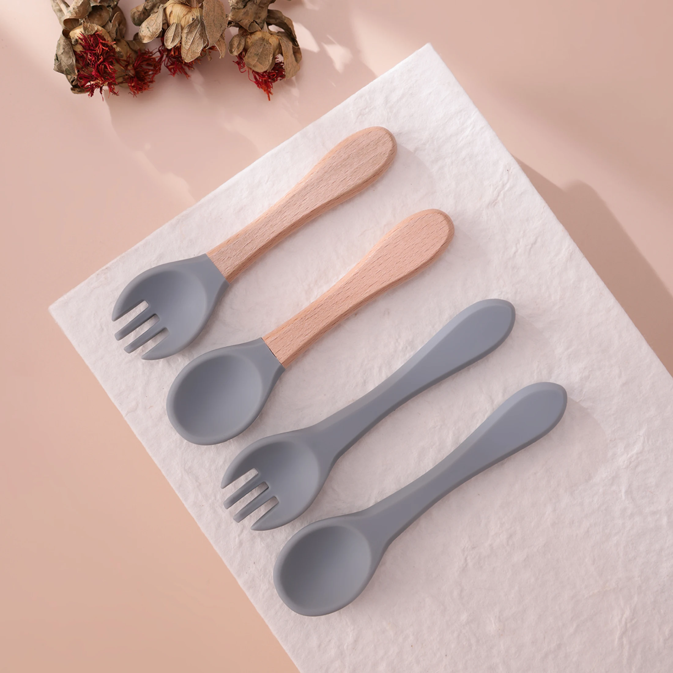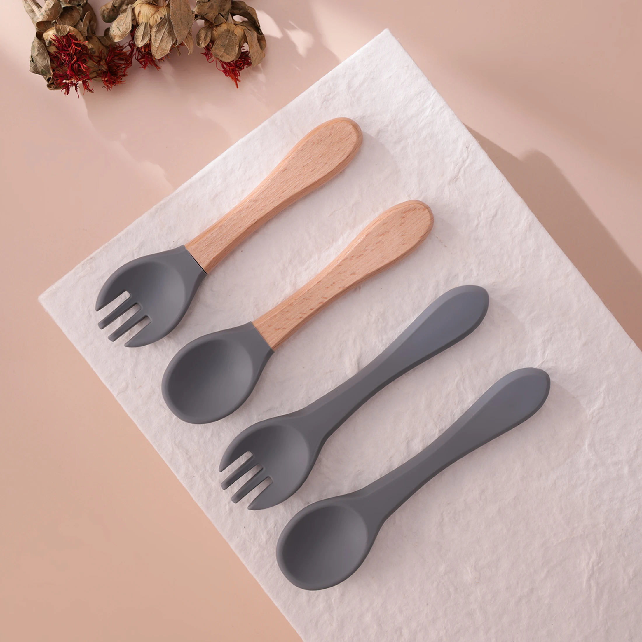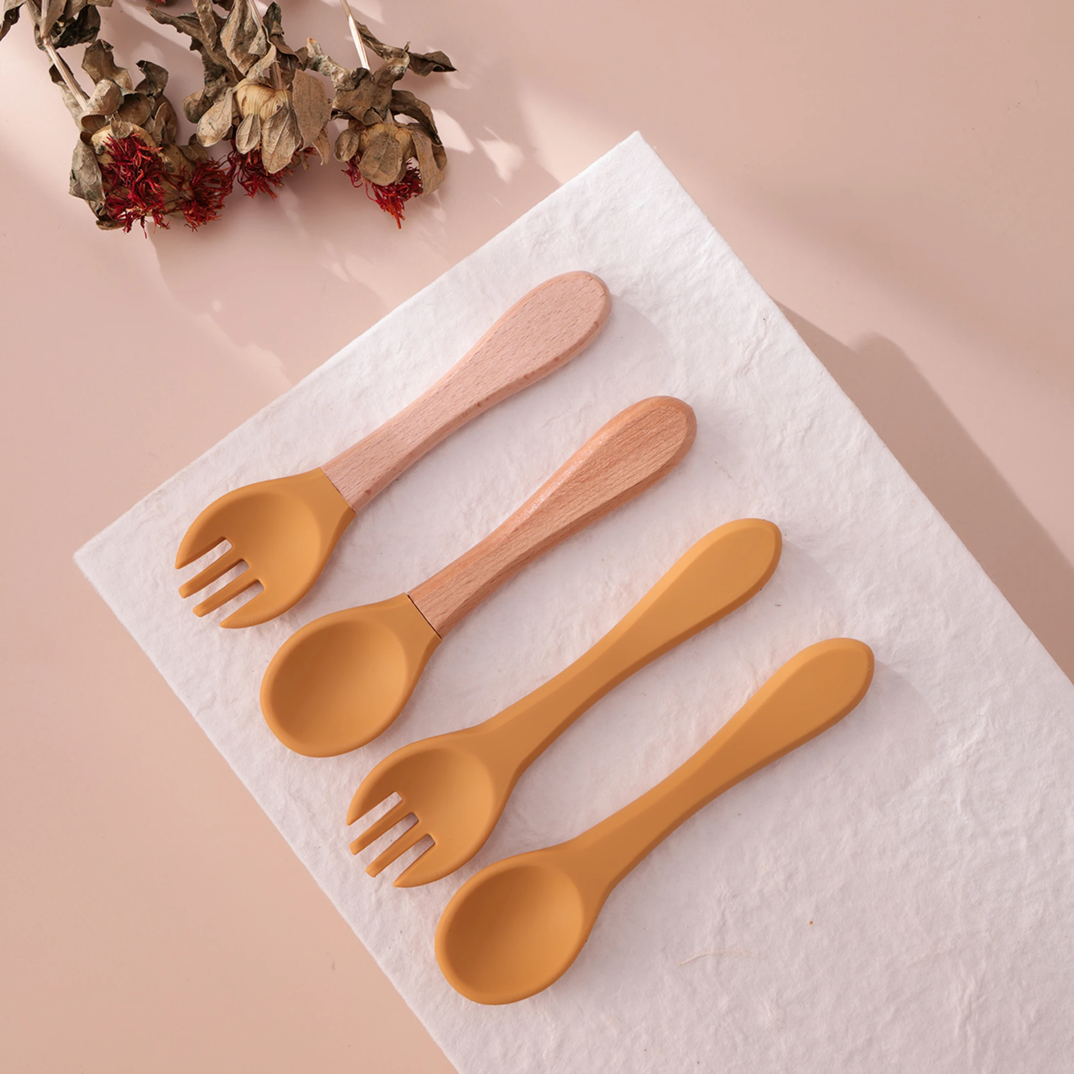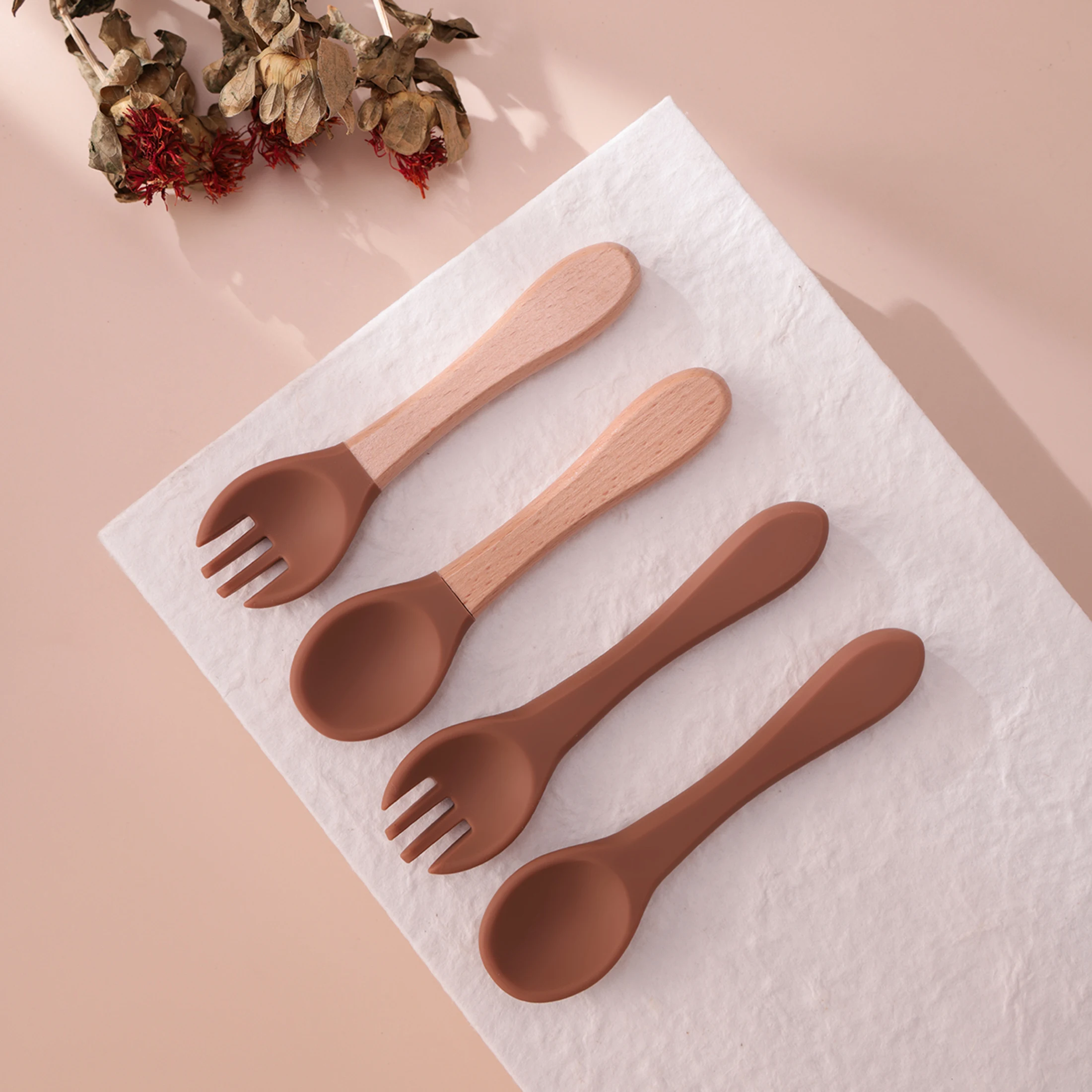Color niños 4 Uds silicona alimentación de bebé cuchara tenedor juego sin BPA mango de madera utensilios de entrenamiento para bebés accesorios para recién nacidos