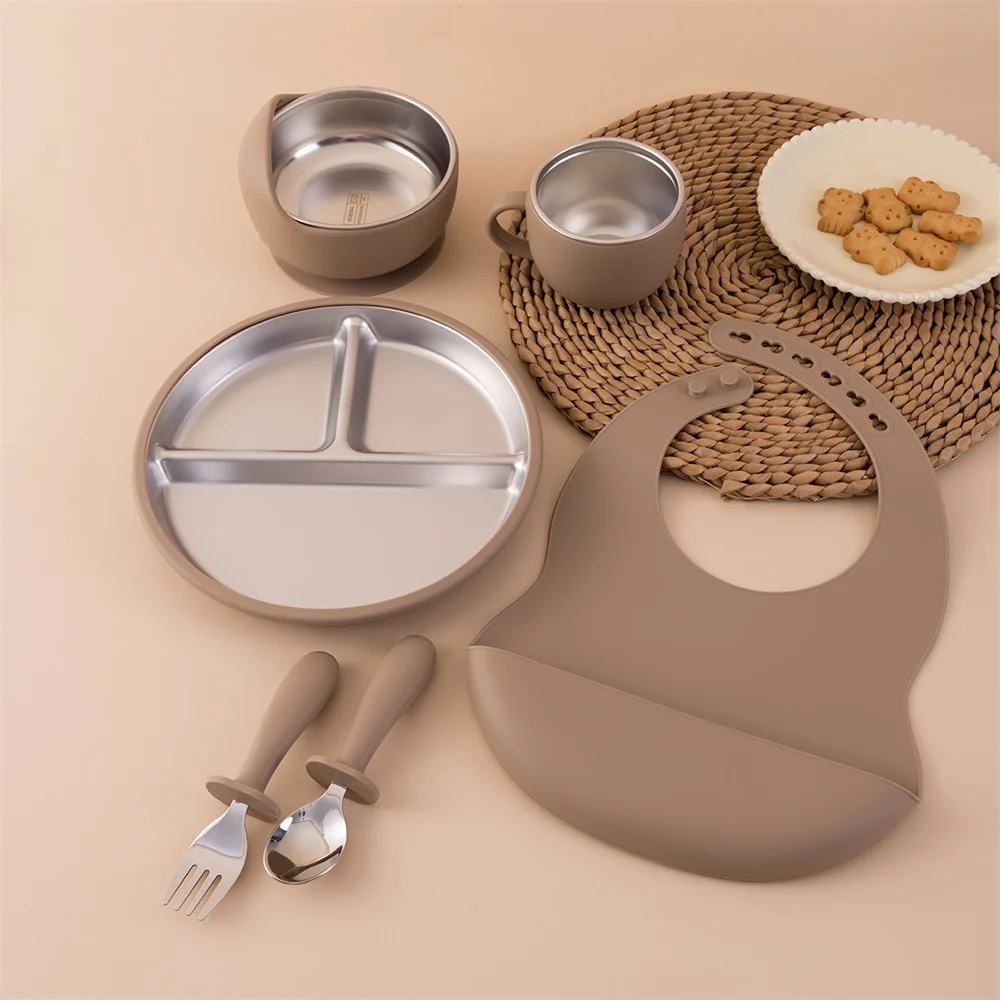 Juego de alimentación de bebé de Color para niños, 6 uds., cuenco de silicona de acero inoxidable, plato, babero desmontable, vajilla de deshierbe, entrenamiento infantil sin BPA