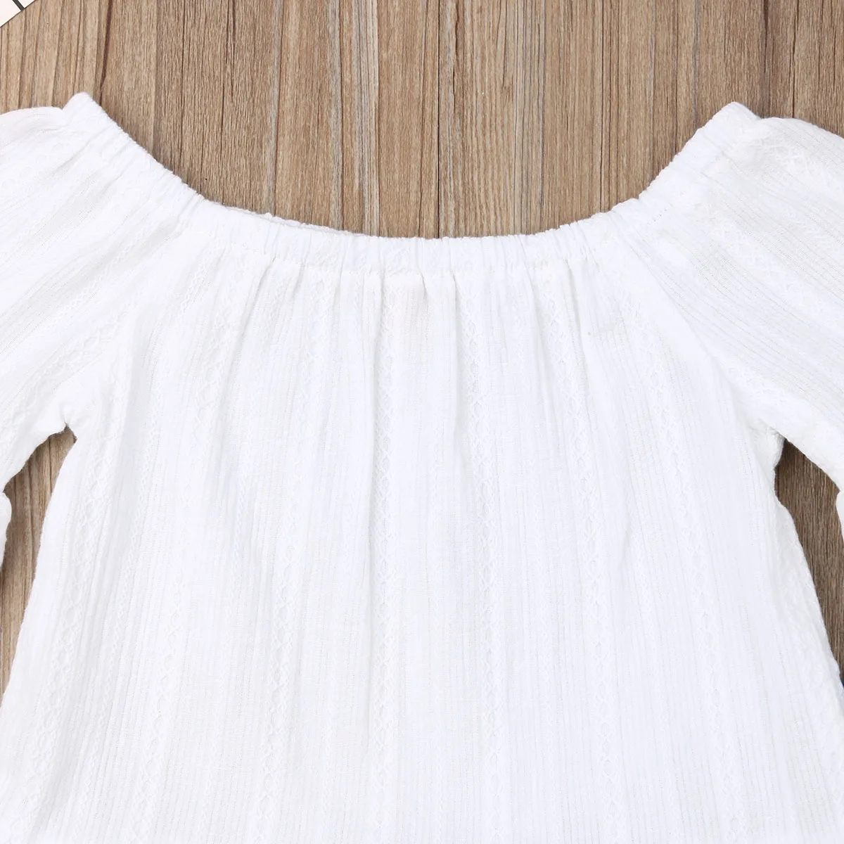 Comprar Conjunto de 2 piezas para bebé, camisa de manga con hombros descubiertos acampanada, pantalones vaqueros rasgados con perlas