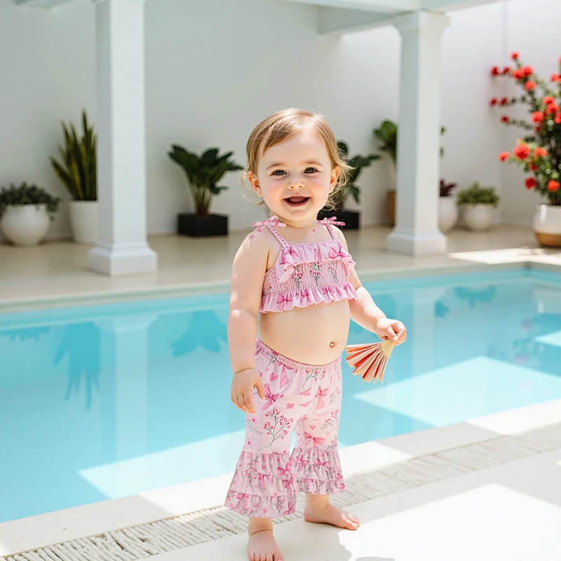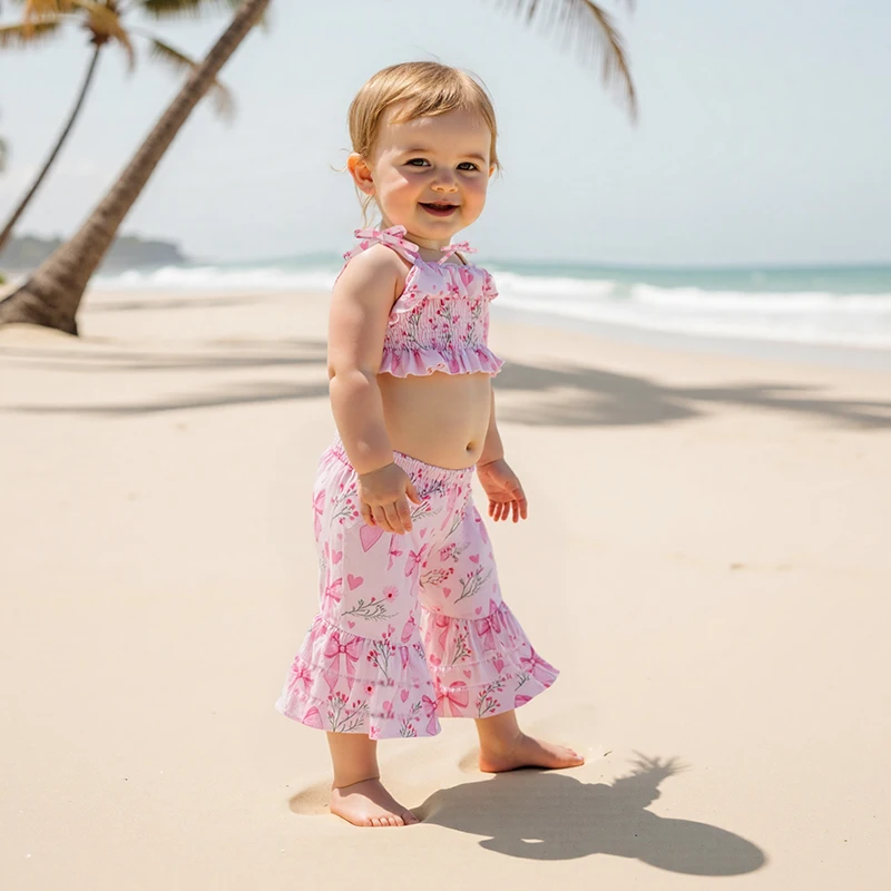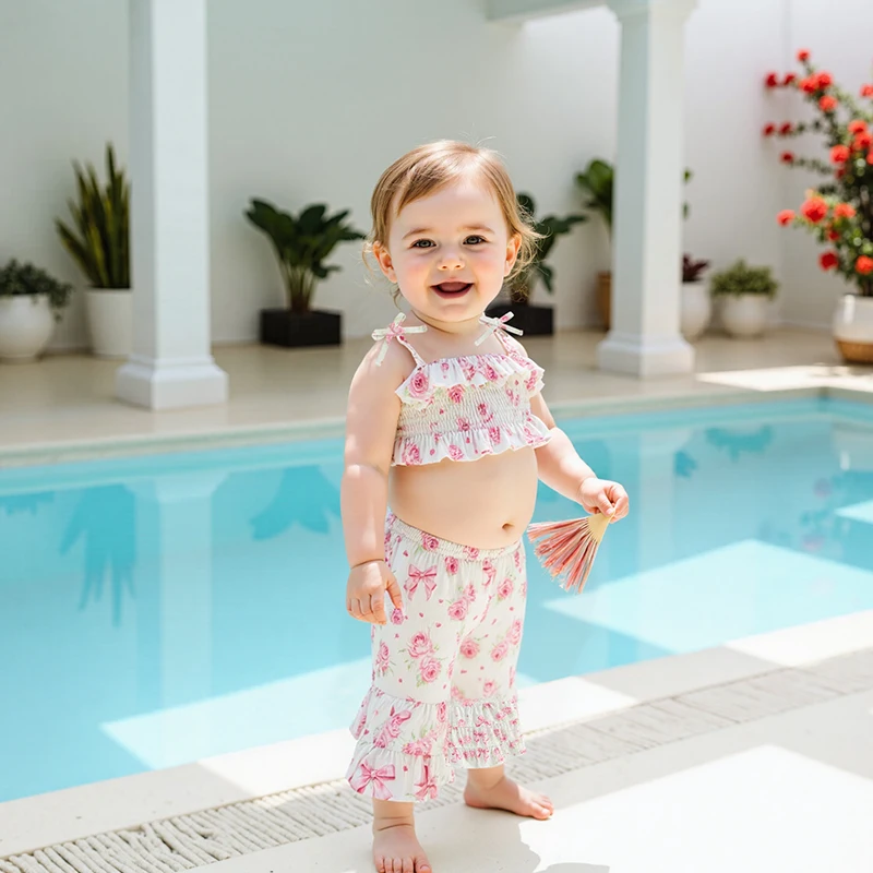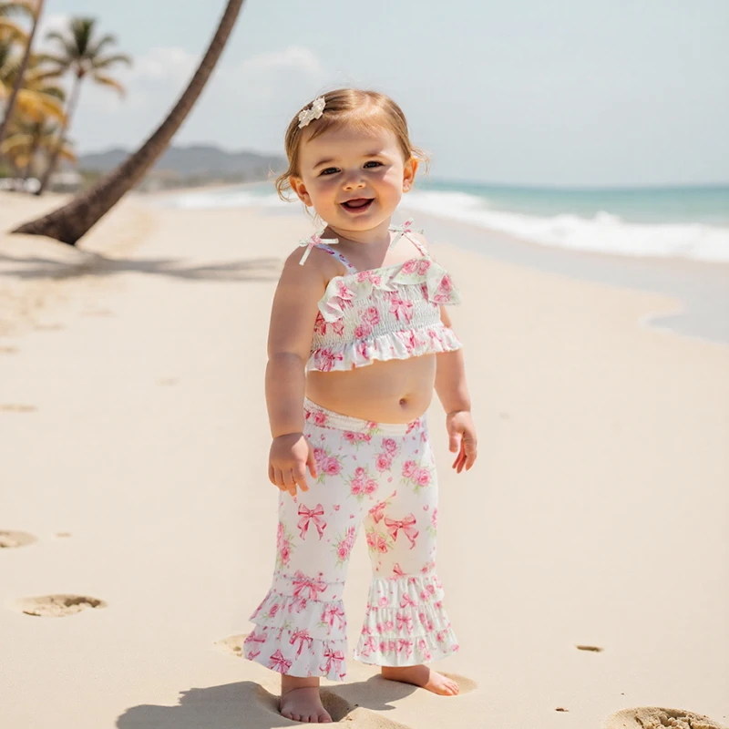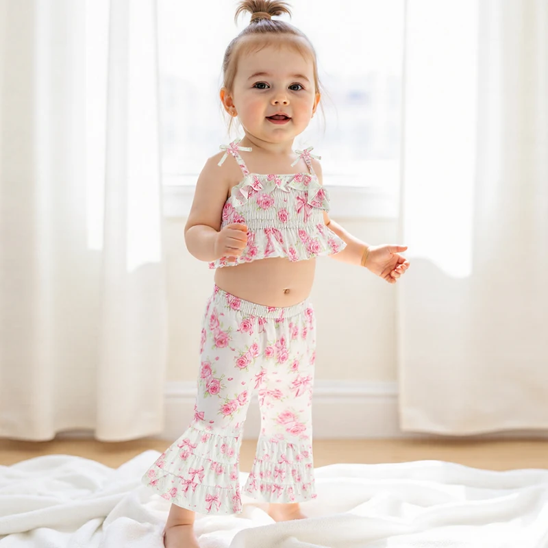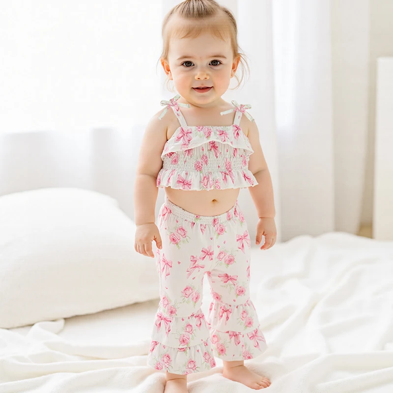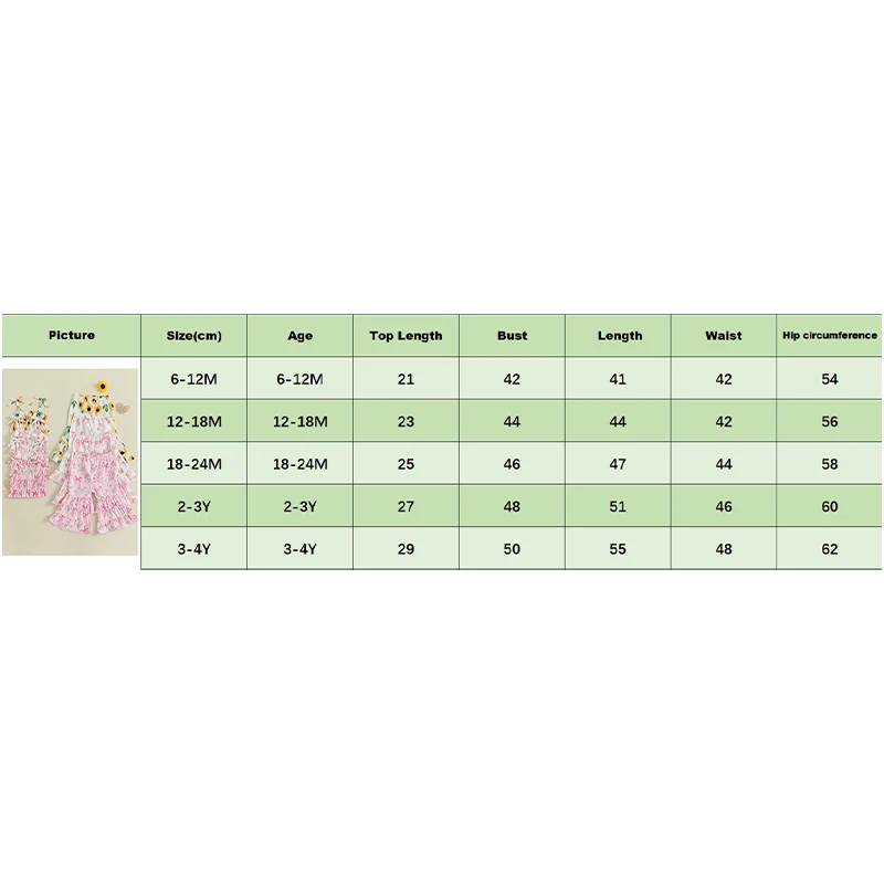 Conjunto de 2 piezas para niña pequeña, estampado de girasol/cereza, ribete con volantes, tirantes finos, Tops y parte inferior de campana