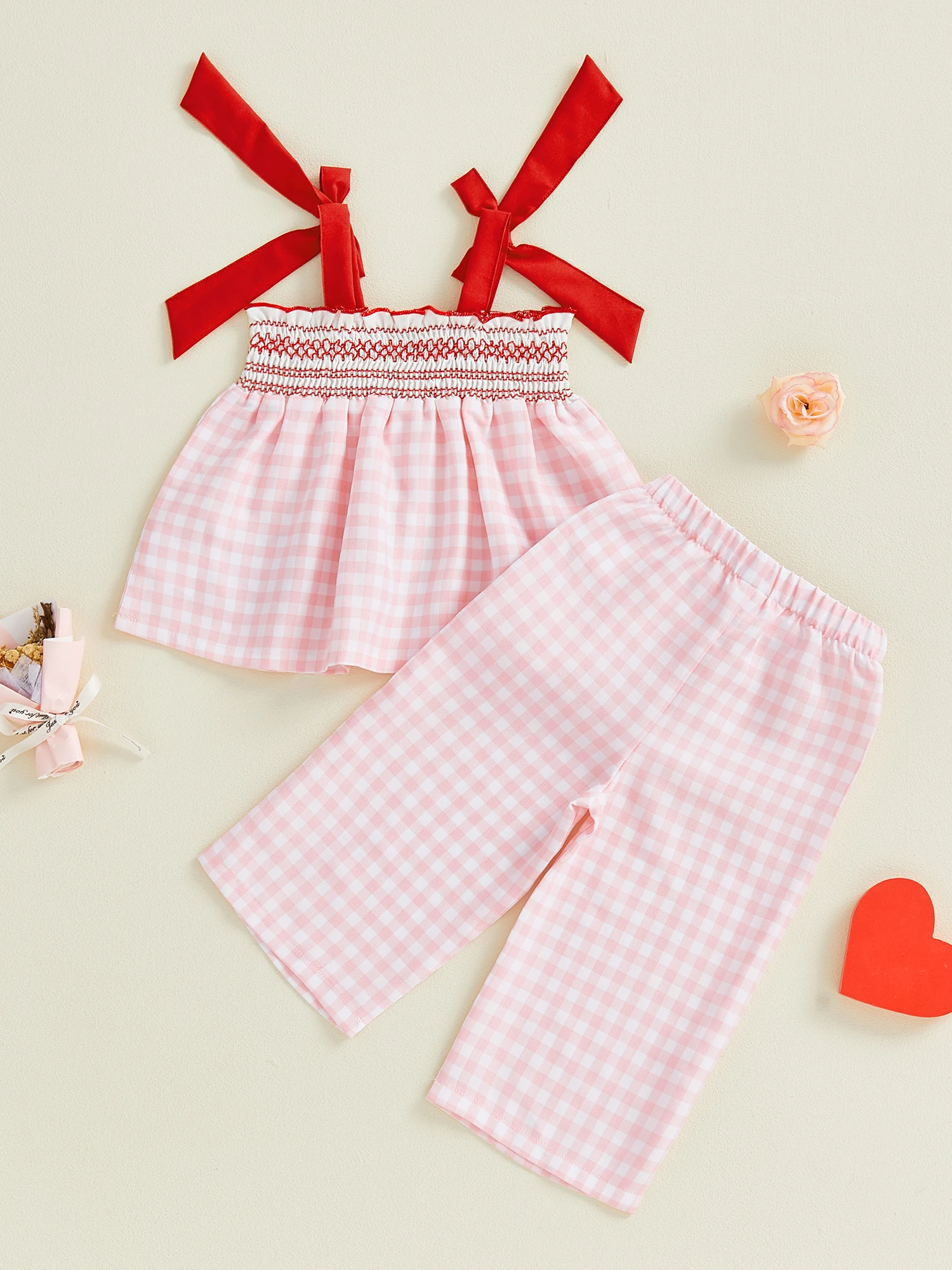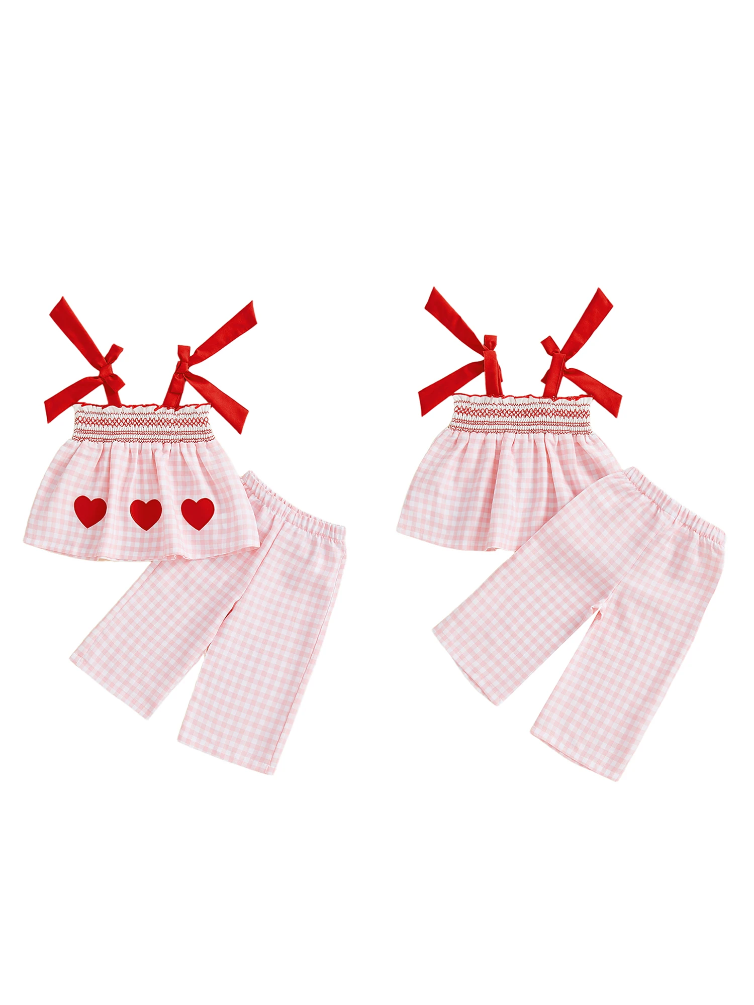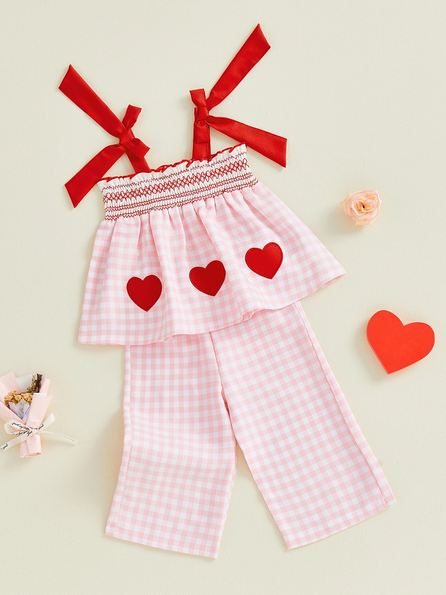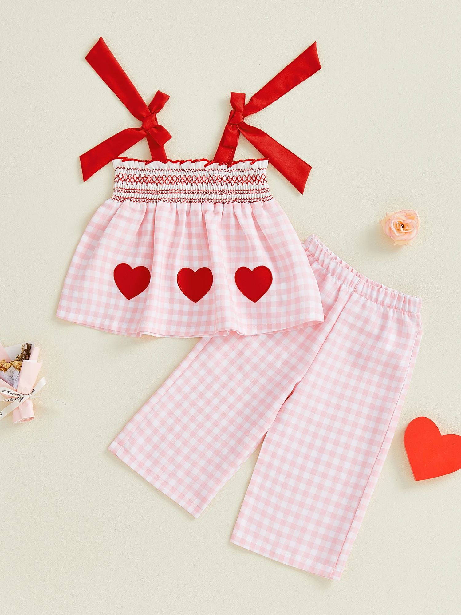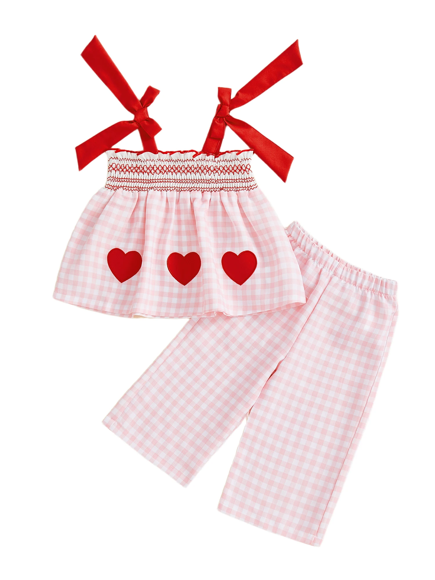 Conjunto de 2 piezas para bebé niña, traje de San Valentín a cuadros, parche de corazón de amor, bordado, lazo ahumado, Tops y pantalones