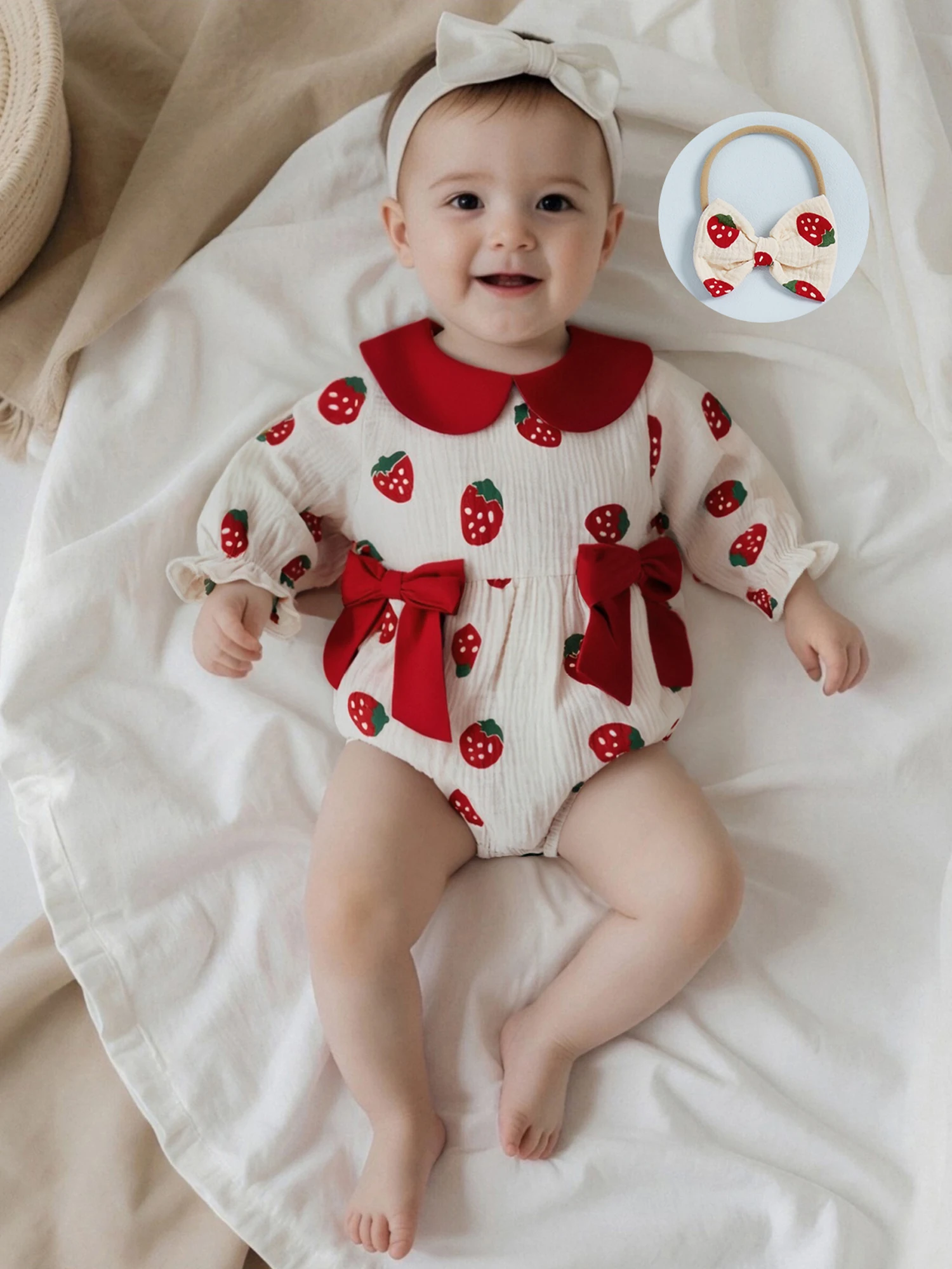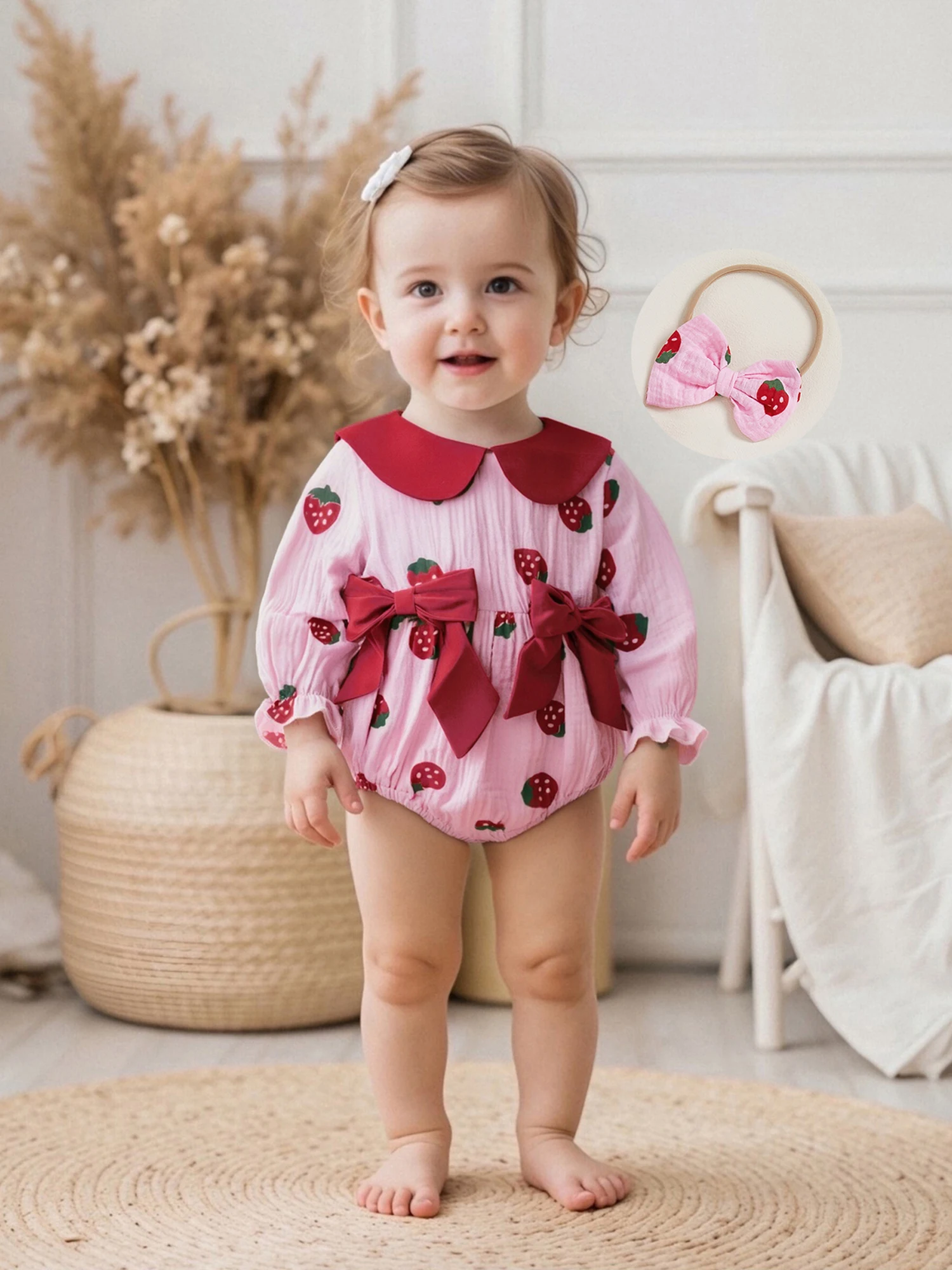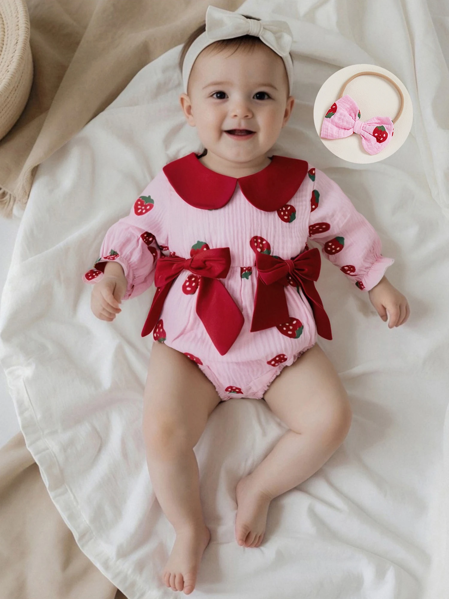 Conjunto de 2 piezas de traje de otoño para niña con cuello de muñeca de fresa/cereza/corazón, mameluco de manga larga, diadema con lazo - imagen 4