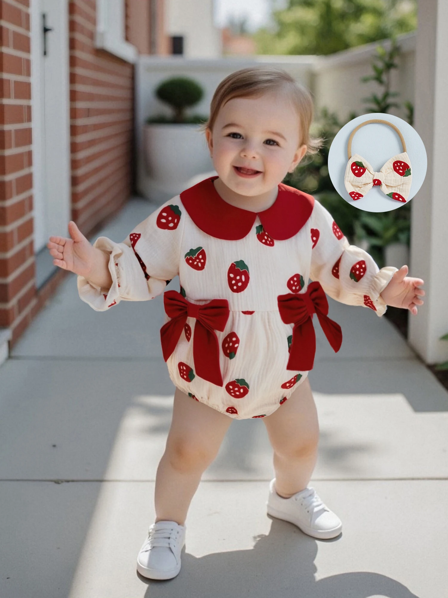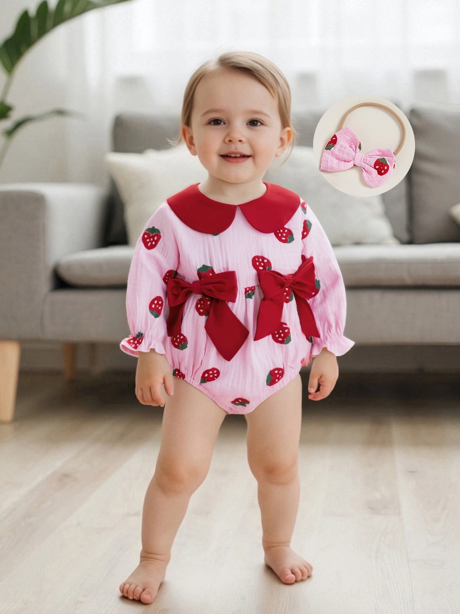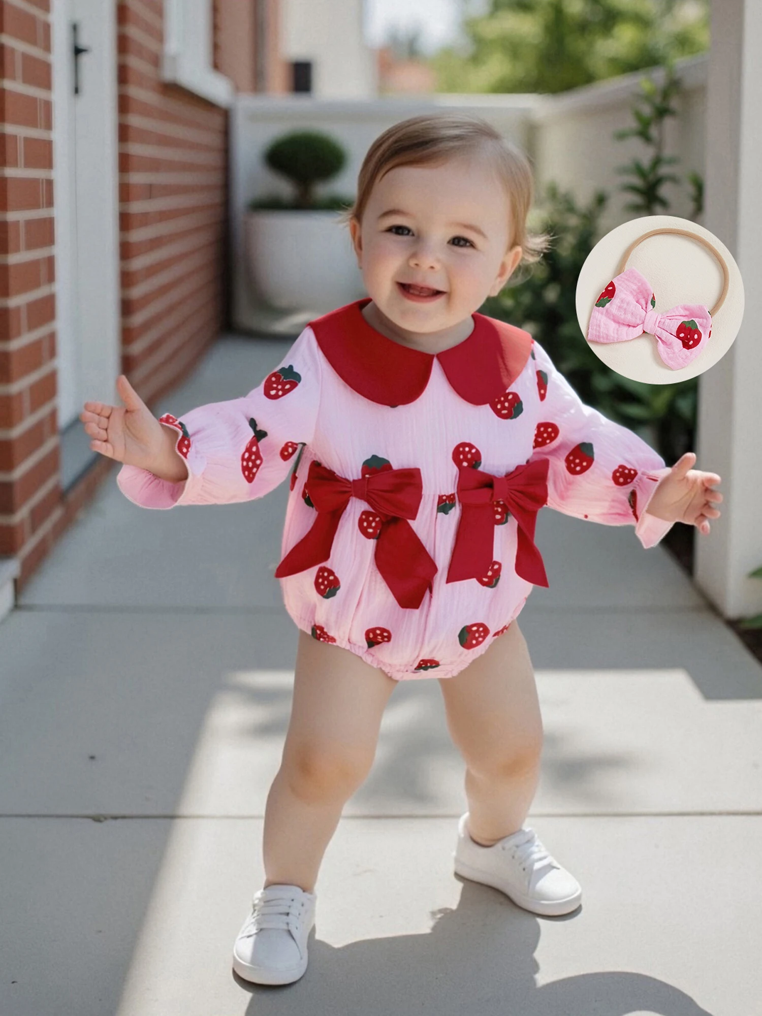 Conjunto de 2 piezas de traje de otoño para niña con cuello de muñeca de fresa/cereza/corazón, mameluco de manga larga, diadema con lazo - imagen 4