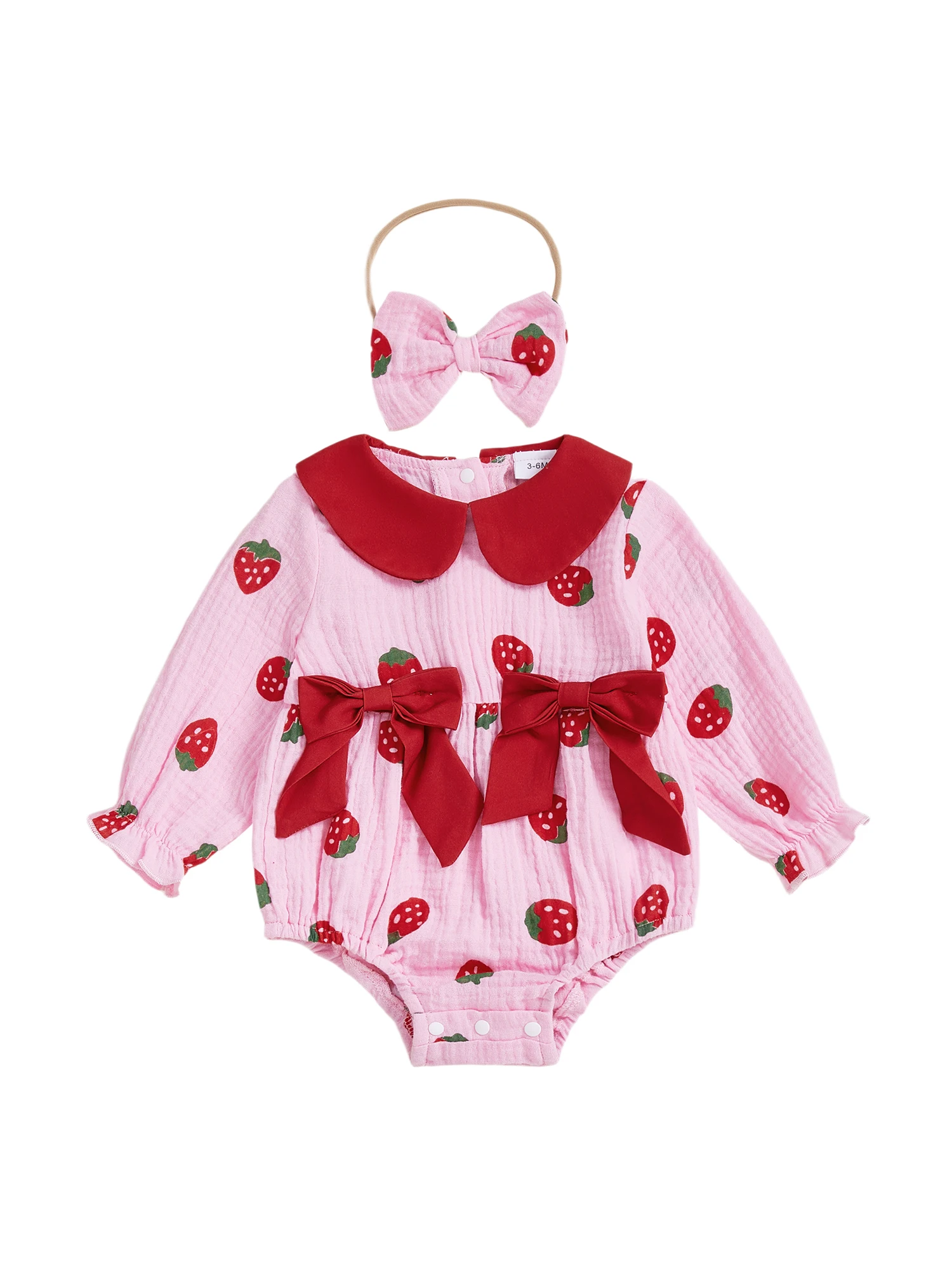Conjunto de 2 piezas para bebé niña, pelele de manga larga con cuello de muñeca de fresa/cereza/corazón, diadema con lazo