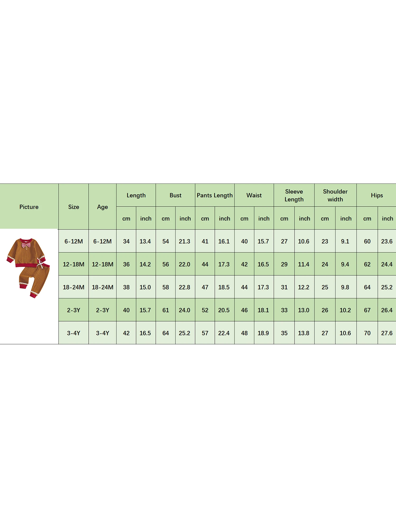 6-12M Longitud de la parte superior: 34 Busto: 54 Manga: 27 Hombro: 23 Longitud de los pantalones: 41 Cintura: 40 Cadera: 60 Edad recomendada: 6-12 meses