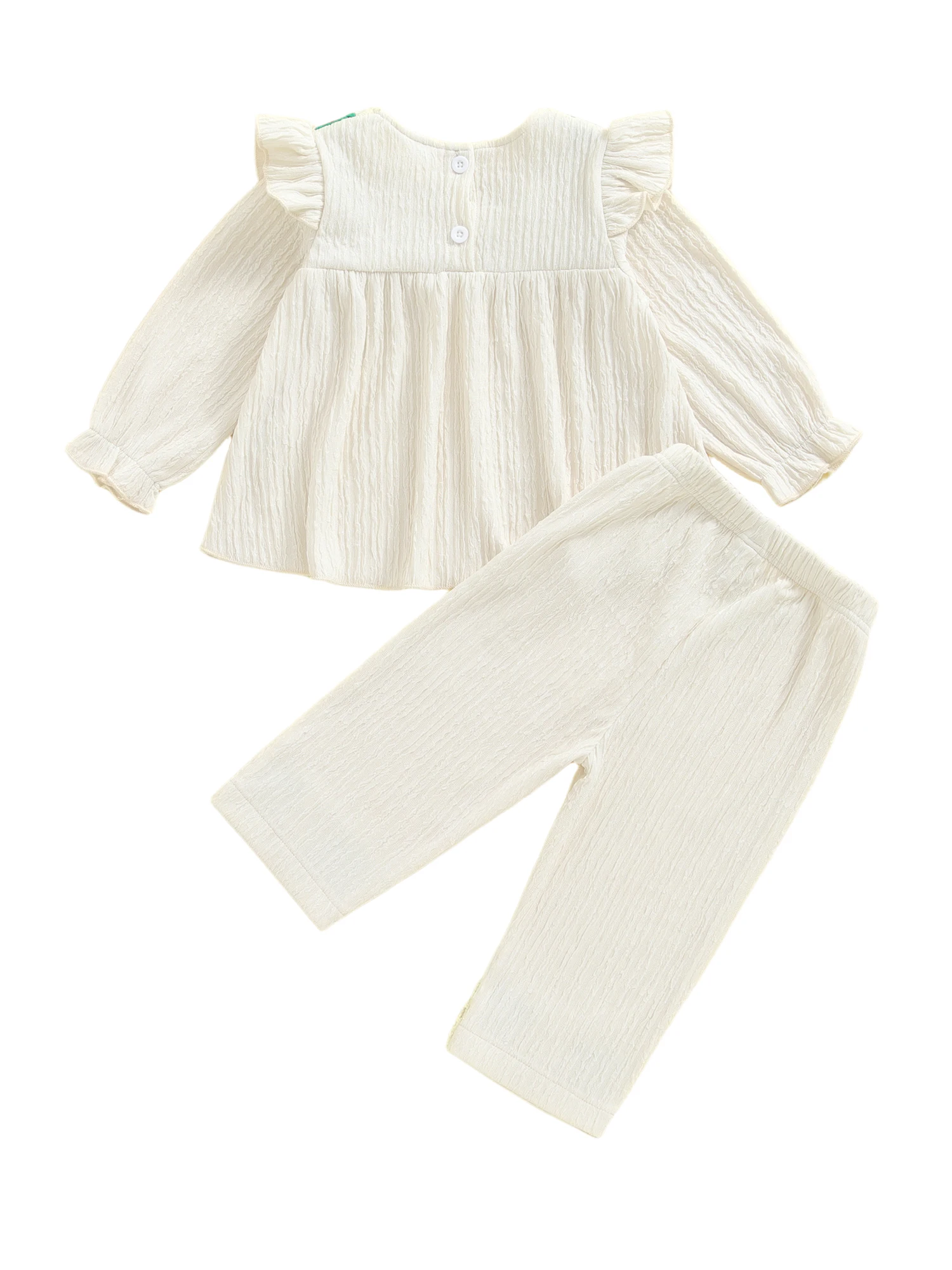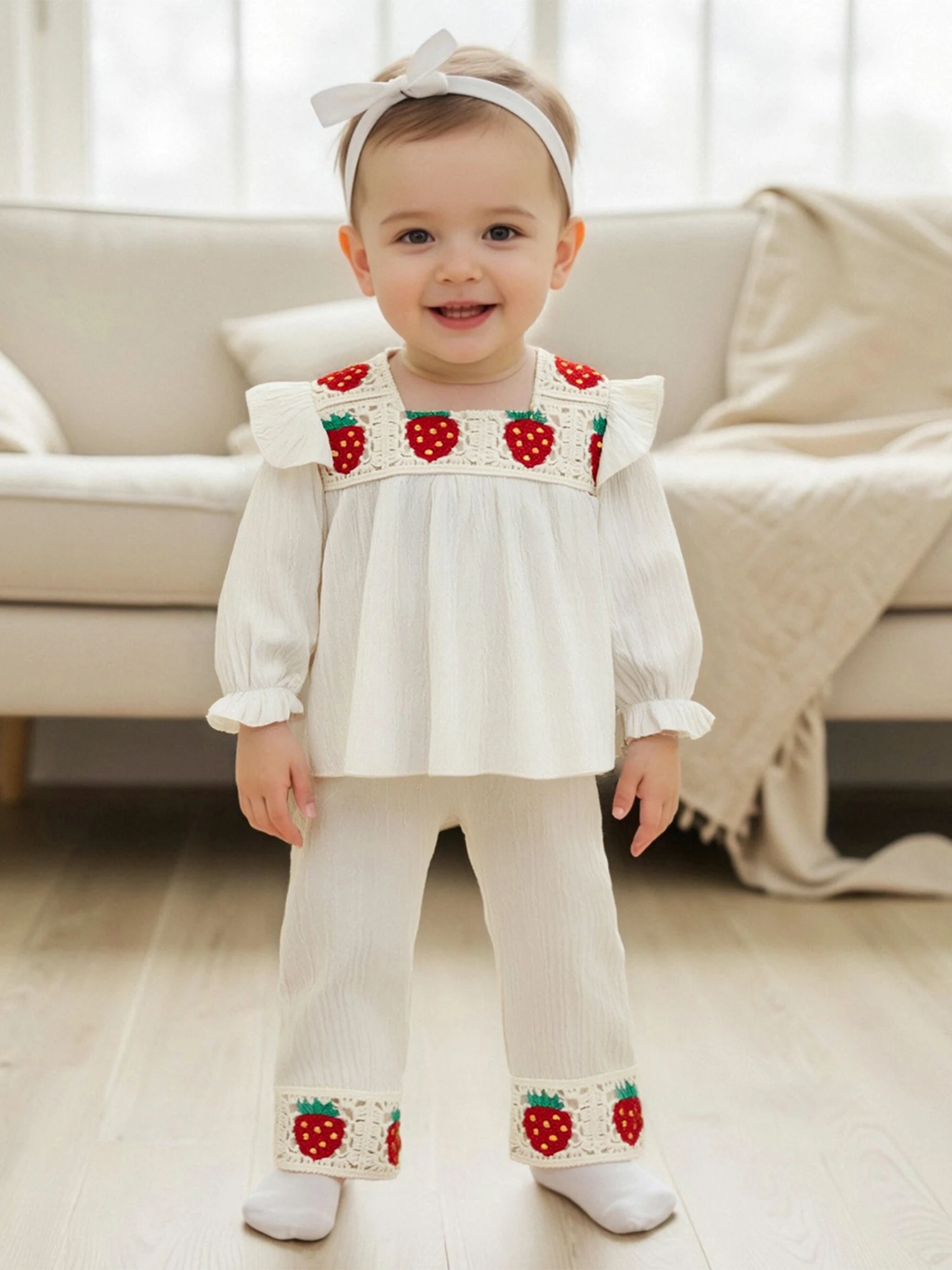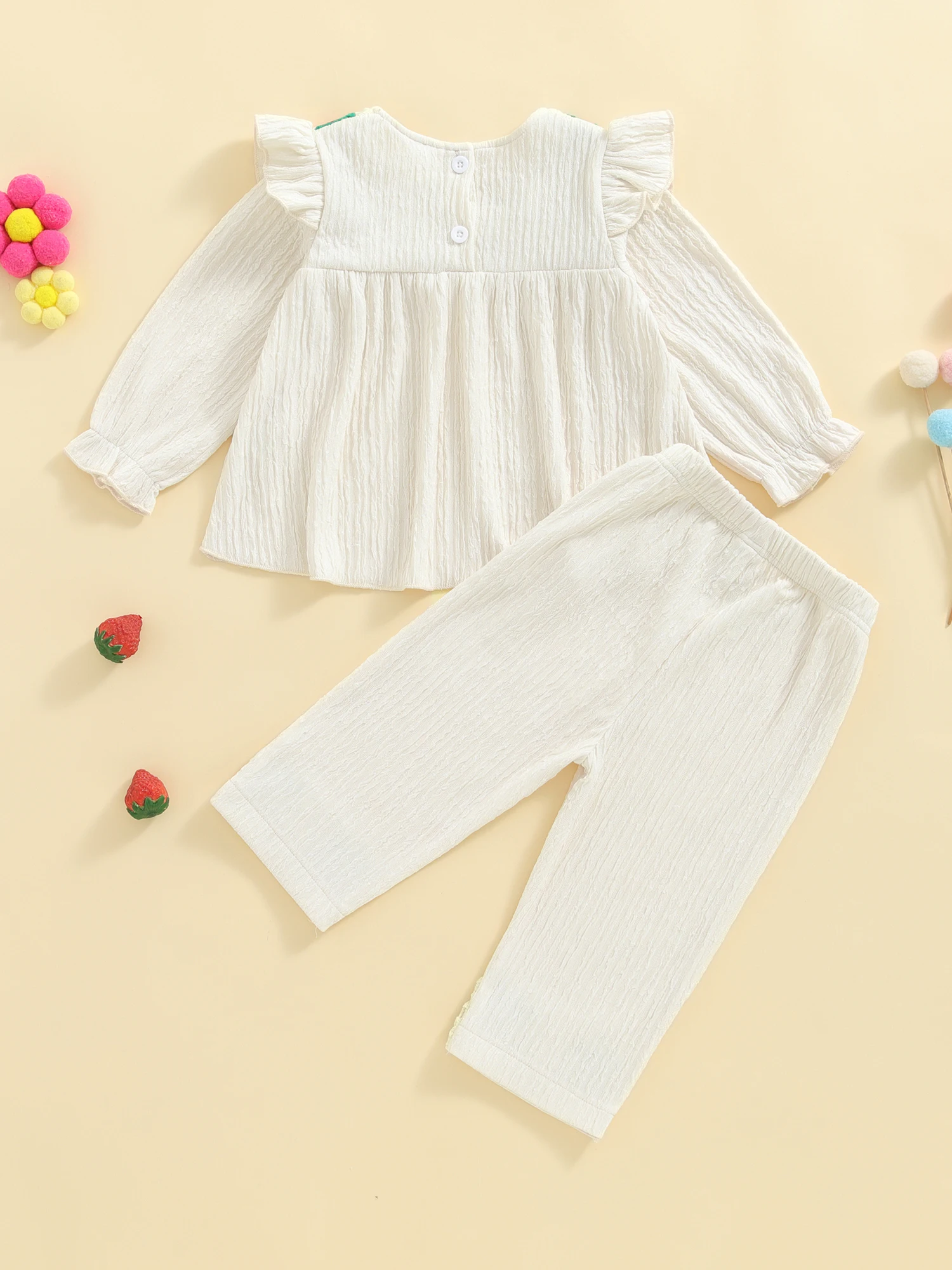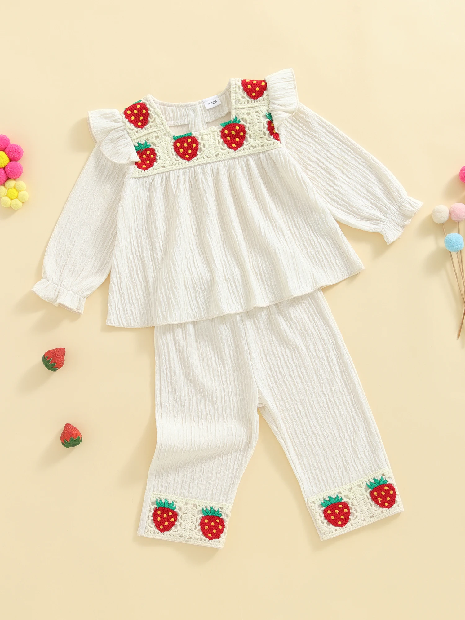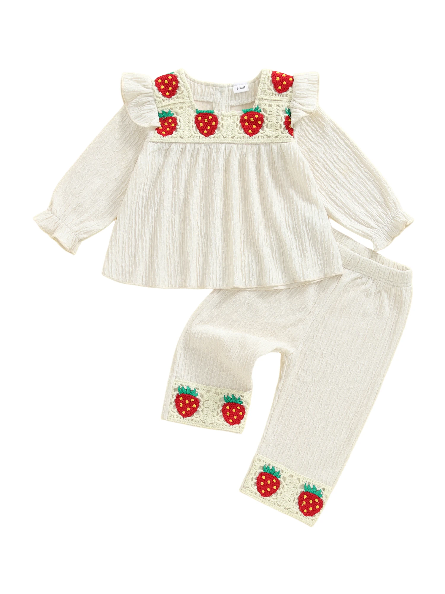 Conjunto de 2 piezas de trajes de otoño para niña, camisetas y pantalones con bordado de fresa de manga larga con volantes, ropa para niños pequeños