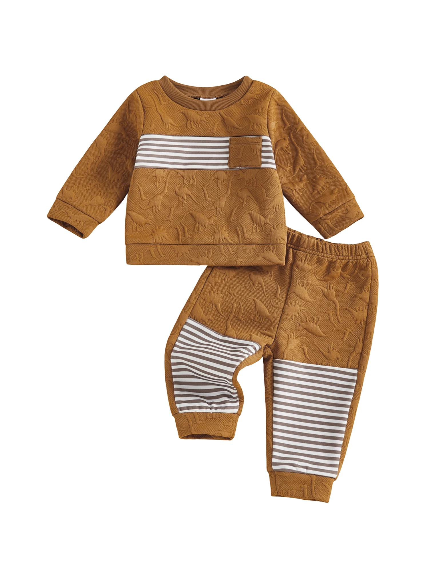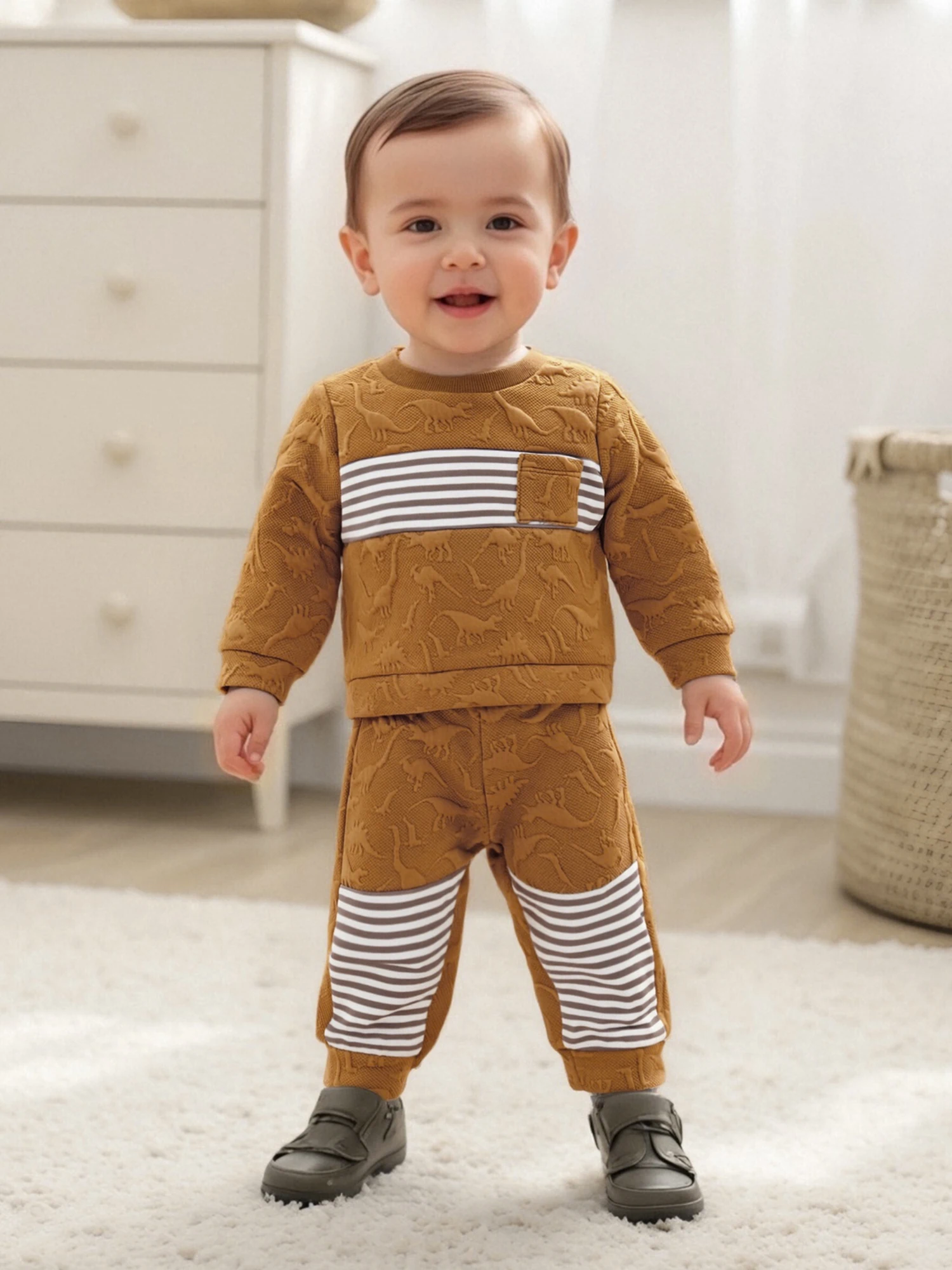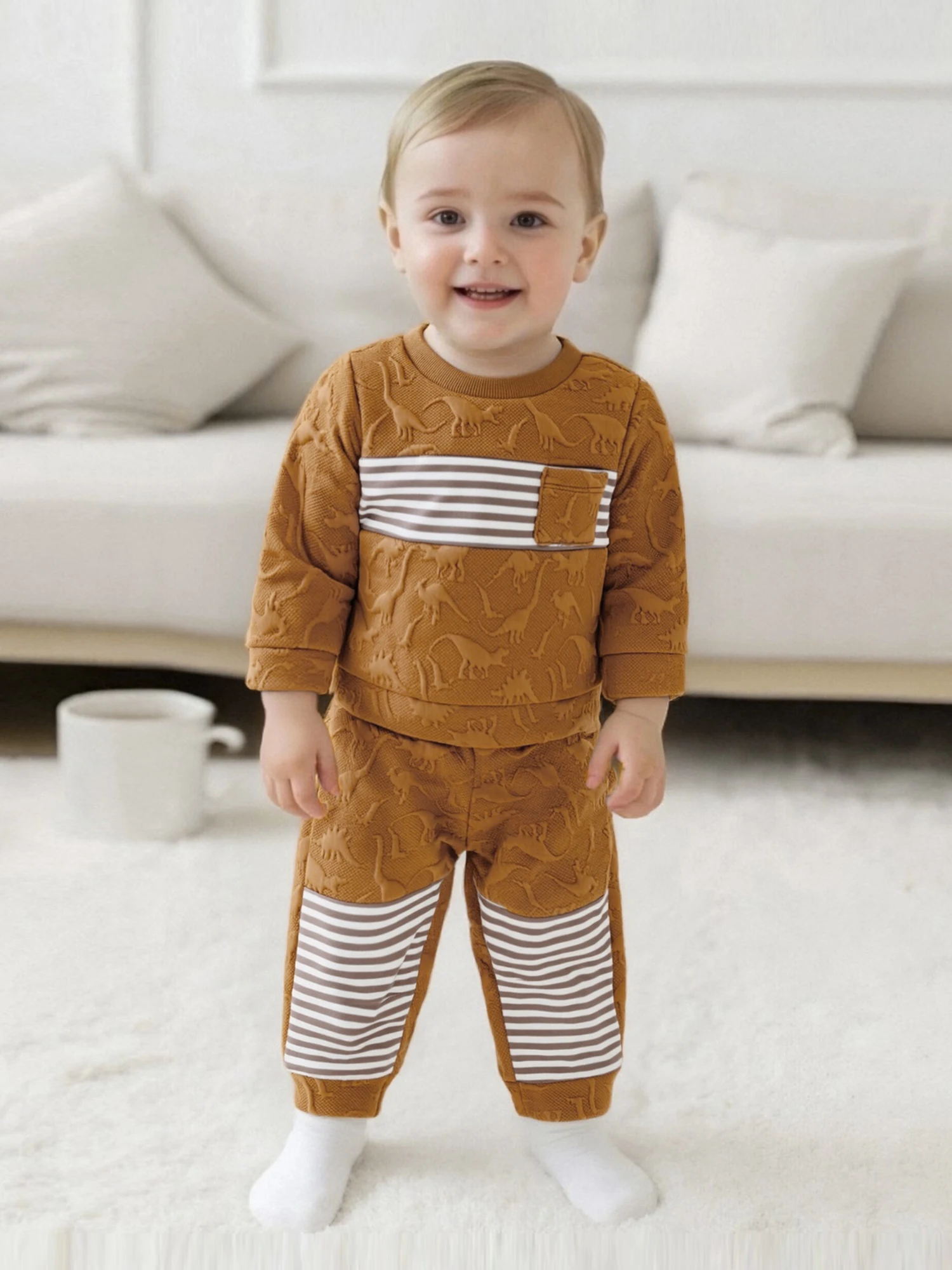 Conjunto de 2 piezas de trajes a rayas de otoño para niño pequeño de 0 a 3 años, jersey de cuello redondo de manga larga de Jacquard de dinosaurio + pantalones de cintura elástica